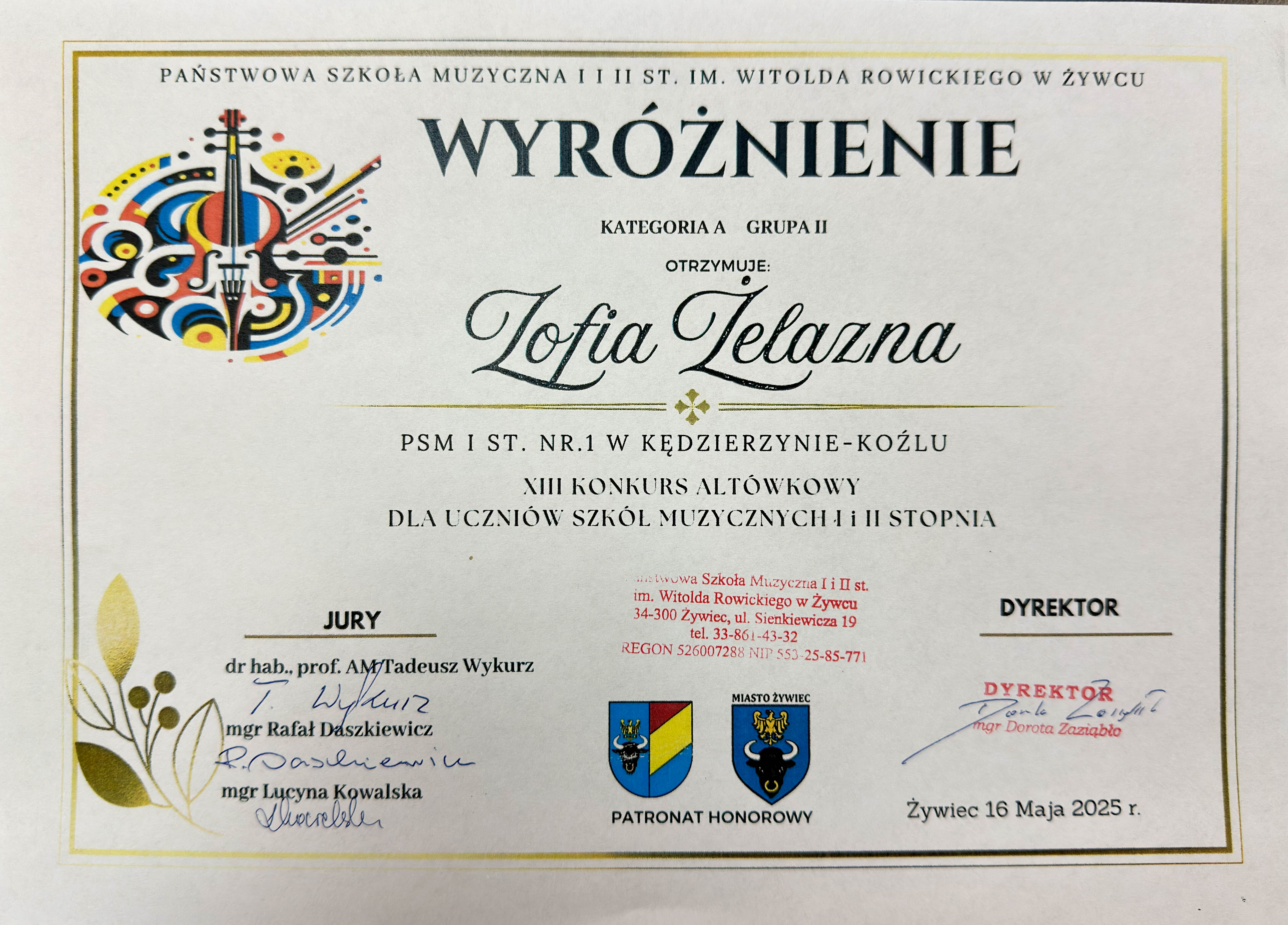 Z radością informujemy, że Zofia Żelazna uczennica Państwowej Szkoły Muzycznej I st. nr 1 w Kędzierzynie-Koźlu, z klasy altówki pana Lecha Słoty zdobyła wyróżnienie w prestiżowym XIII Konkursie Altówkowym w Żywcu
