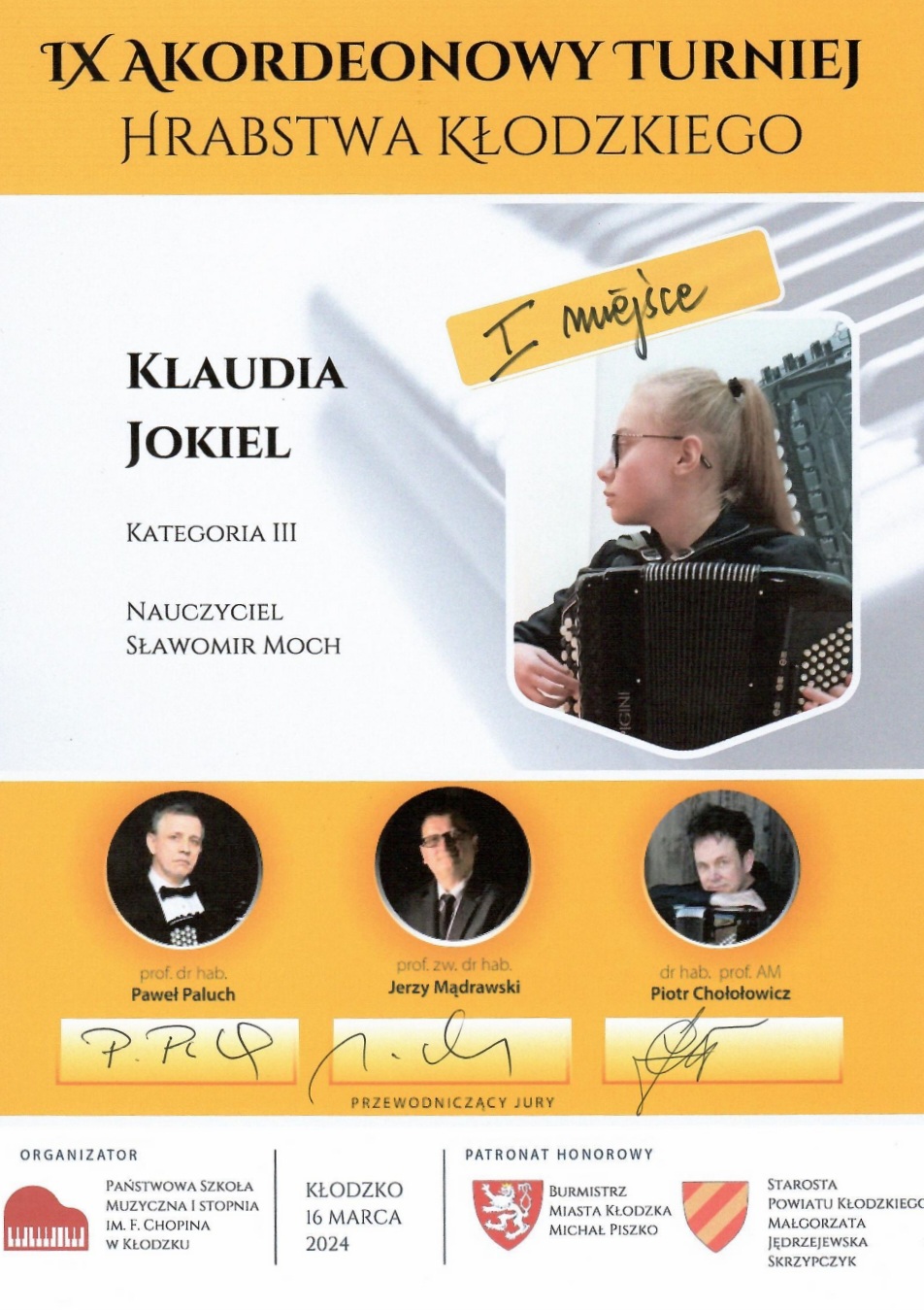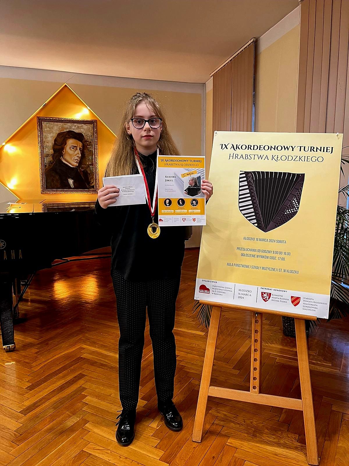 W dniu 16 marca 2024 r. Klaudia Jokiel, uczennica klasy akordeonu p. Sławomira Mocha wzięła udział w IX Akordeonowym Turnieju Hrabstwa Kłodzkiego i zajęła I miejsce. Serdecznie gratulujemy!