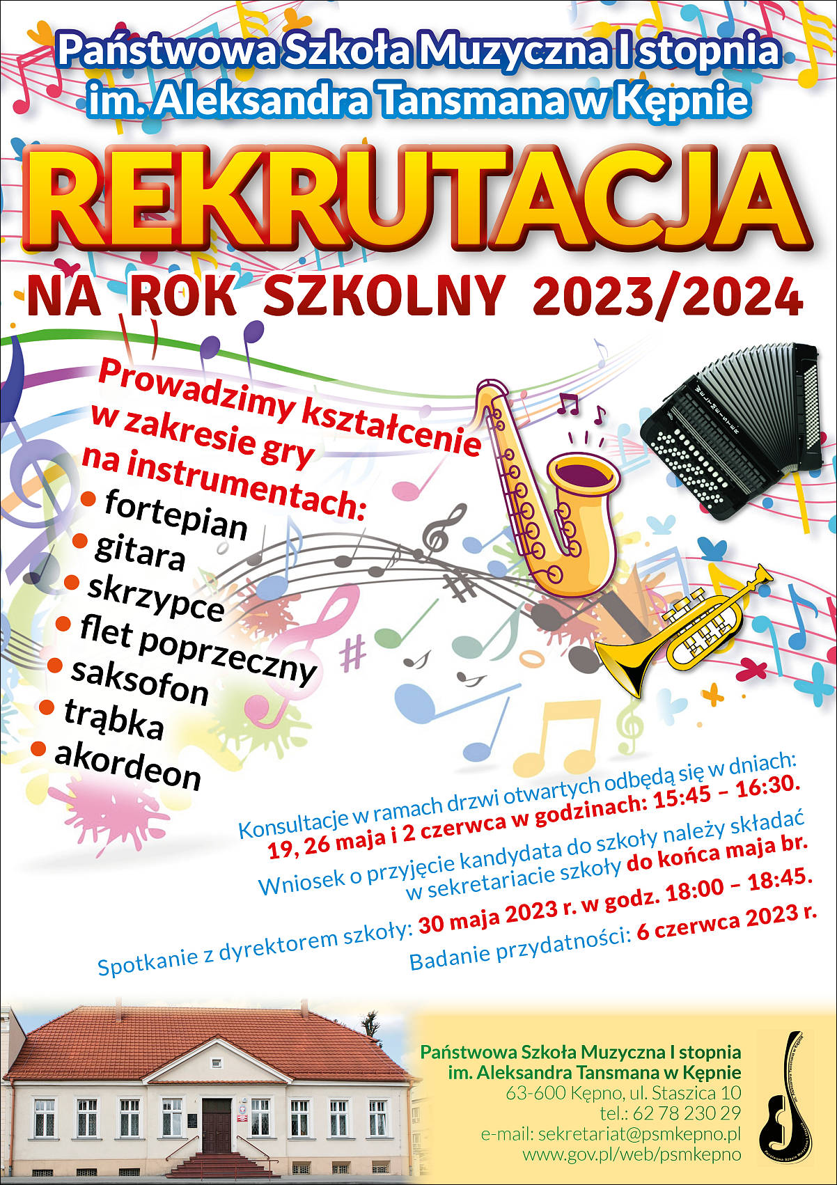 Tłem plakatu są kolorowe nuty i znaki muzyczne. Plakat zawiera informacje związane z naborem do szkoły na nowy rok szkolny, w tym nazwę szkoły, napis „rekrutacja na rok szkolny 2023/2024”, ofertę edukacyjną (instrumenty, na których można nauczyć się grać), terminy dotyczące: drzwi otwartych, składania wniosku, spotkania z dyrektorem oraz badania przydatności. Na środku plakatu po prawej stronie wstawiona jest grafika instrumentów: saksofonu, trąbki i akordeonu. W lewym dolnym rogu znajduje się zdjęcie szkoły, w prawym (na żółtym tle) dane teleadresowe i logo szkoły.