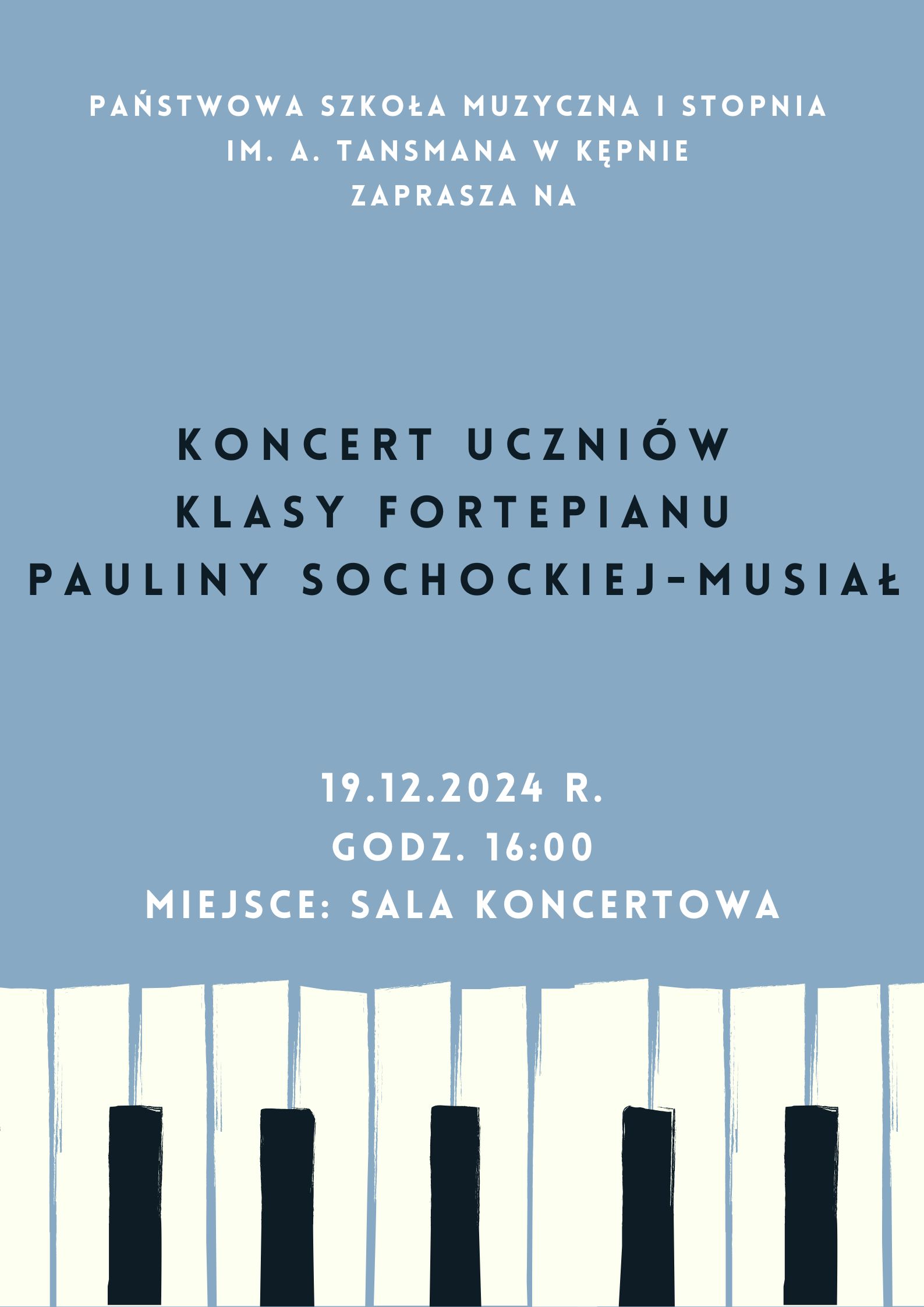 Plakat na jasnoniebieskim tle z napisami w kolorze białym i czarnym. U góry wstawiona jest nazwa szkoły, poniżej nazwa wydarzenia i nauczyciel, jeszcze niżej szczegóły dotyczące wydarzenia, jak data, godzina i miejsce. Całość dopełnia grafika przedstawiająca fragment klawiatury fortepianu z biało-czarnymi klawiszami, wstawiona na dole na całej szerokości plakatu.
