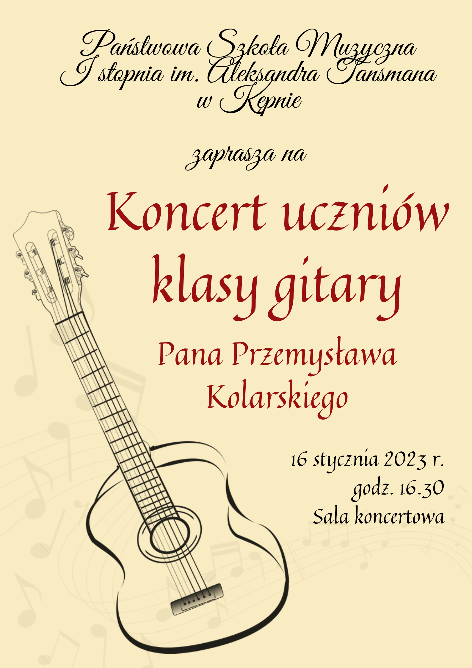 Plakat przedstawia grafikę na beżowym tle. Z lewej strony znajduje się rysunek gitary. Resztę plakatu zajmują informacje o wydarzeniu. Od góry zapisana jest nazwa szkoły. Na środku znajduje się nazwa koncertu w kolorze czerwonym "Koncert uczniów klasy gitary Pana Przemysława Kolarskiego". W prawym dolnym rogu napisane są pozostałe informacje dotyczące daty, godziny i miejsca koncertu.
