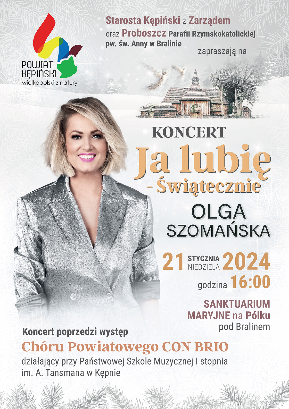 Na białym i jasnoszarym tle od góry po lewej znajduje się logo powiatu kępińskiego, z prawej namalowany jest drewniany kościółek. Poniżej po lewej wstawione jest zdjęcie Olgi Szomańskiej, a sprawej zamieszczony jest tytuł koncertu, a pod nim pozostałe informacje o wydarzeniu.