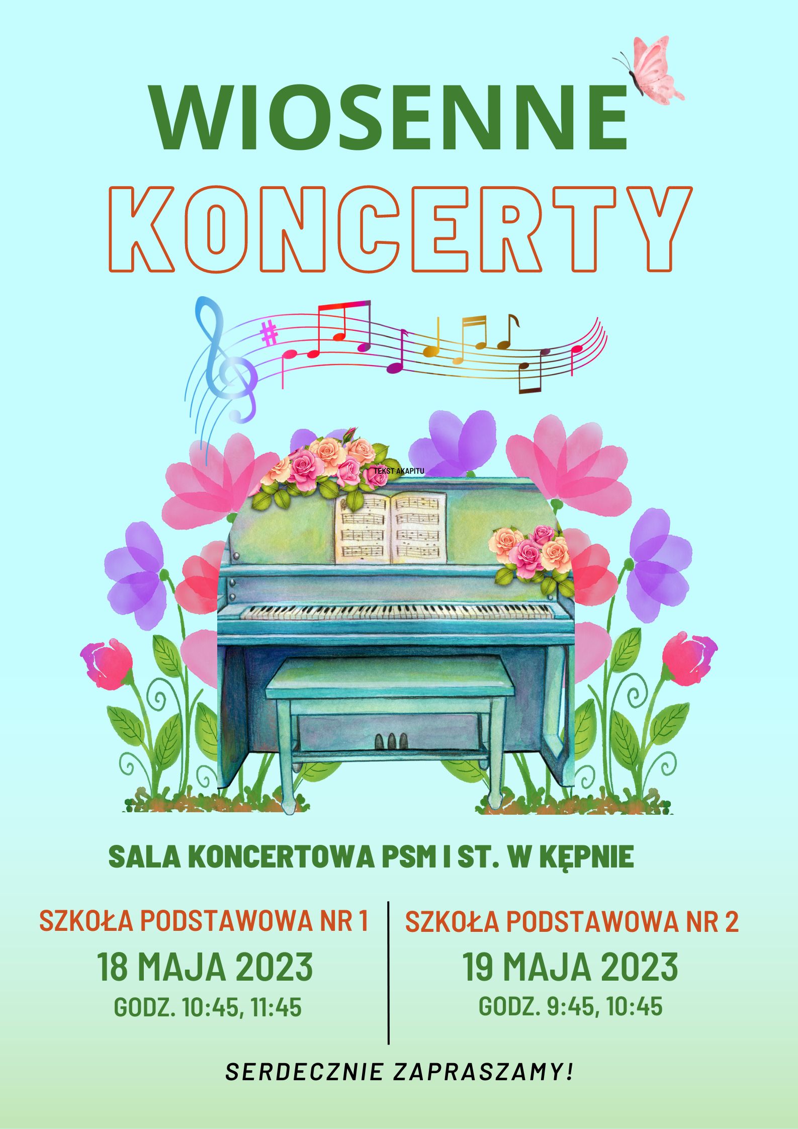 Na jasnoniebieskim tle od góry napis wielkimi i pogrubionymi literami: wiosenny koncert (wiosenny w kolorze zielonym, koncert - kontur czerwony, wypełnienie w kolorze tła). Poniżej kolorowa grafika przedstawiająca klucz wiolinowy i zakręconą pięciolinię z nutkami. Jeszcze niżej grafika przedstawiająca rysunek niebieskiego pianina wśród różowych i fioletowych kwiatów z zielonymi łodyżkami i liśćmi. Na dole zamieszczone zostały informacje o wydarzeniach – dwóch koncertach dla szkół podstawowych: sala koncertowa PSM I st. w Kępnie, Szkoła Podstawowa Nr 1, 18 maja 2023, Szkoła Podstawowa Nr 2, 19 maja 2023. Informacje dla obu szkół oddzielone zostały pionową kreską. Nazwy szkół w kolorze czerwonym, pozostałe napisy w kolorze zielonym.