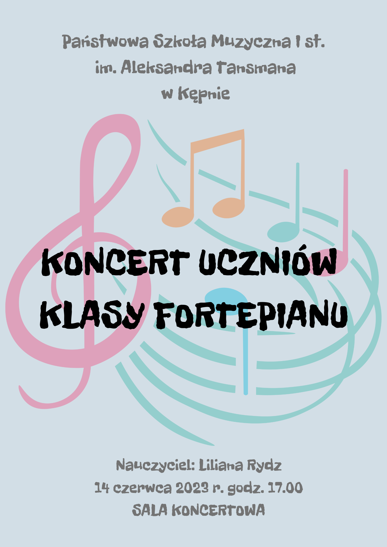 Na jasnoniebieskim tle na środku kolorowa grafika przedstawiająca klucz wiolinowy i zakręconą pięciolinię z nutkami, na grafice napis w czarnym kolorze koncert uczniów klasy fortepianu. Na samej górze nazwa szkoły, a na dole informacje o wydarzeniu: nauczyciel: Liliana Rydz, 14 czerwca 2023 r. godz. 17.00, sala koncertowa.