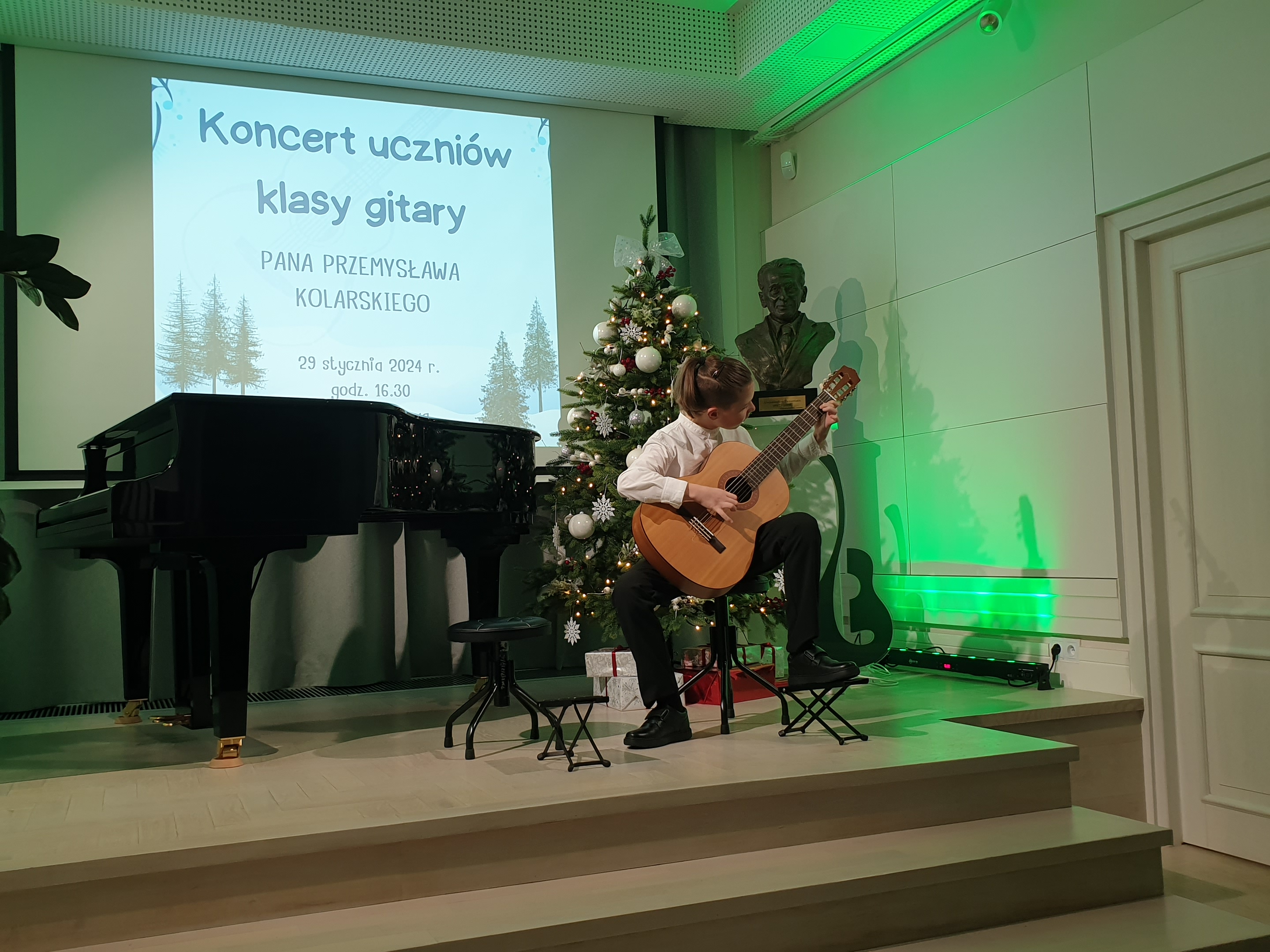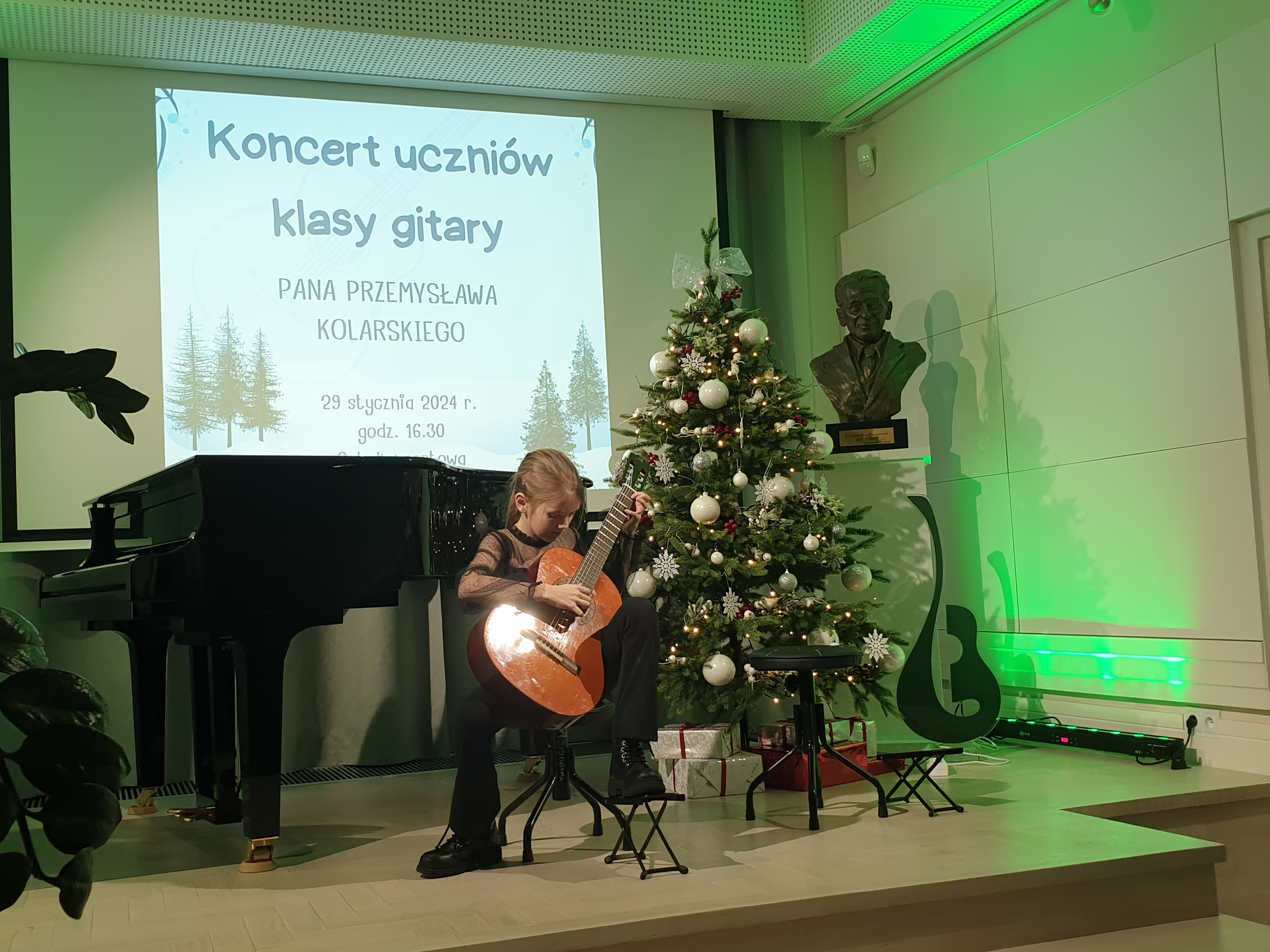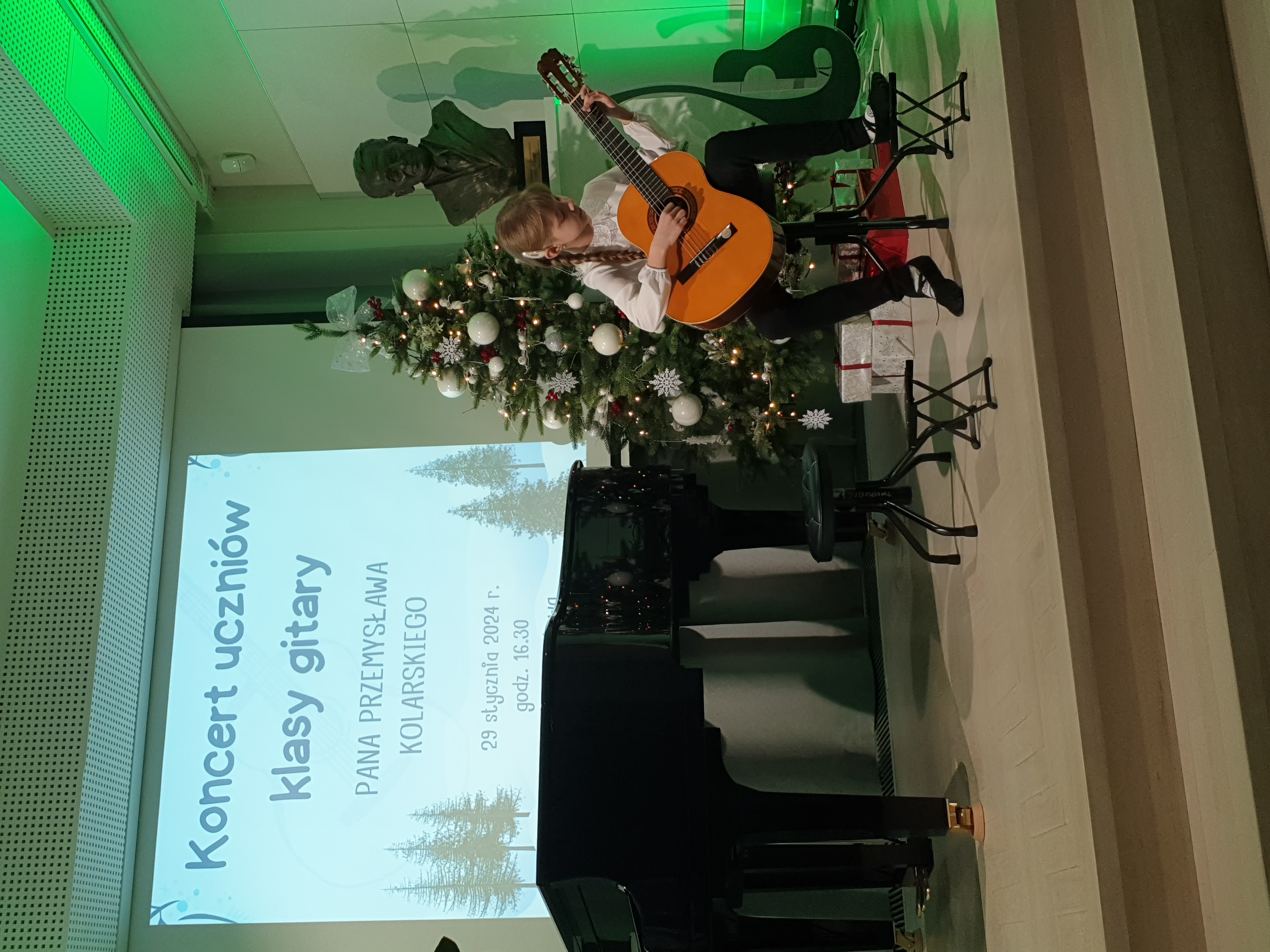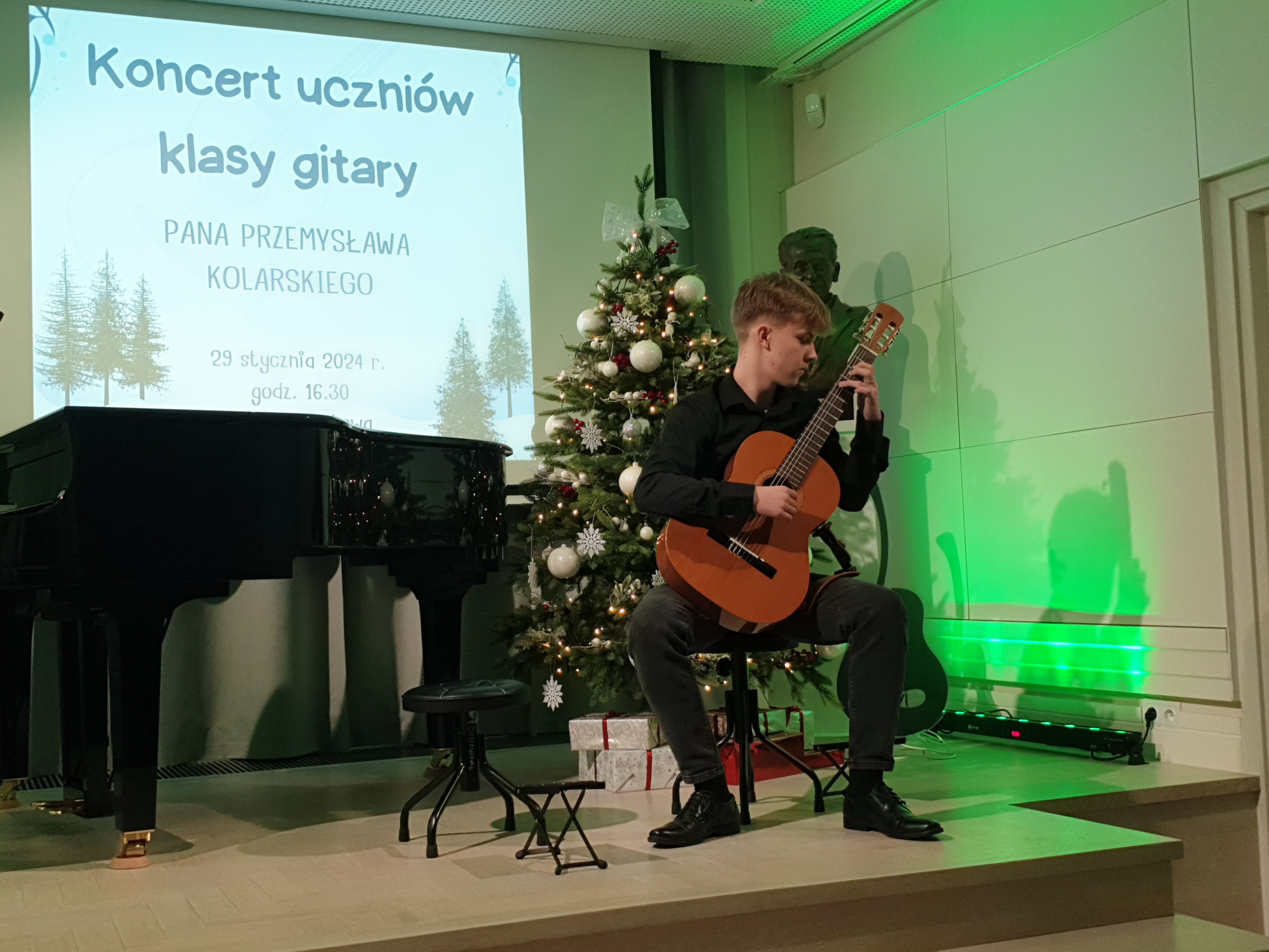 29 stycznia 2024 r. w naszej szkole odbył się koncert klasy gitary p. Przemysława Kolarskiego. Licznie zgromadzona publiczność mogła wysłuchać kolęd, utworów świątecznych, klasycznych i rozrywkowych.