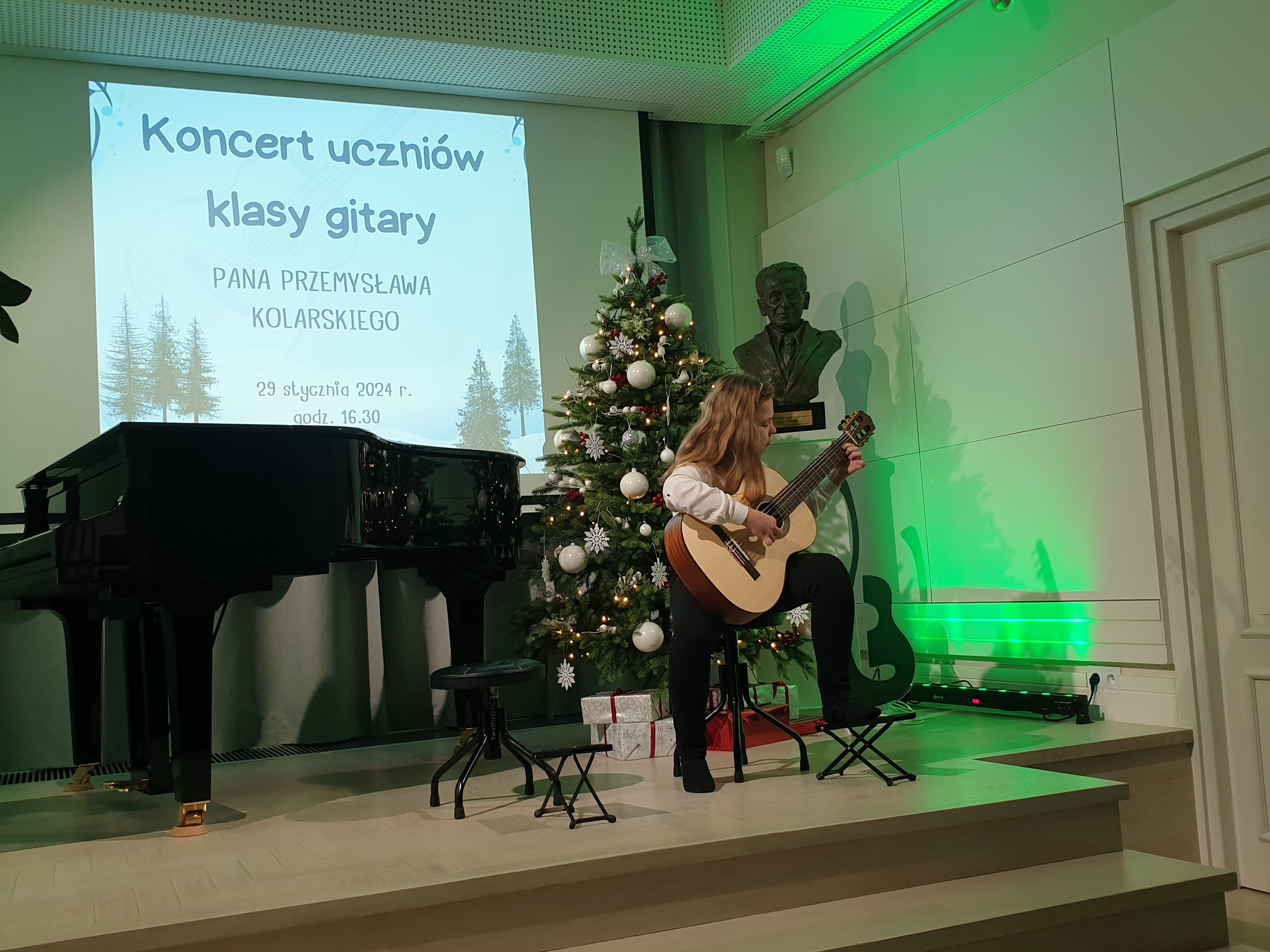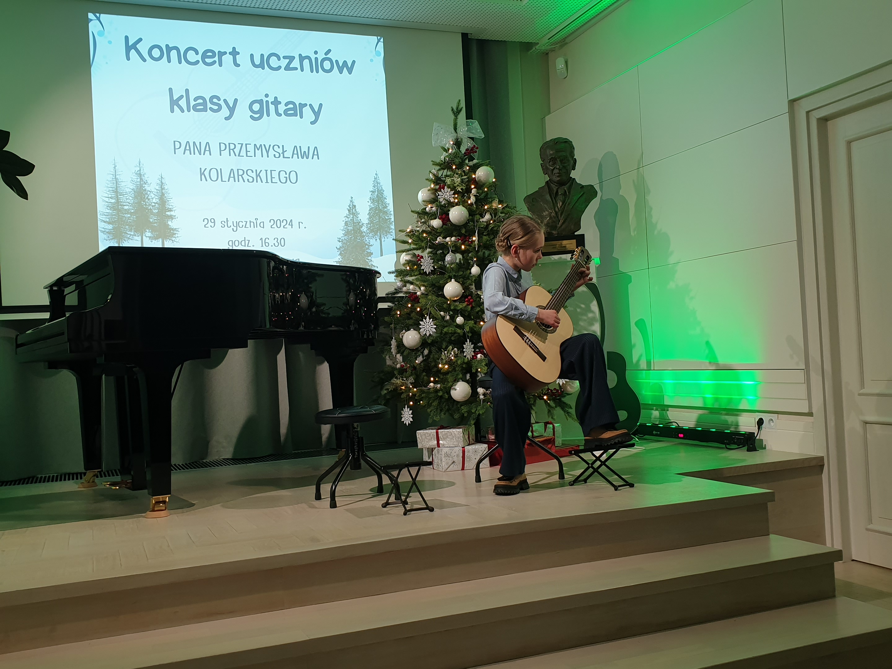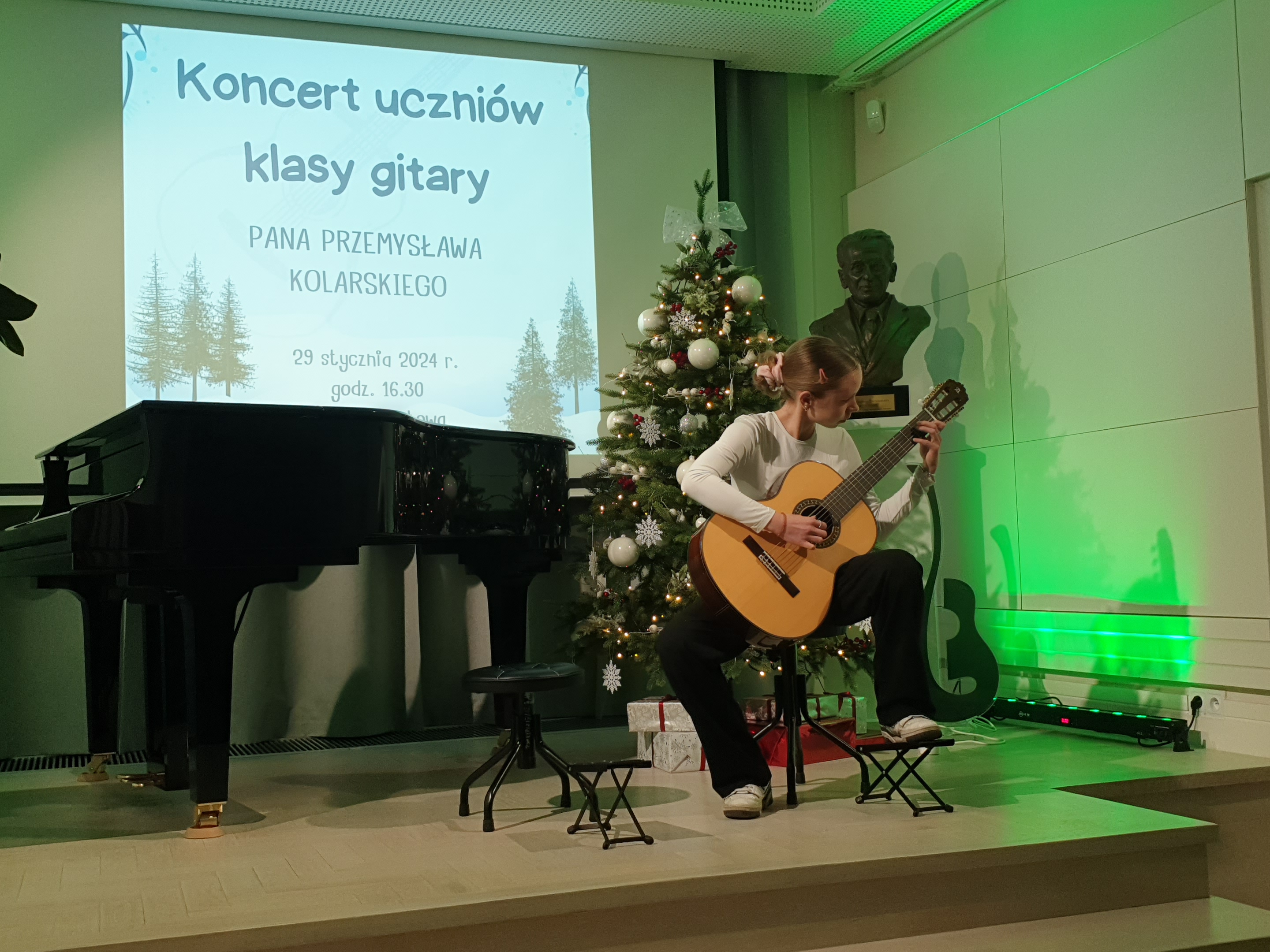 29 stycznia 2024 r. w naszej szkole odbył się koncert klasy gitary p. Przemysława Kolarskiego. Licznie zgromadzona publiczność mogła wysłuchać kolęd, utworów świątecznych, klasycznych i rozrywkowych.