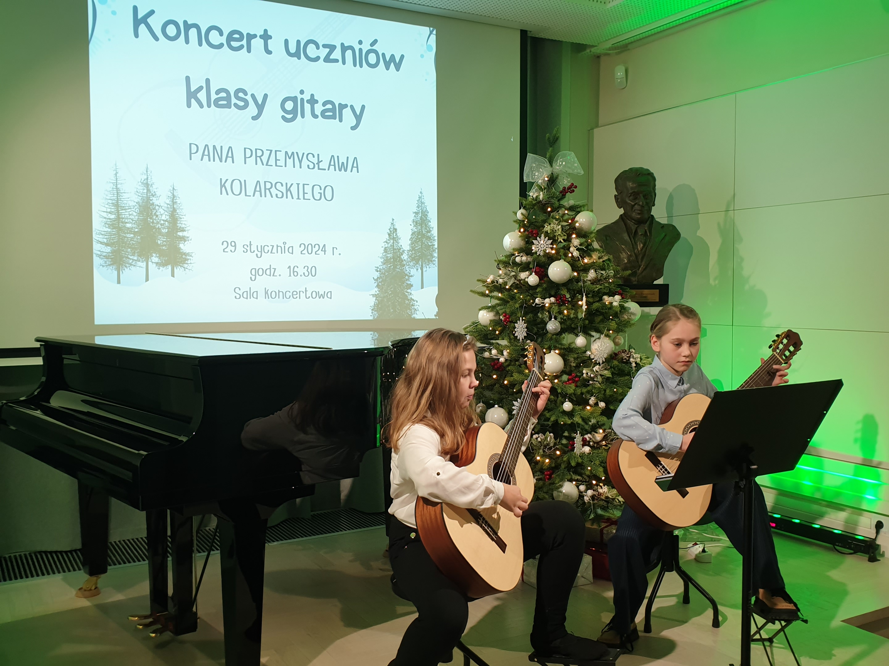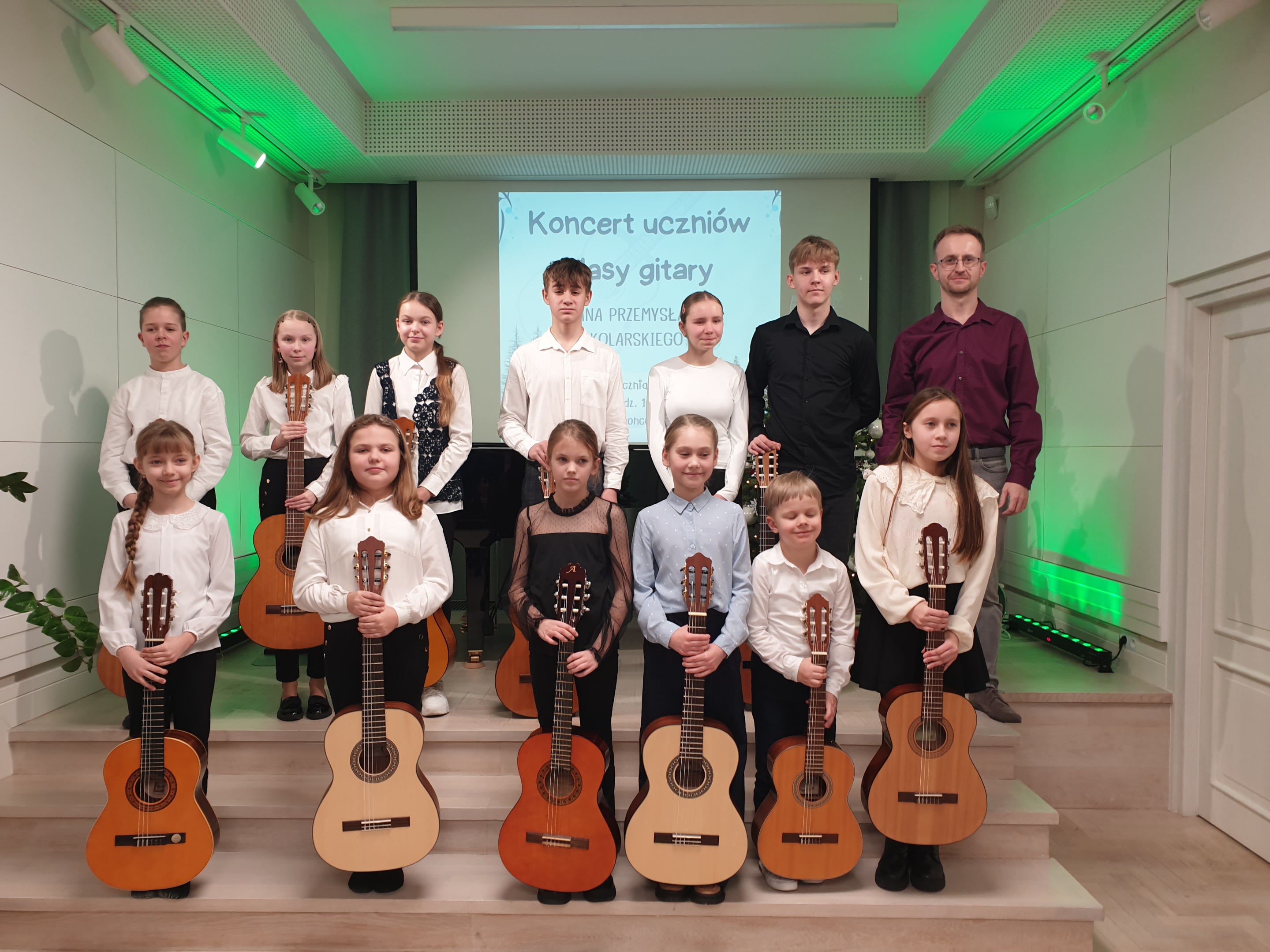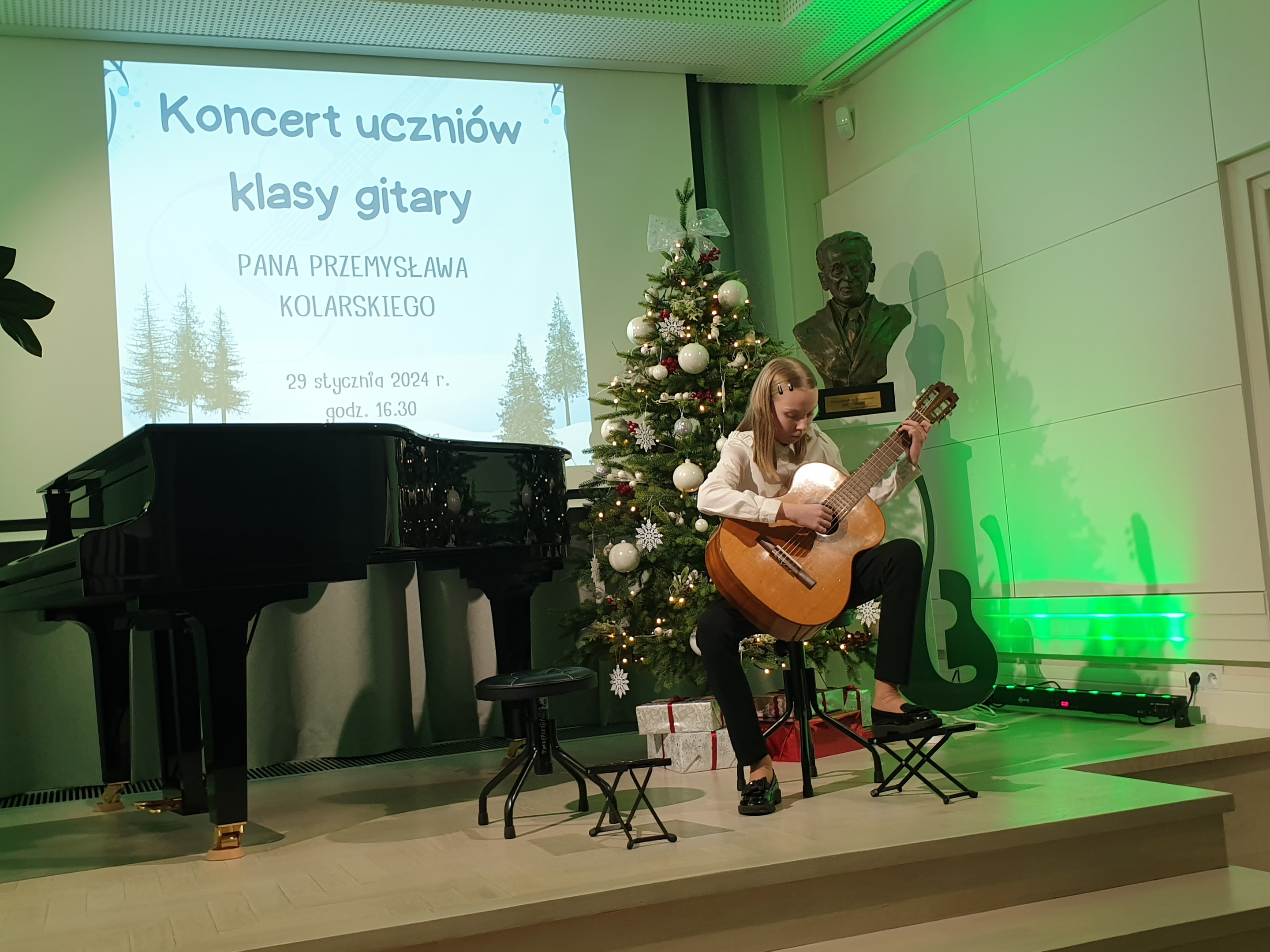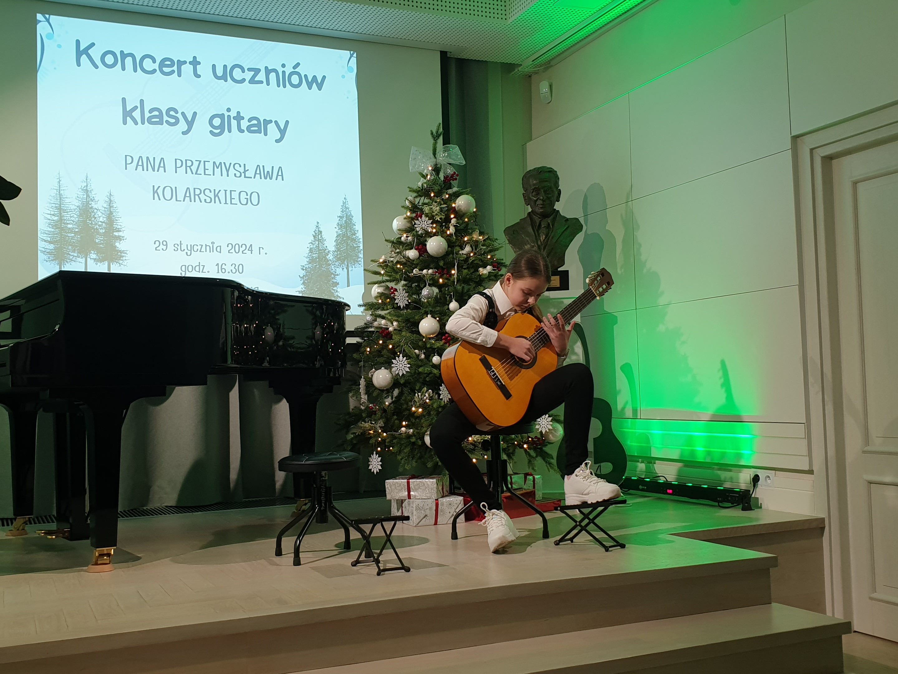 29 stycznia 2024 r. w naszej szkole odbył się koncert klasy gitary p. Przemysława Kolarskiego. Licznie zgromadzona publiczność mogła wysłuchać kolęd, utworów świątecznych, klasycznych i rozrywkowych.