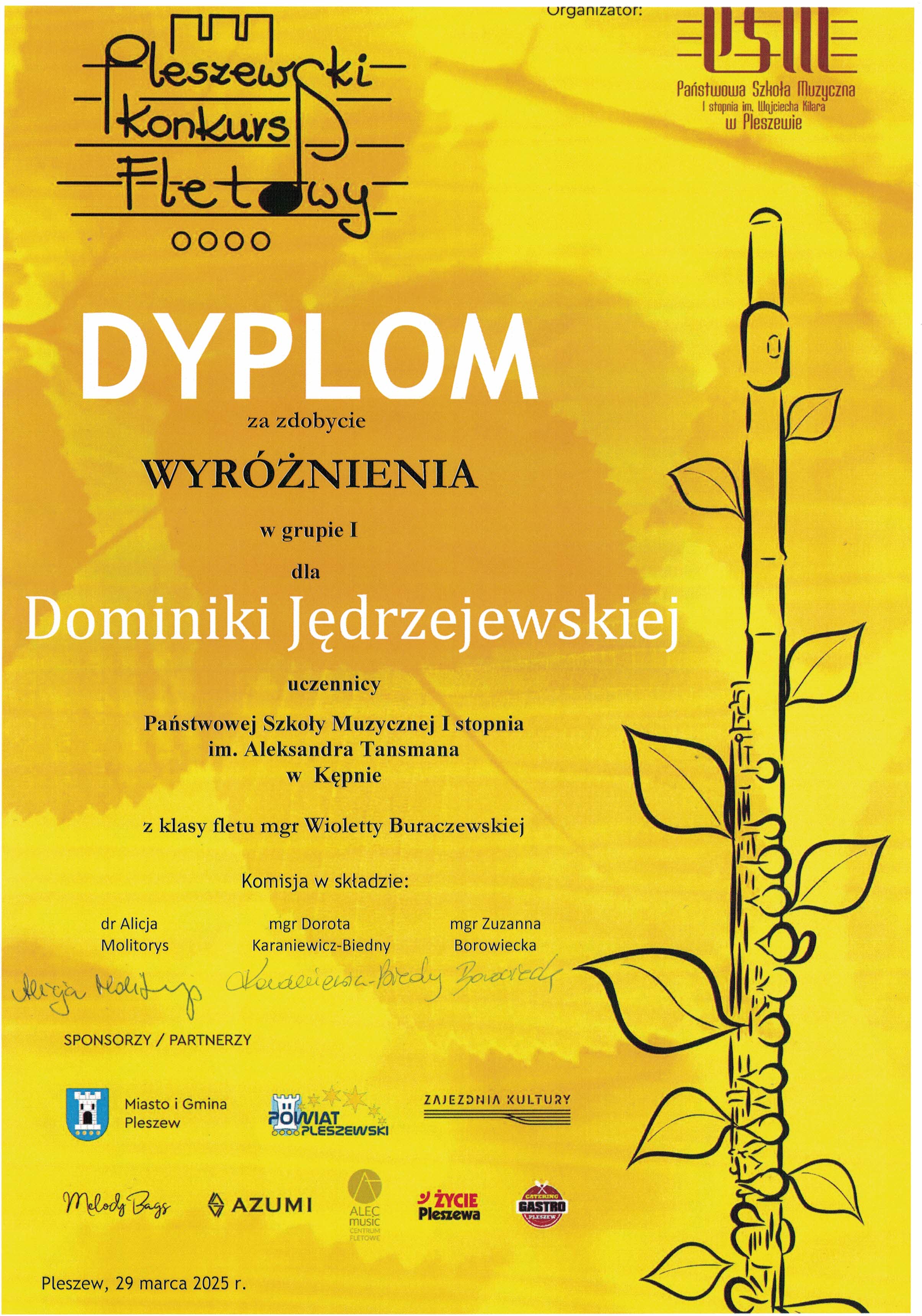W dniu 29 marca 2025 r. nasza uczennica Dominika Jędrzejczak z klasy fletu p. Wioletty Buraczewskiej uczestniczyła w IV. edycji Pleszewskiego Konkursu Fletowego o randze ogólnopolskiej. Był to debiut konkursowy uczennicy. Występ Dominiki został doceniony przez komisję konkursową, która postanowiła wyróżnić uczennicę. Podczas prezentacji konkursowej uczennicy towarzyszyła na scenie p. Edyta Szymańska. Gratulujemy!