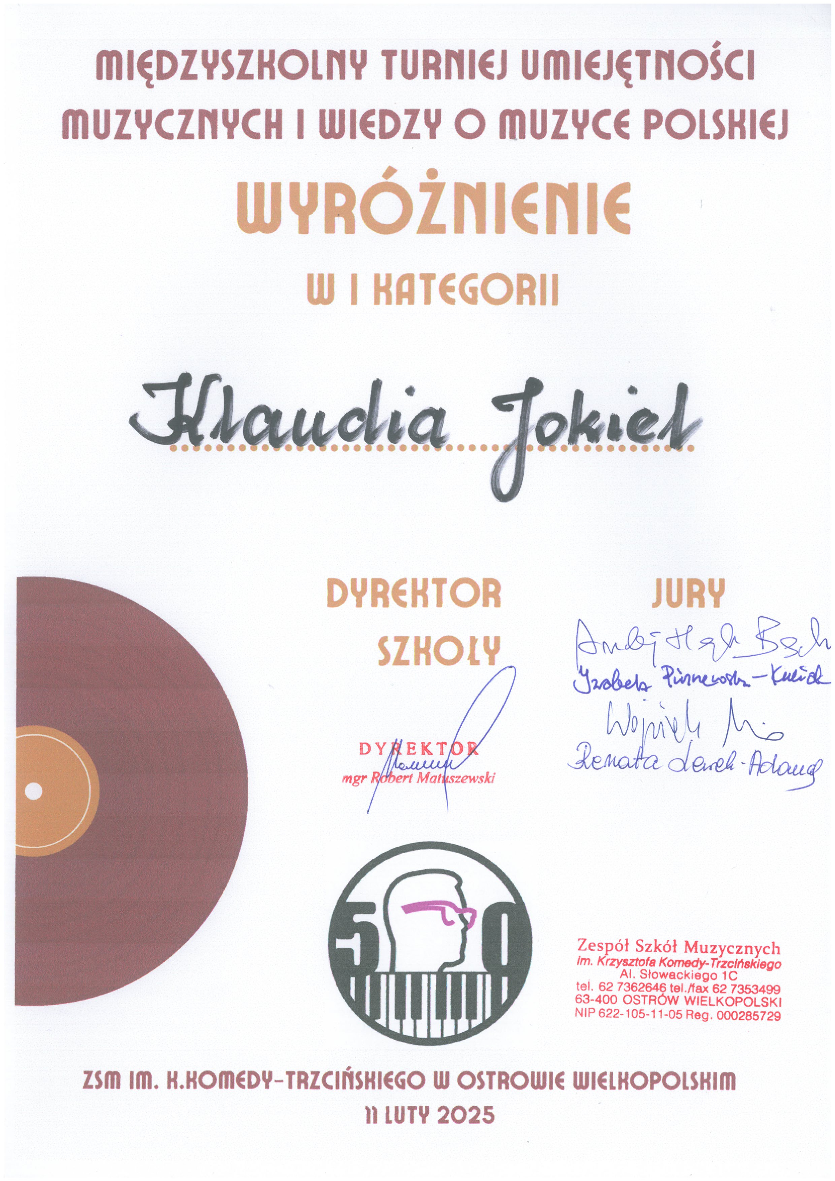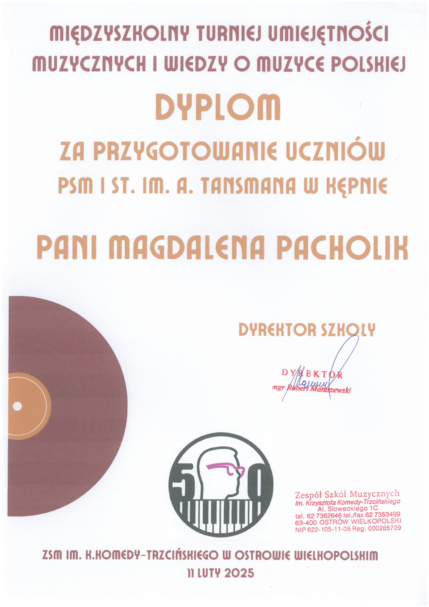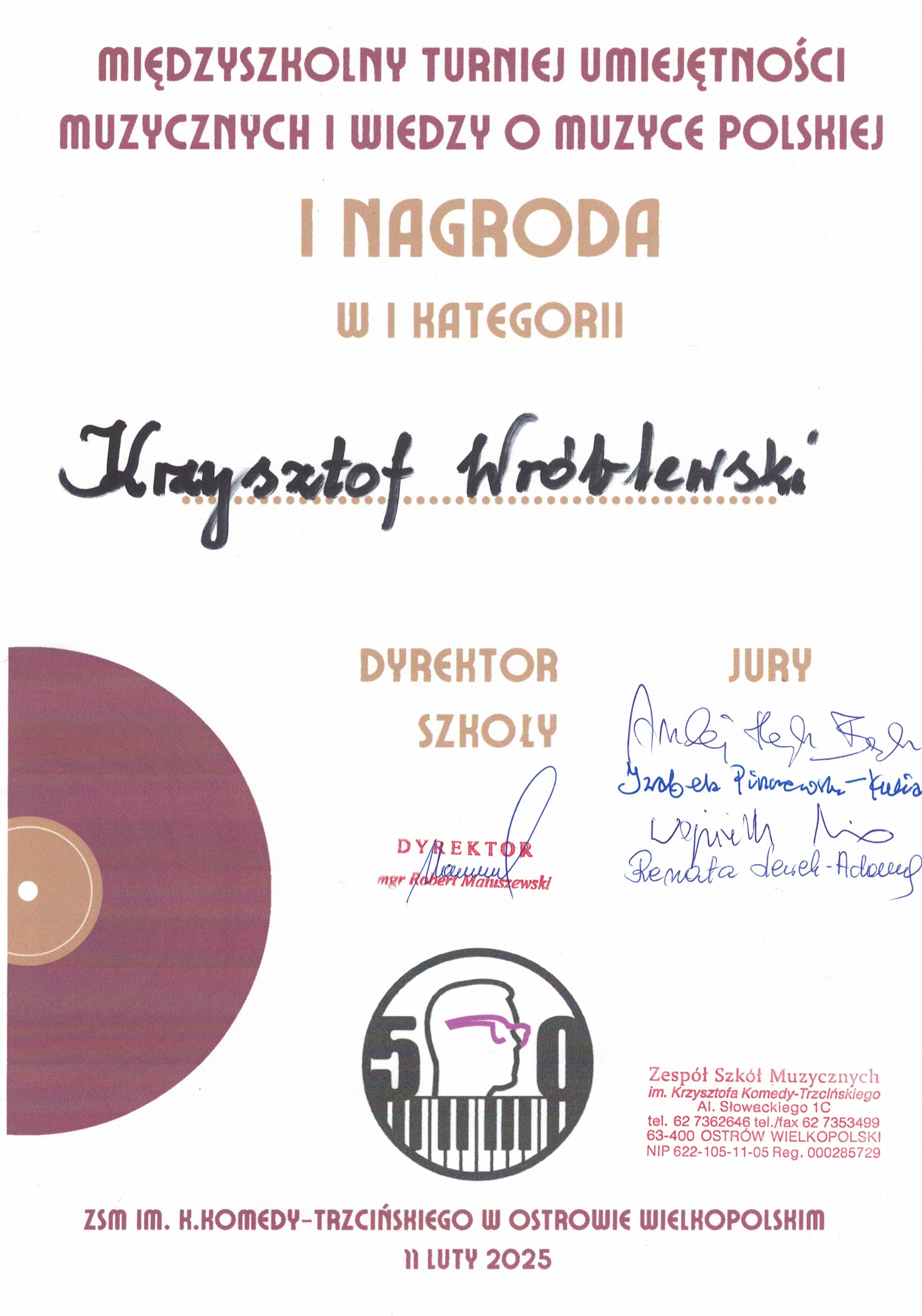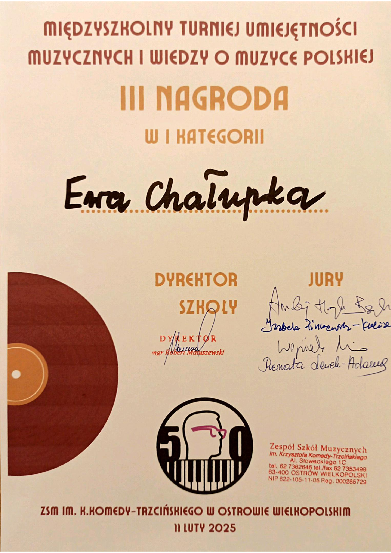 Sukces uczniów podczas Turnieju Umiejętności Muzycznych i Wiedzy o Muzyce Polskiej w Ostrowie Wlkp. - 11 lutego 2025