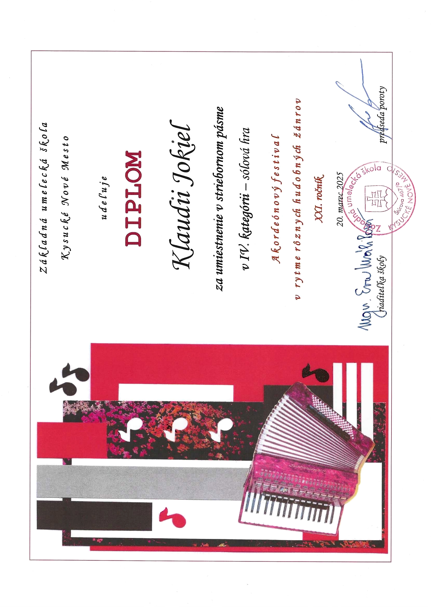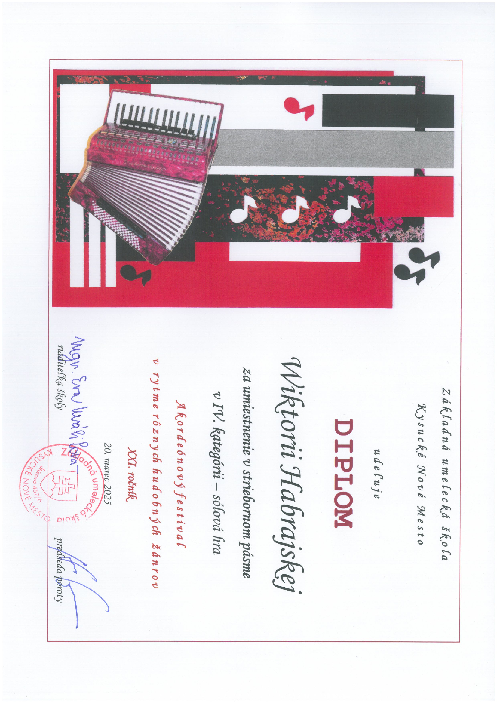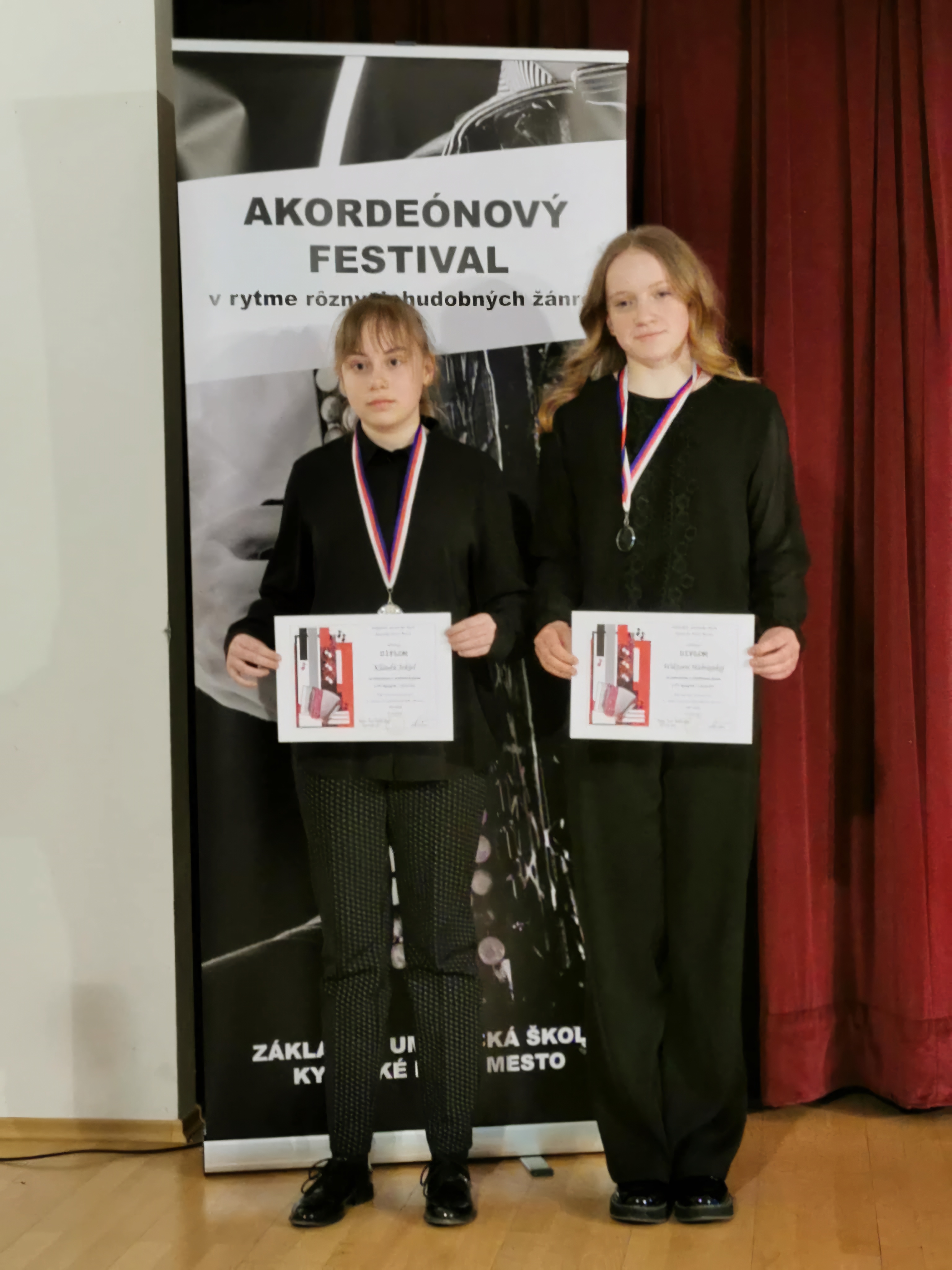 W dniu 20 marca 2025 r. Wiktoria Habrajska i Klaudia Jokiel - uczennice klasy akordeonu p. Sławomira Mocha - uczstniczyły w XXI Festiwalu Akordeonowym pn. "w rytmie różnych gatunków muzycznych" na Słowacji. Obie uczennice zdobyły srebrne pasma (II miejsca). Serdecznie gratulujemy!