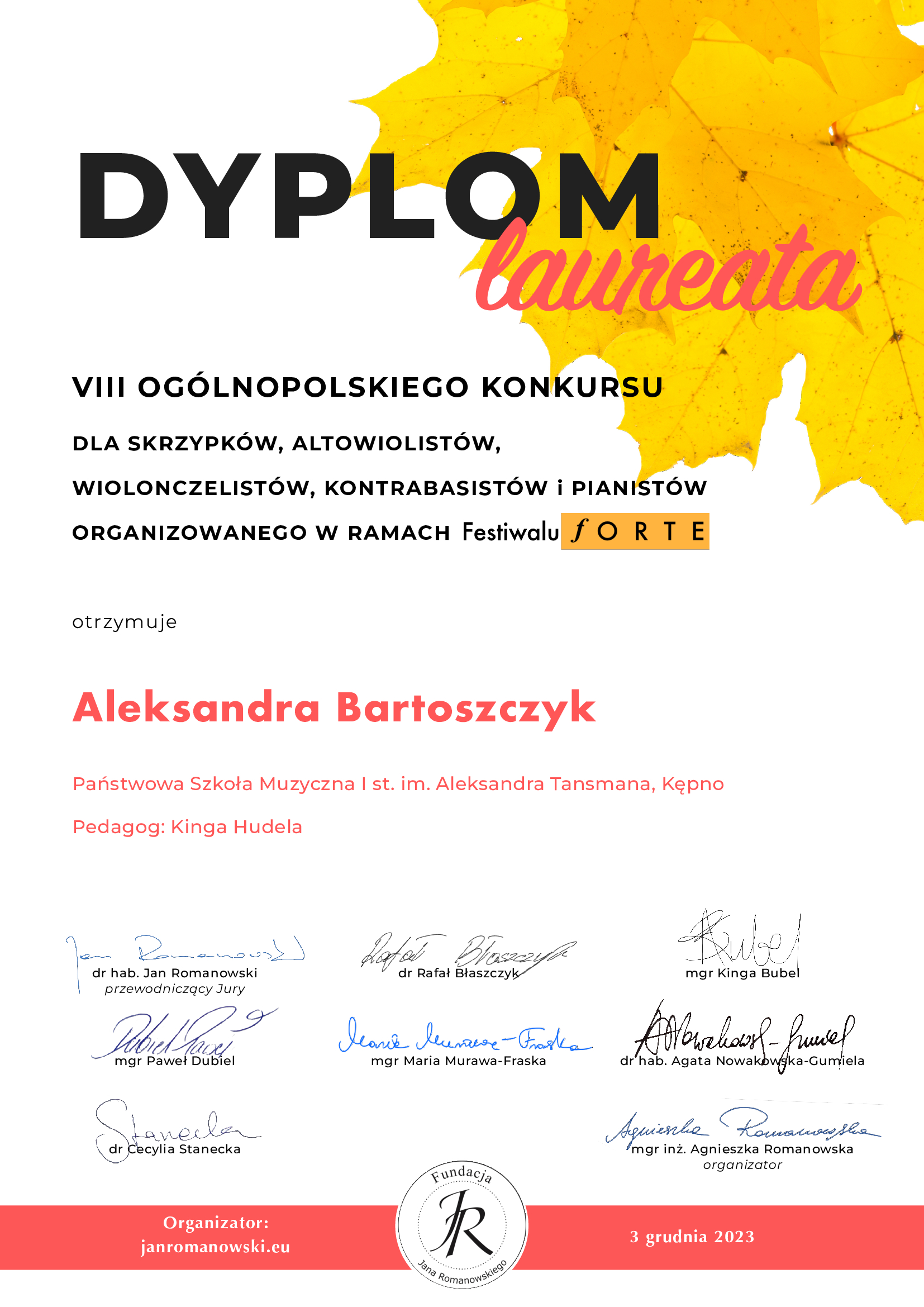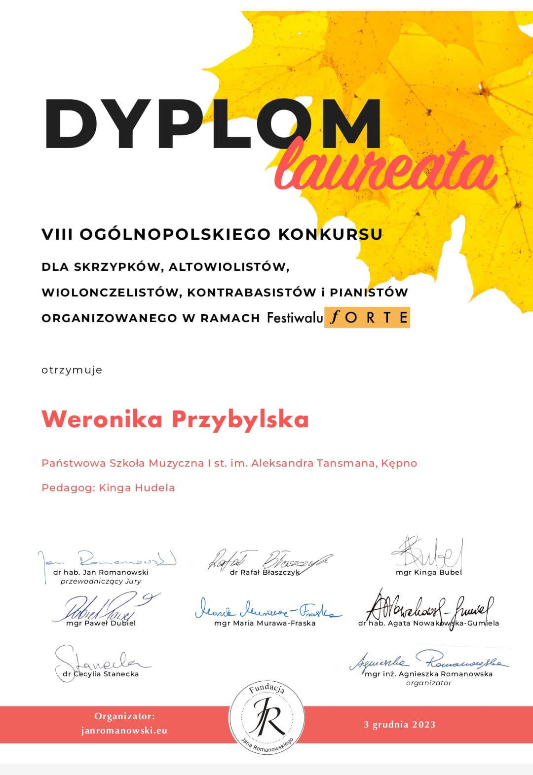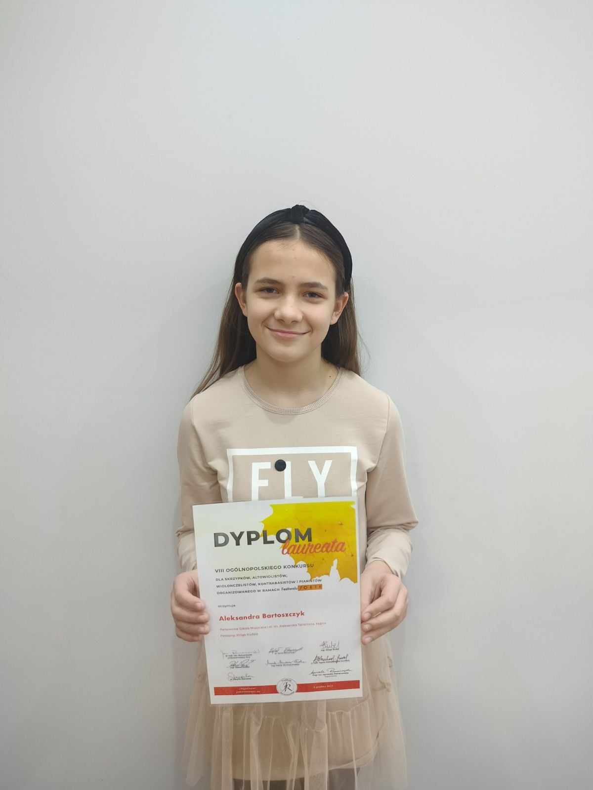 3 grudnia 2023 r. okazał się szczęśliwy nie tylko dla Martynki, ale również dla trzech uczennic z klasy skrzypiec p. Kingi Hudela: Roksany Szymanek z kl. I cyklu 6-letniego oraz Aleksandry Bartoszczyk i Weroniki Przybylskiej z kl. II cyklu 4-letniego. Cała trójka zdobyła tytuł laureata w VIII Ogólnopolskim Konkursie m.in. dla skrzypków w ramach Festiwalu FORTE. Serdecznie gratulujemy!