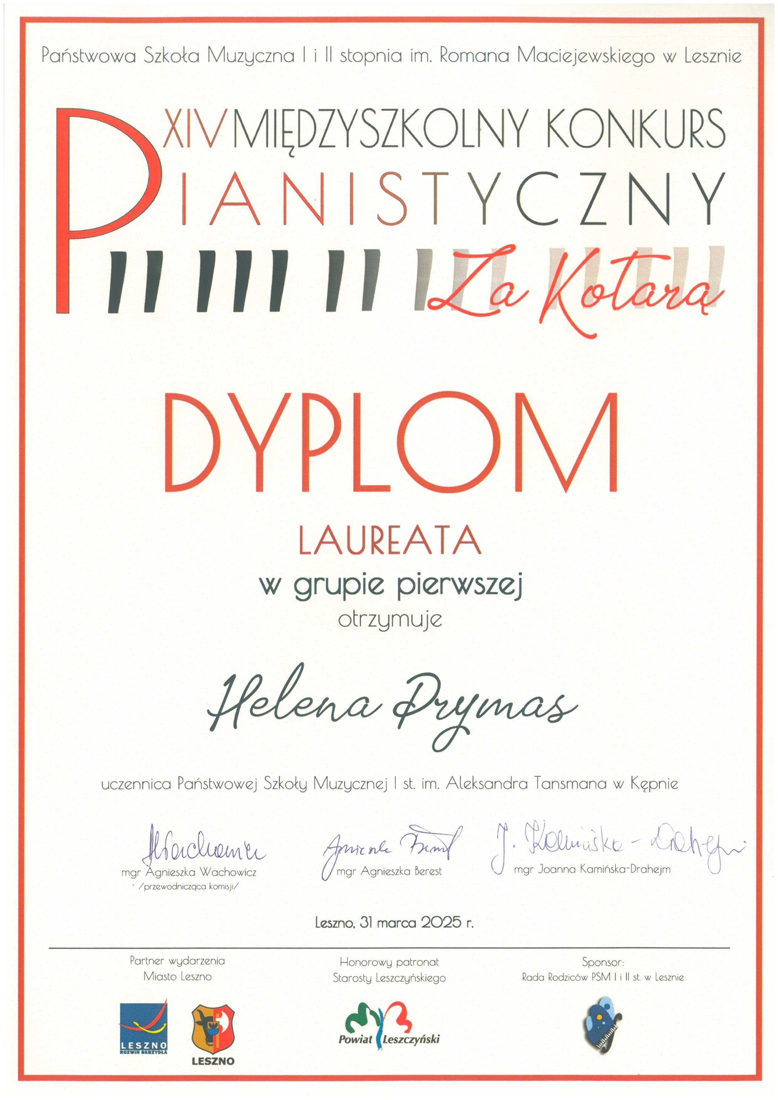 Tytuł Laureata dla Heleny Prymas w Konkursie Pianistycznym w Lesznie - 31 marca 2025