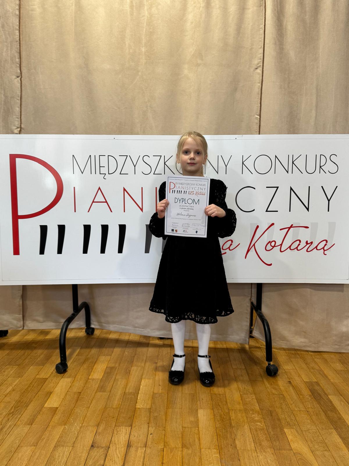 Helenka Prymas - uczennica klasy fortepianu pani Pauliny Sochockiej – Musiał - to kolejny w tym roku szkolnym odkryty talent muzyczny. Uczennica po niespełna kilkumiesięcznej nauce w szkole po raz pierwszy jak dotąd wzięła udział w XIV Międzyszkolnym Konkursie Pianistycznym w Lesznie i wygrała! Jesteśmy dumni z naszej młodziutkiej i dobrze rokującej pianistki. Trzymamy kciuki podczas kolejnych zmagań konkursowych. Gratulujemy!