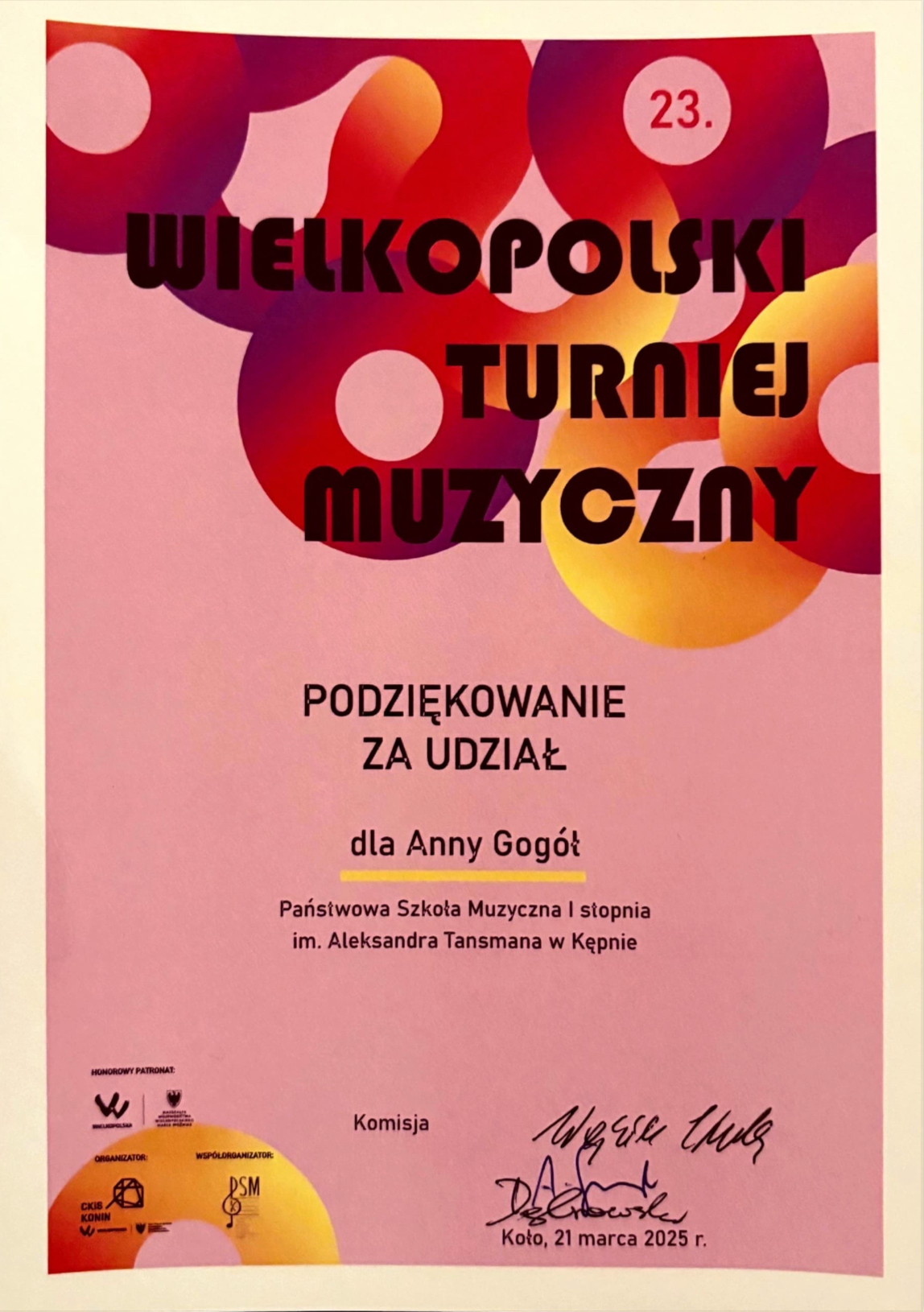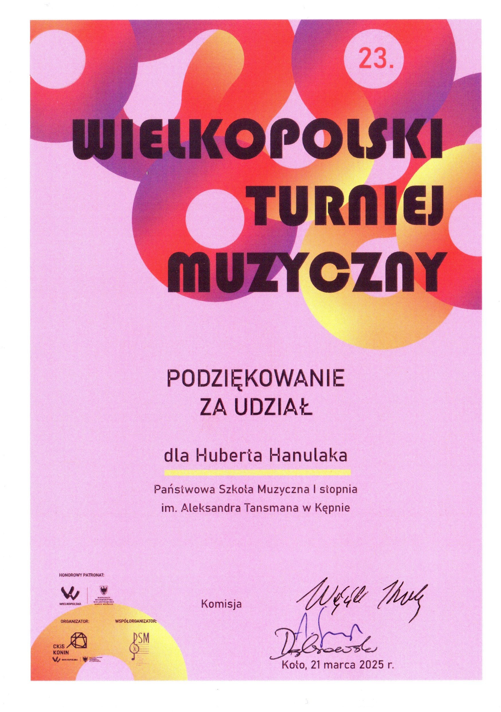 W dniu 21 marca 2025 r., w pierwszym dniu wiosny w Kole odbył się 23. Wielkopolski Turniej Muzyczny pod patronatem Marszałka Województwa Wielkopolskiego. Turniej był adresowany do uczniów klas instrumentów dętych. Z naszej szkoły w Turnieju udział wzięło dwoje uczniów z klasy trąbki pana Damiana Chudego: Anna Gogół i Hubert Hanulak. Gratulujemy!