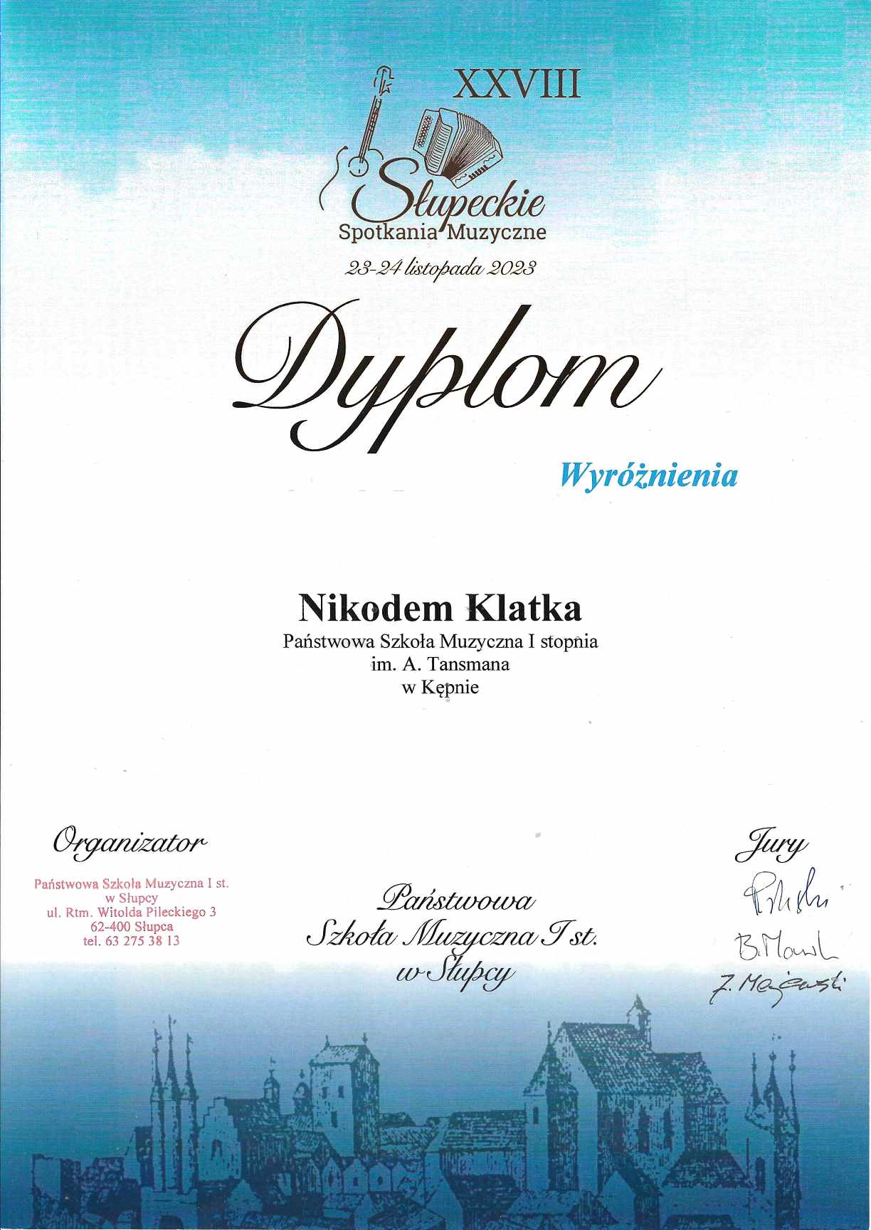 Wyróżnienie dla Nikodema Klatki podczas Słupeckich Spotkań Muzycznych - 24 listopada 2023