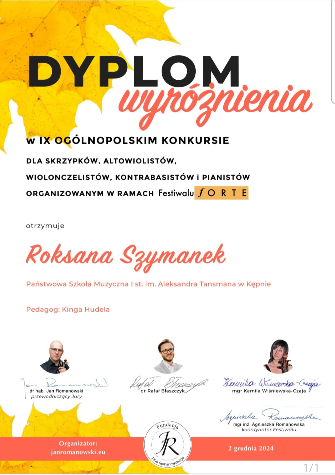 Wyróżnienie dla Roksany Szymanek w IX Ogólnopolskim Konkursie w ramach Festiwalu FORTE - 2 grudnia 2024