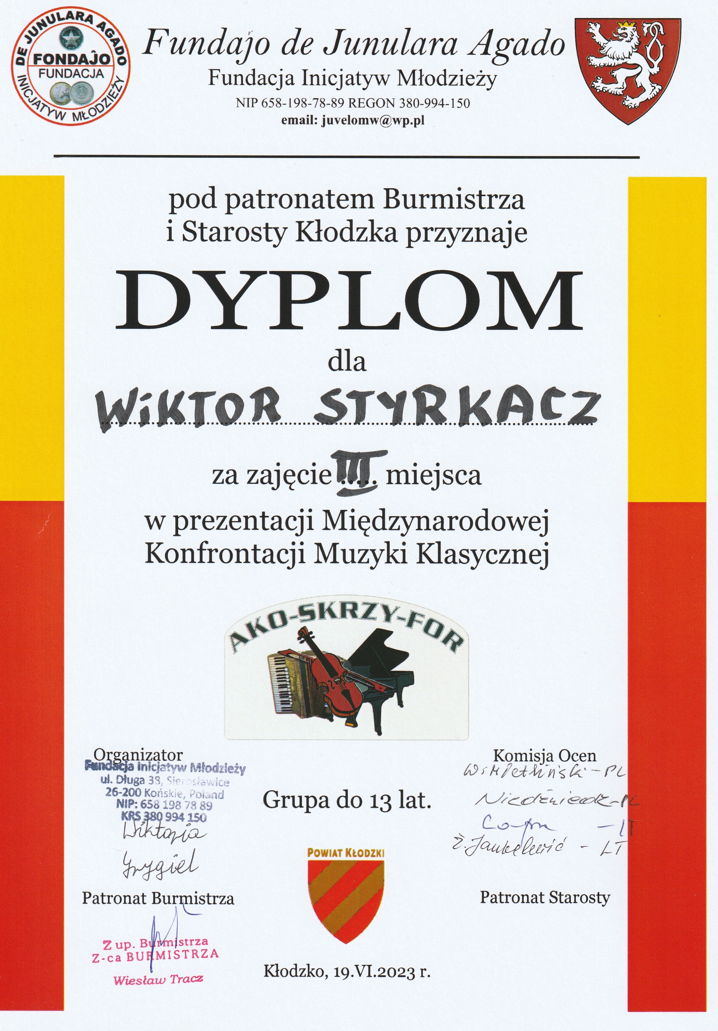 Było warto, bo na Międzynarodowych Konfrontacjach Muzyki Klasycznej w grupie do lat 10 pierwsze miejsce zdobył Gabryś Charęza, a trzecie miejsce Tomek Brzezicki. W grupie do lat 13 Wiktor Styrkacz zajął trzecie miejsce. Natomiast w grupie najstarszej Oskar Gałęski i Tymek Bartlewski otrzymali drugie miejsce. Pierwsze miejsce zajęła skrzypaczka ze średniej szkoły muzycznej we Wrocławiu.