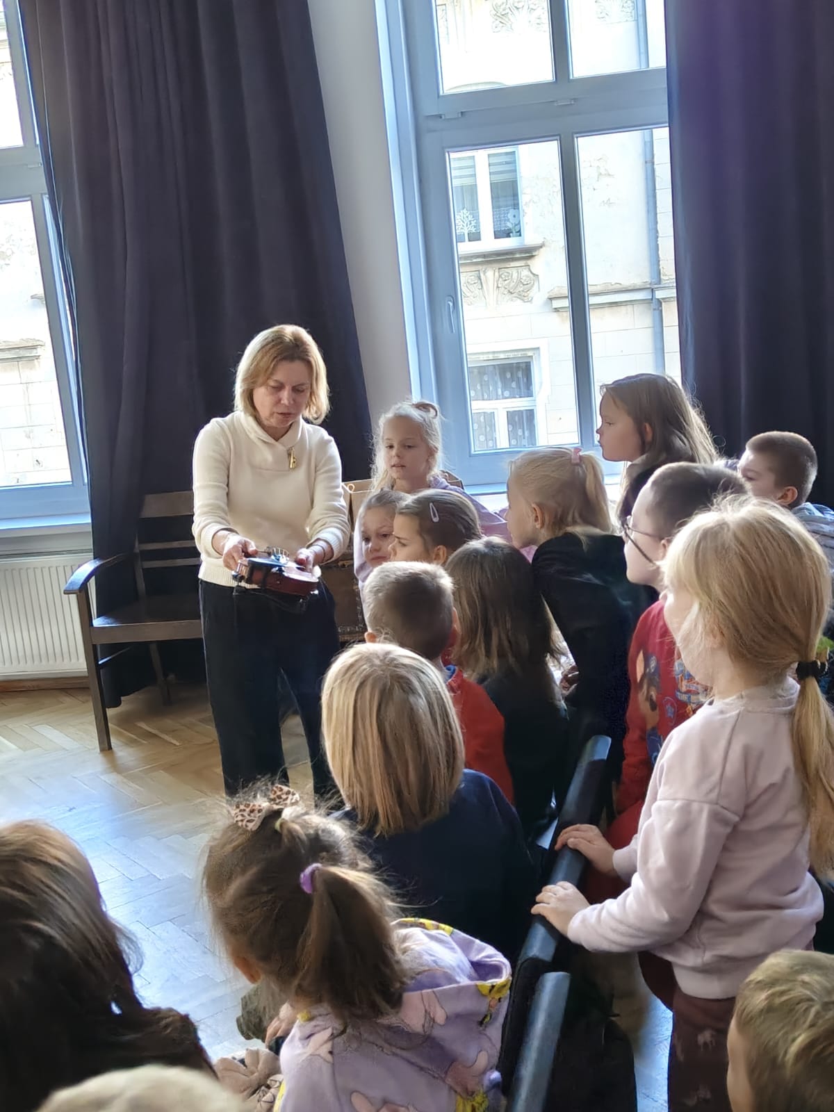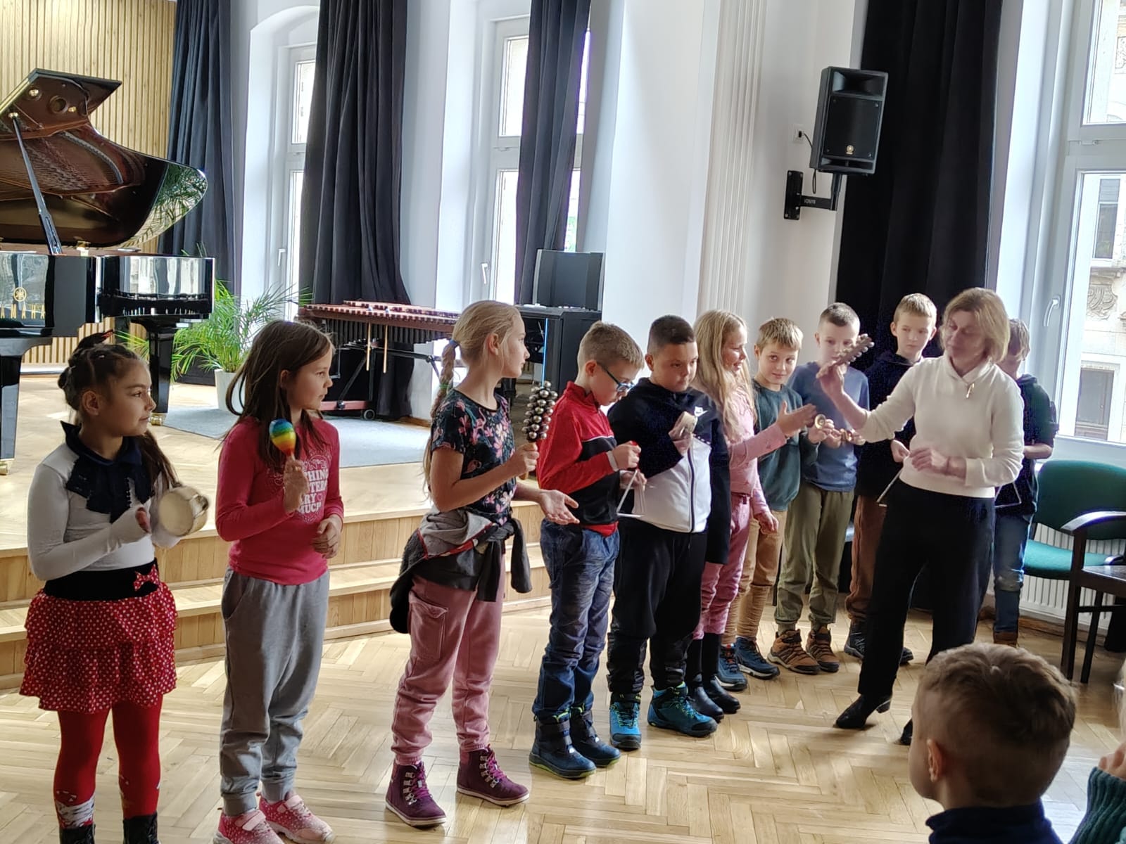 Prowadząca audycję p. Renata Fiałkowska-Duma ciekawie opowiadała o instrumentach muzycznych, poprowadzila zabawę rytmiczną, a najwięcej emocji przyniosło wspólne śpiewanie kanonu "Panie Janie". W przedsięwzięciu wzięły udział jeszcze p. Angelika Strzygocka (akompaniament fortepianowy) oraz p. Agnieszka Kozakowska (archiwum foto). Dodajmy, że przez ostatnich kilka dni audycji w naszej szkole wysłuchało łącznie 578 dzieci z kłodzkich podstawówek ( ZSS, SP nr 3, SP im. Reymonta, SP nr 1) oraz kłodzkich przedszkoli (Przedszkole nr 4, Przedszkole "Promyczek"). Mamy nadzieję, że już za kilka miesięcy duża grupa słuchaczy wróci do nas jako ucząca się gry na wybranym przez siebie instrumencie! Tegoroczne audycje koordynowała p. Bożena Adamska, a zaangażowani w ich realizację byli wszyscy nauczyciele naszej szkoły.