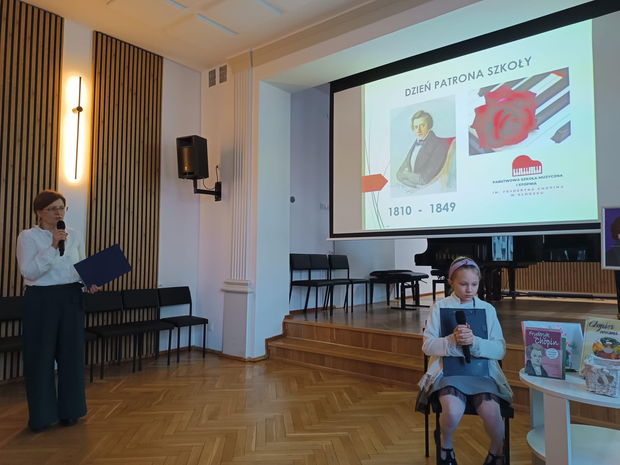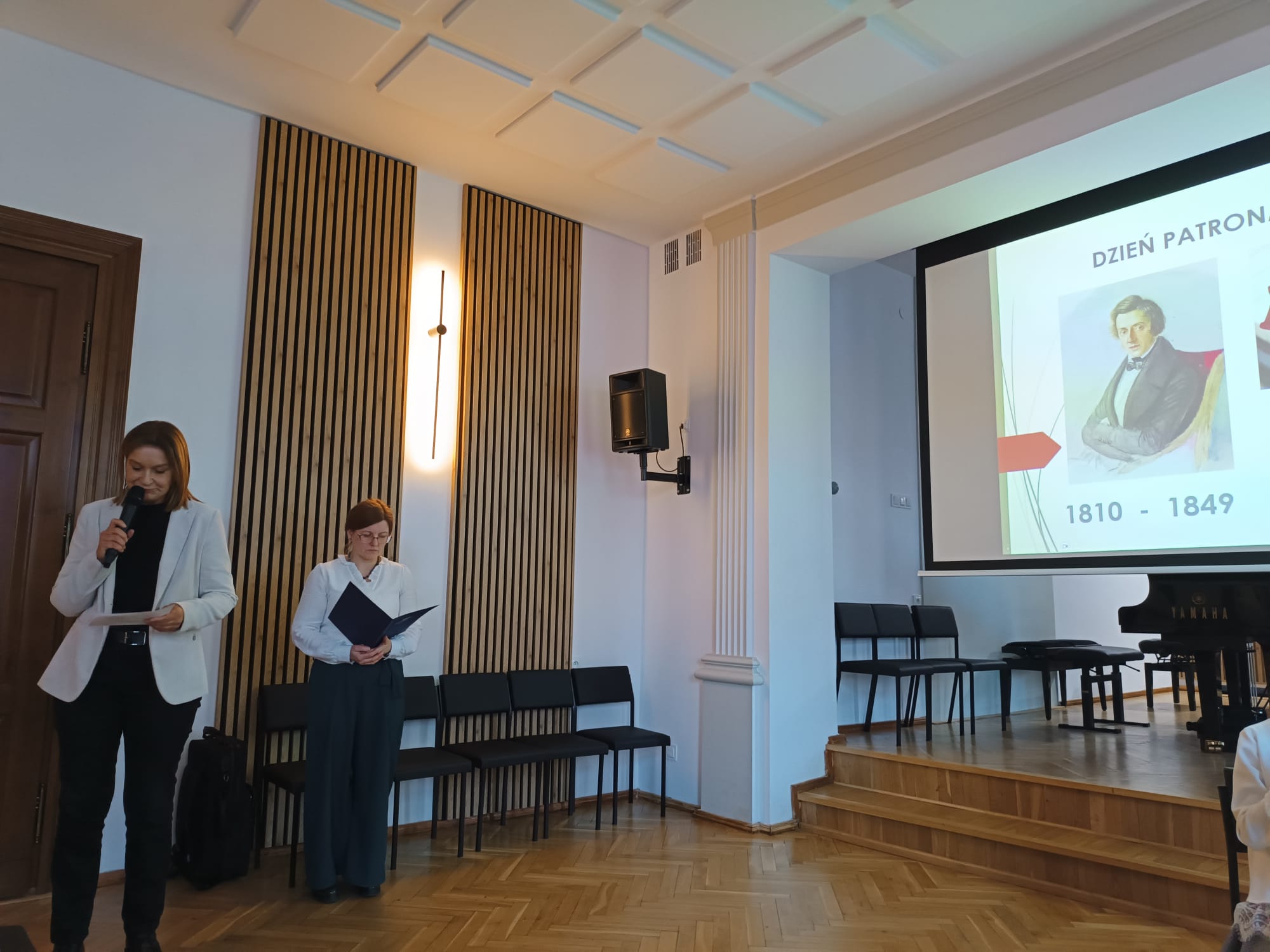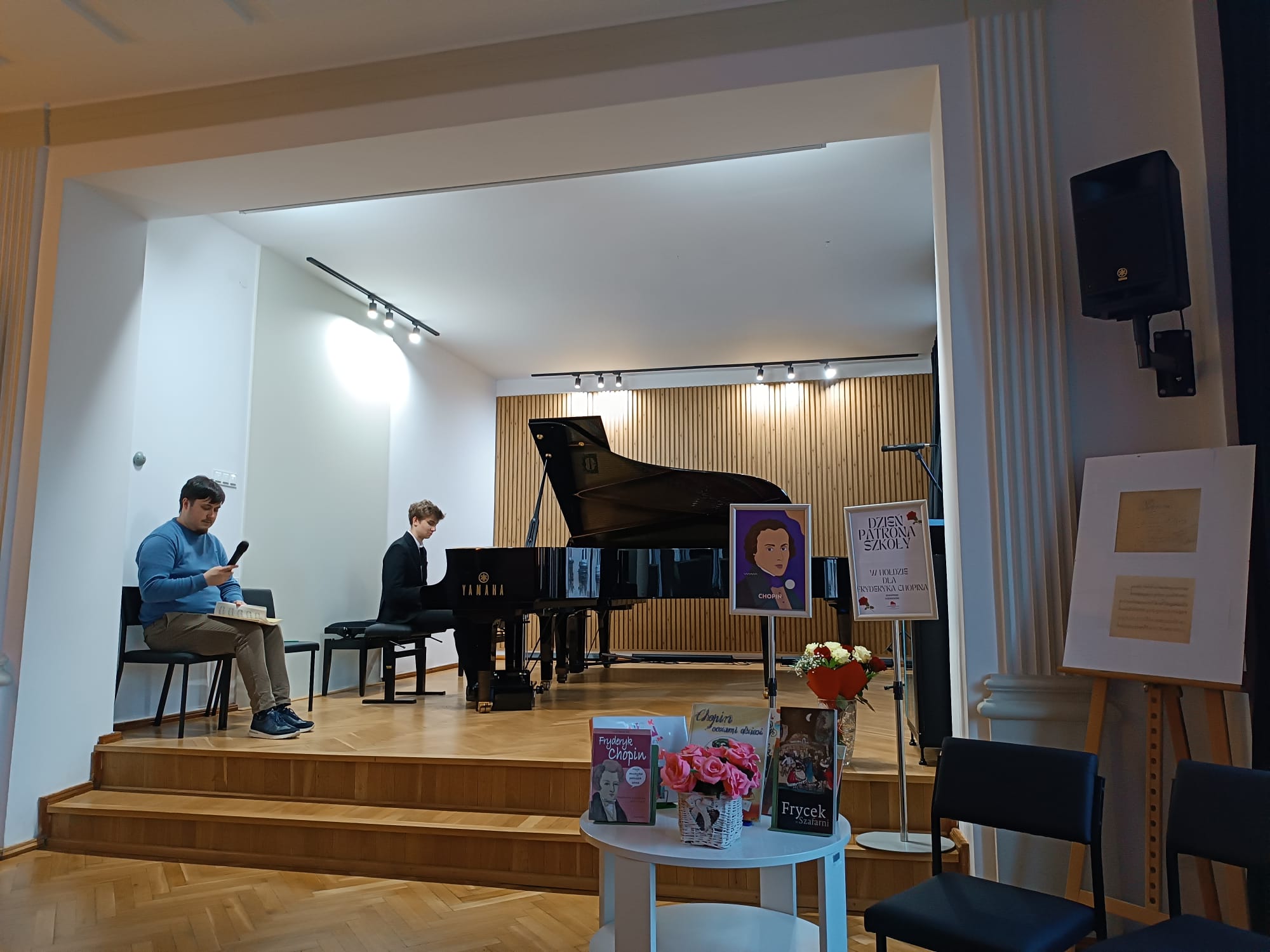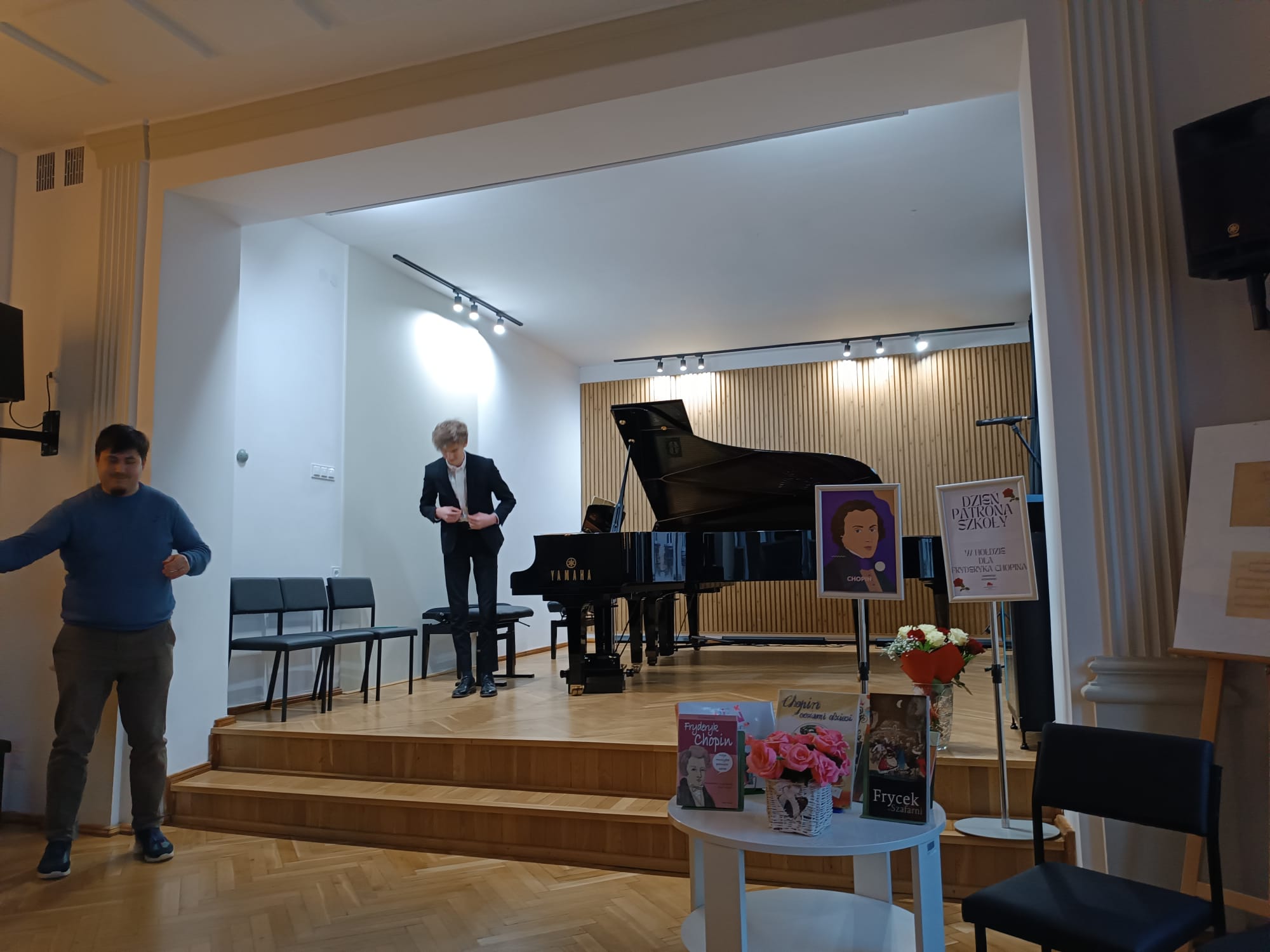 W dniu 2 marca w naszej szkole obchodziliśmy dzień patrona - Fryderyka Chopina. Z tej okazji mieliśmy zaszczyt gościć na warsztatach dla pianistów oraz podczas części oficjalnej o godzinie 17:00 pana mgr Michała Michalskiego z Wrocławia oraz jego ucznia Jakuba Paplińskiego- młodego utalentowanego pianistę z kl. V szkoły muzycznej II stopnia.