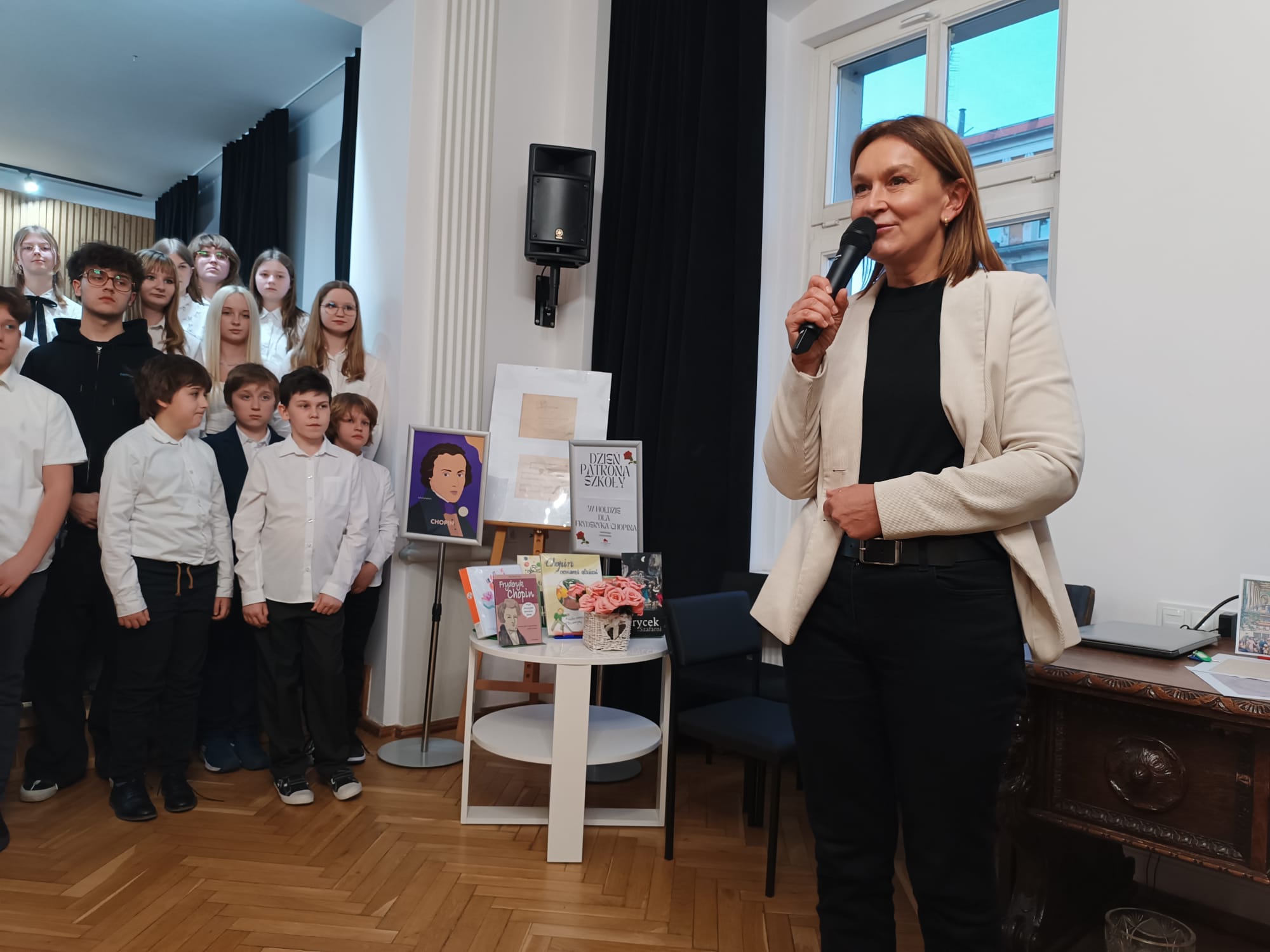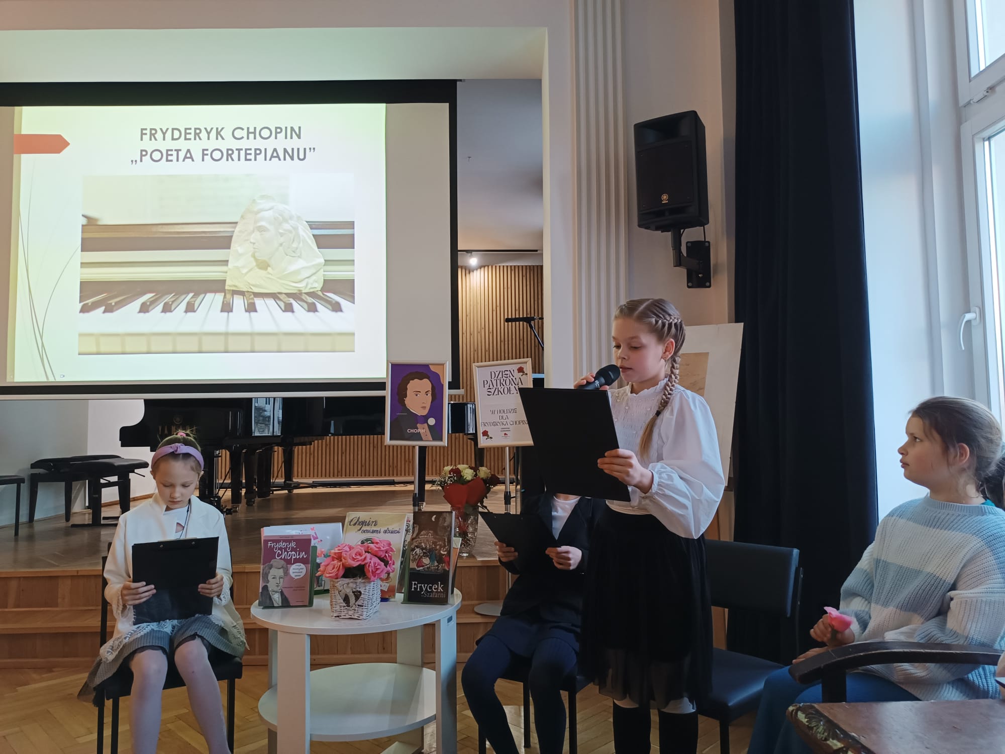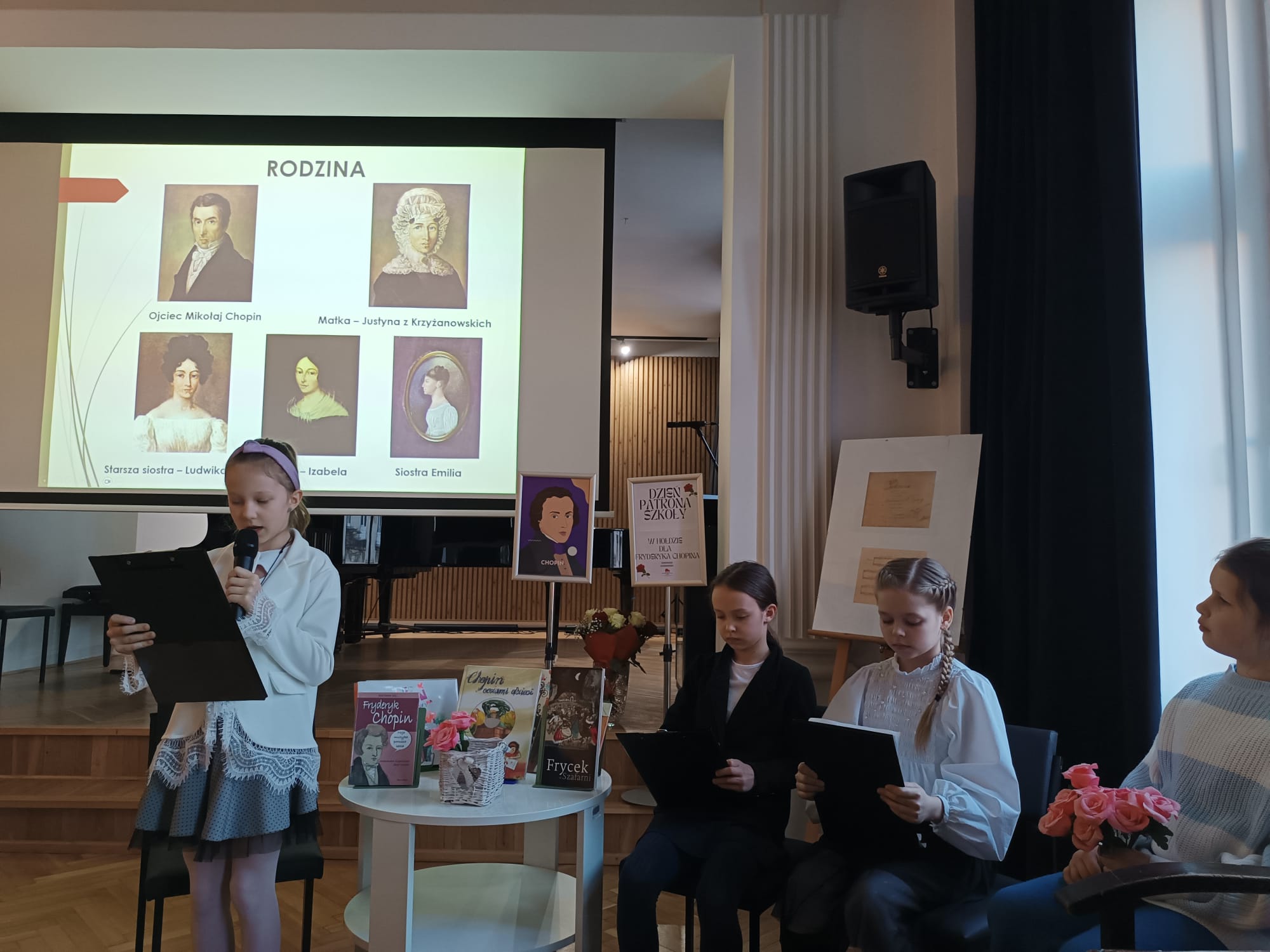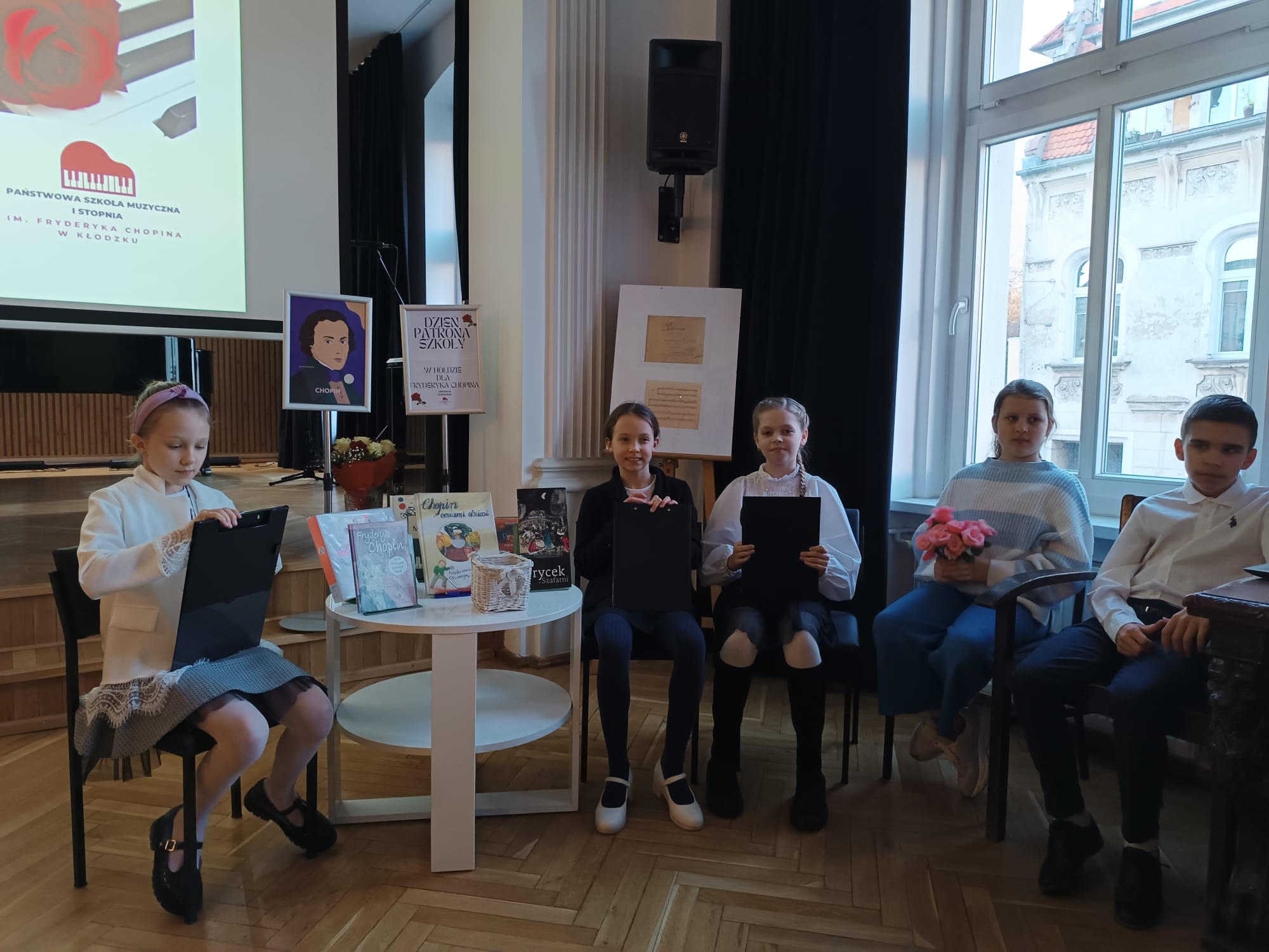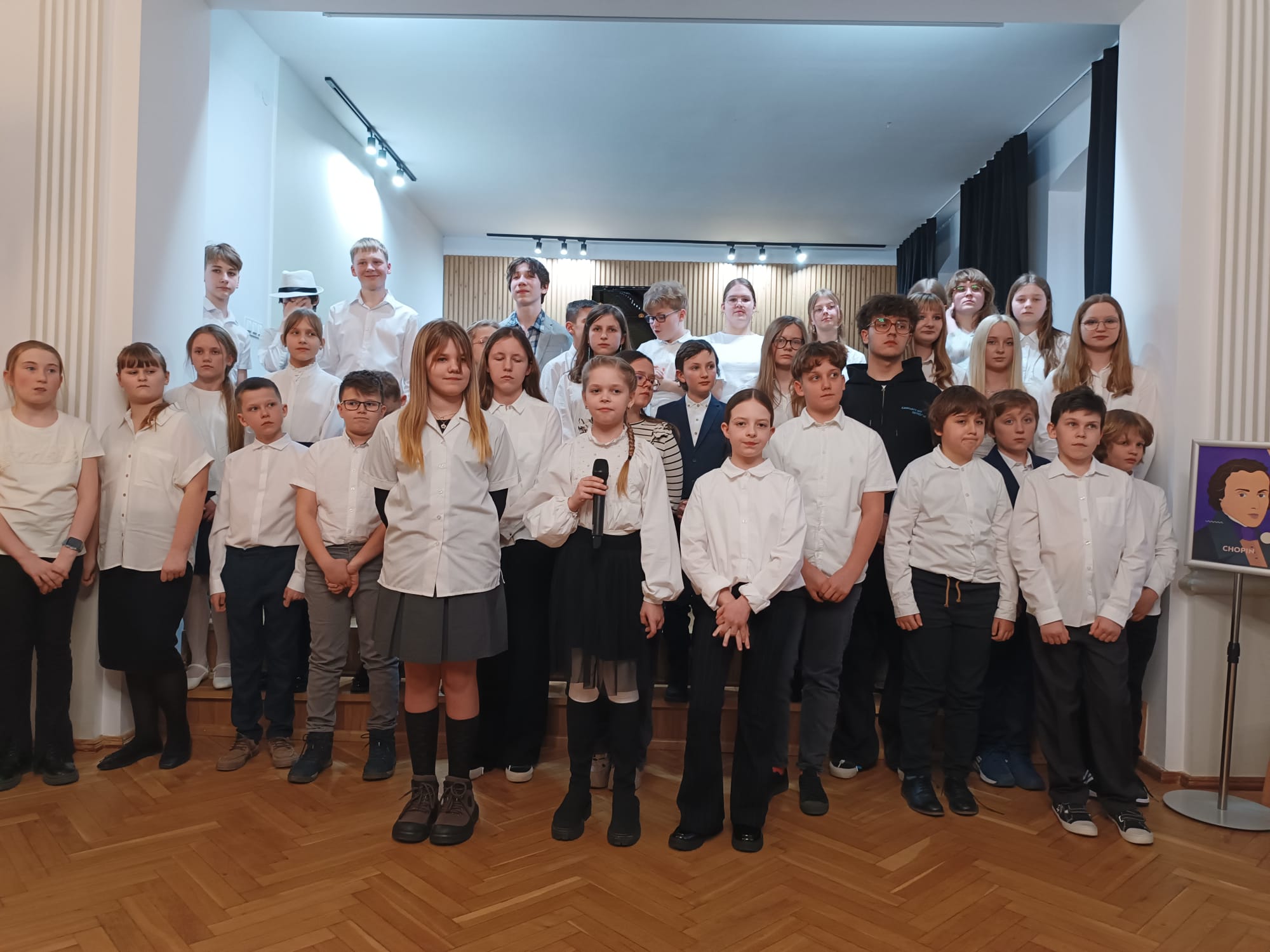 Na koniec wszyscy uczniowie uczęszczający na zajęcia teoretyczne przy akompaniamencie p.E. Malinowskiej zaśpiewali piosenkę o Fryderyku Chopinie: "Drogi Panie Fryderyku, mistrzu nasz i przewodniku. Prowadź przez muzyczny szlak, z Tobą dosięgniemy gwiazd!