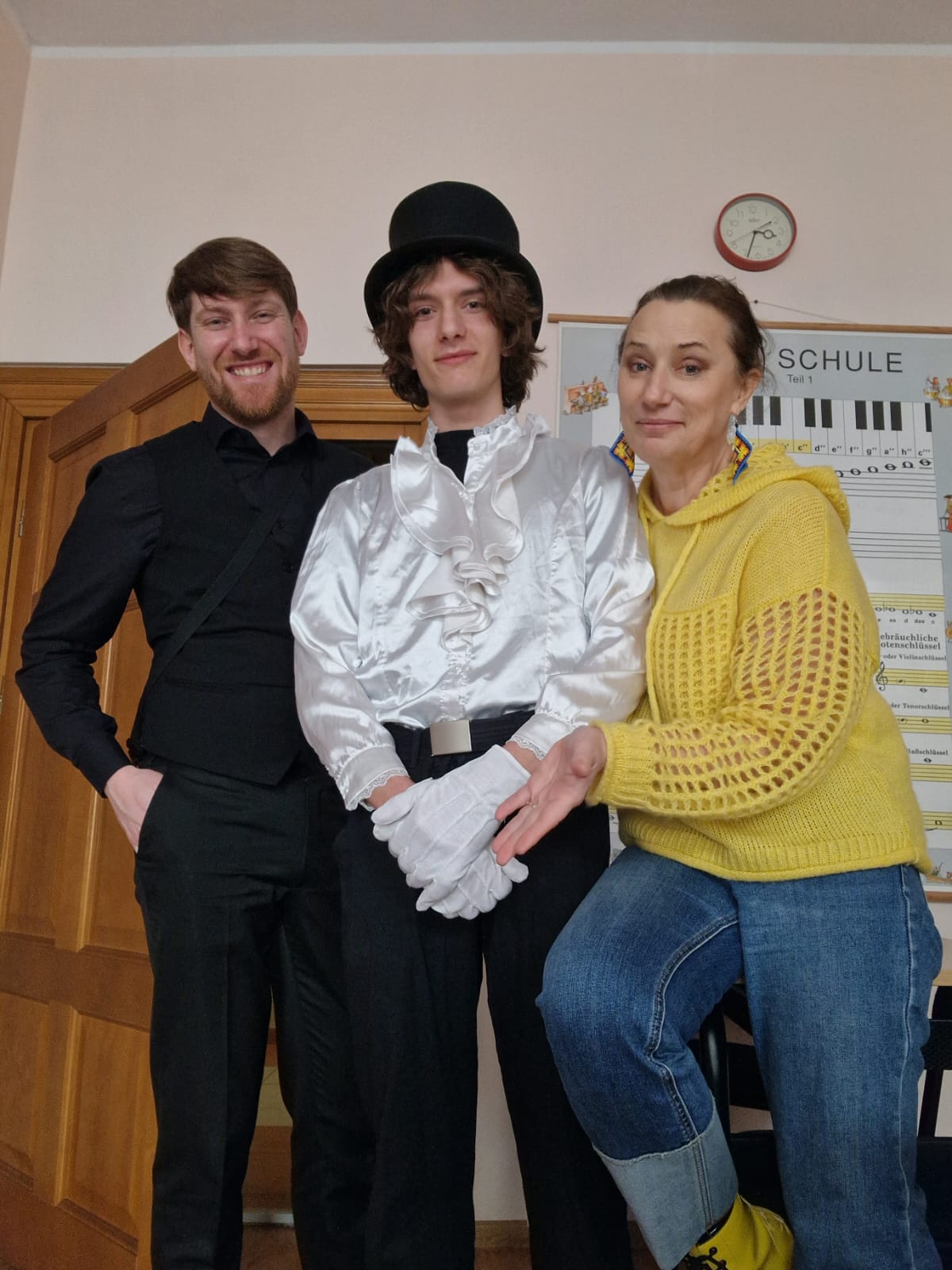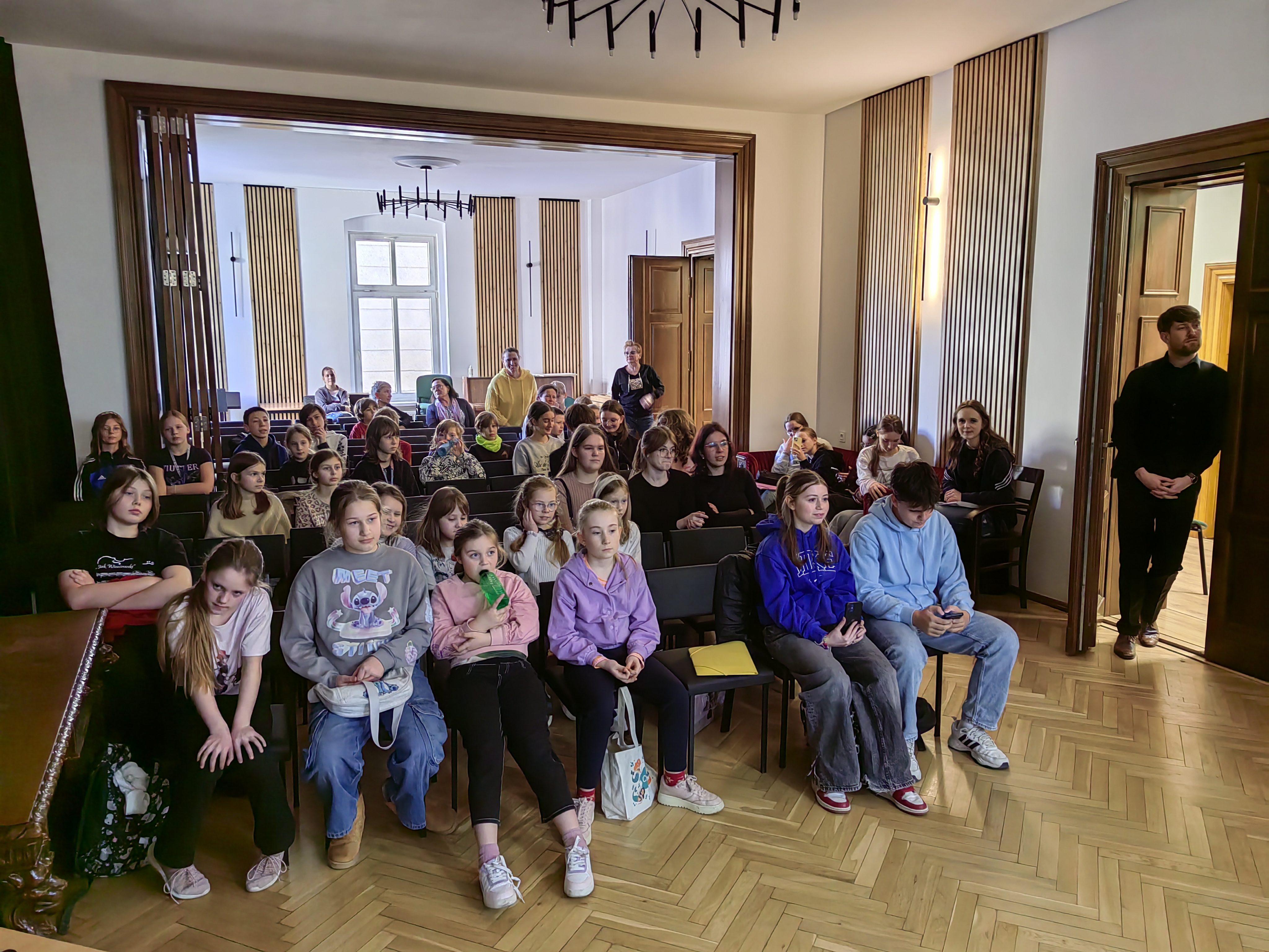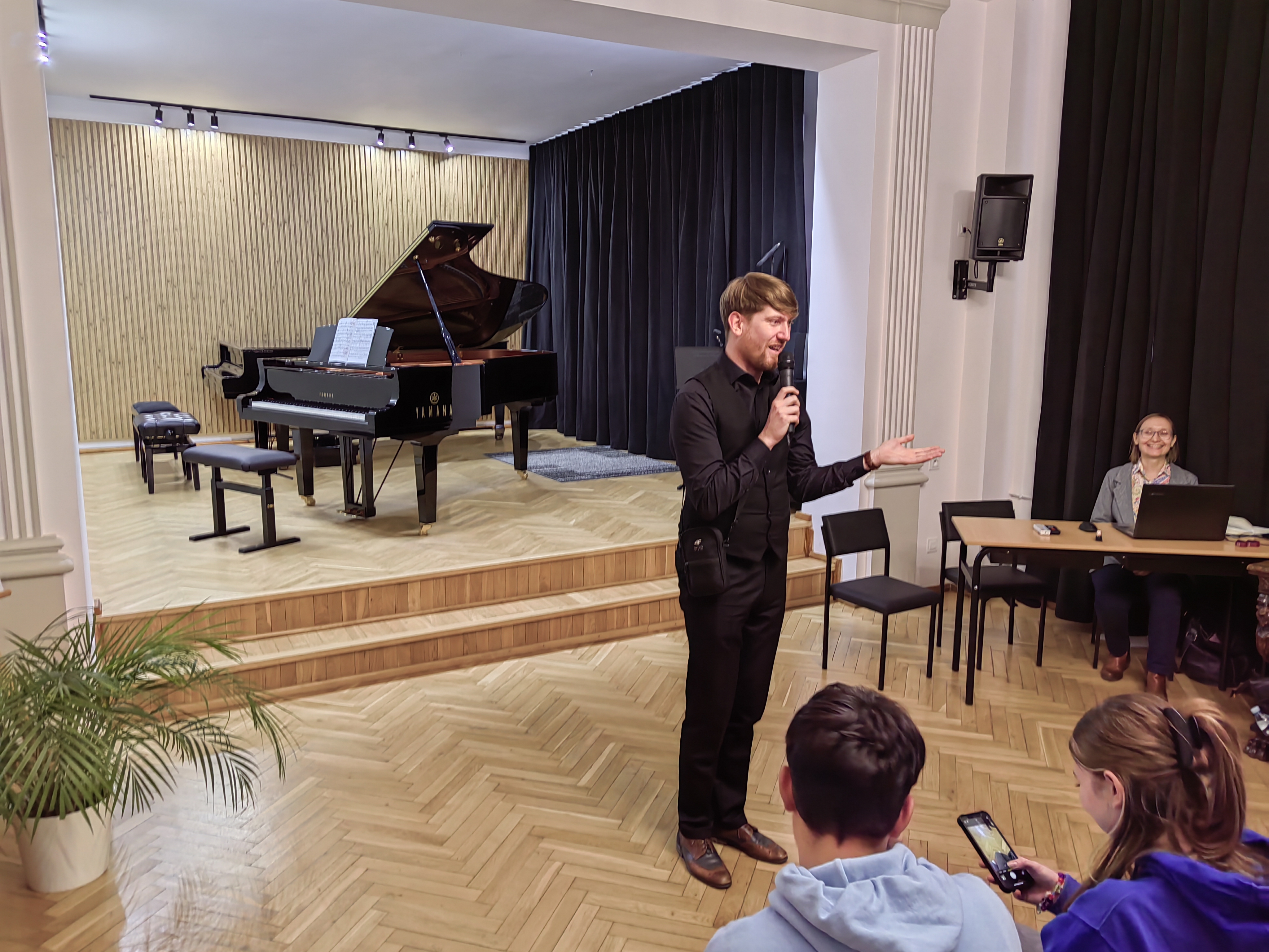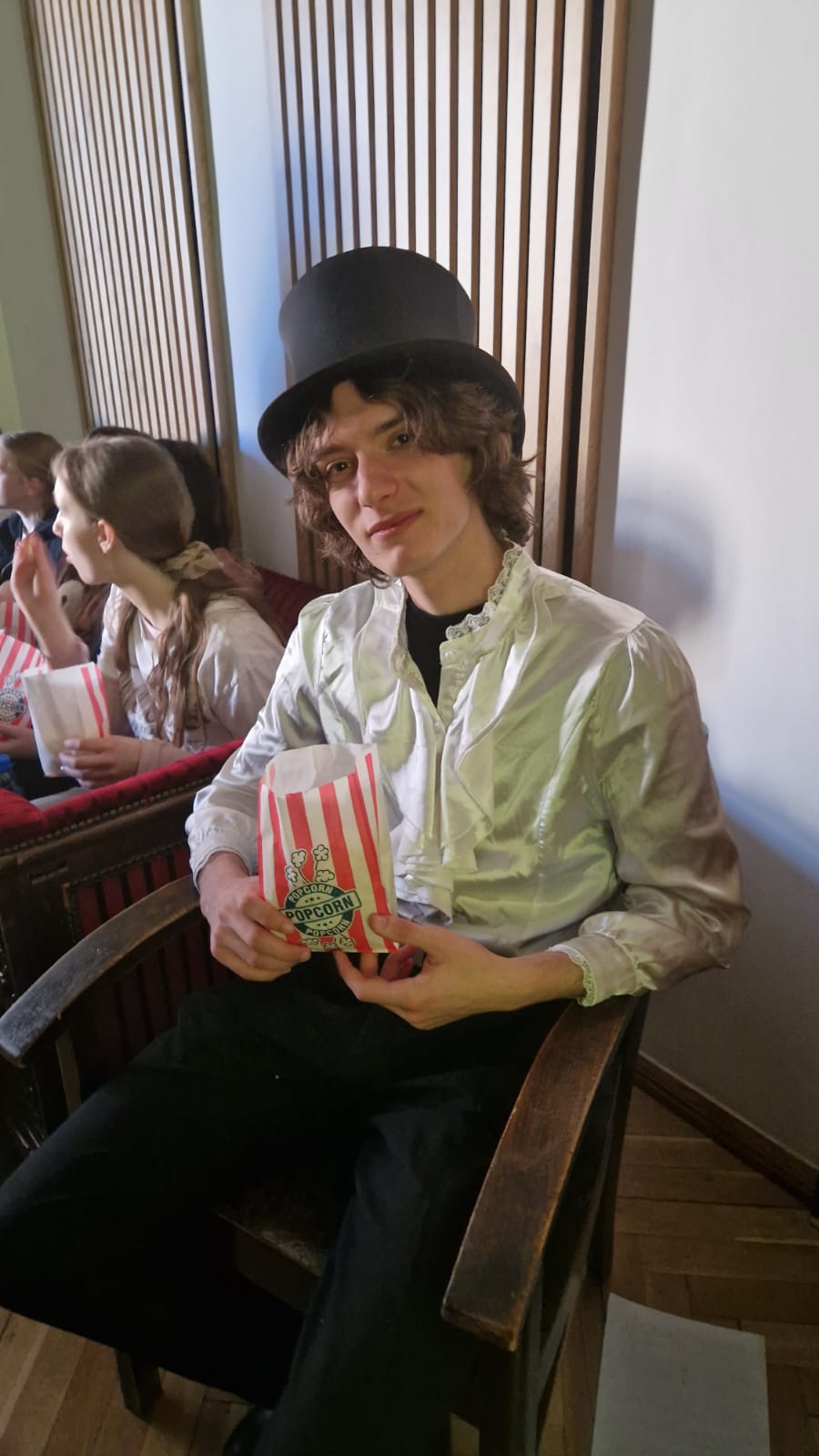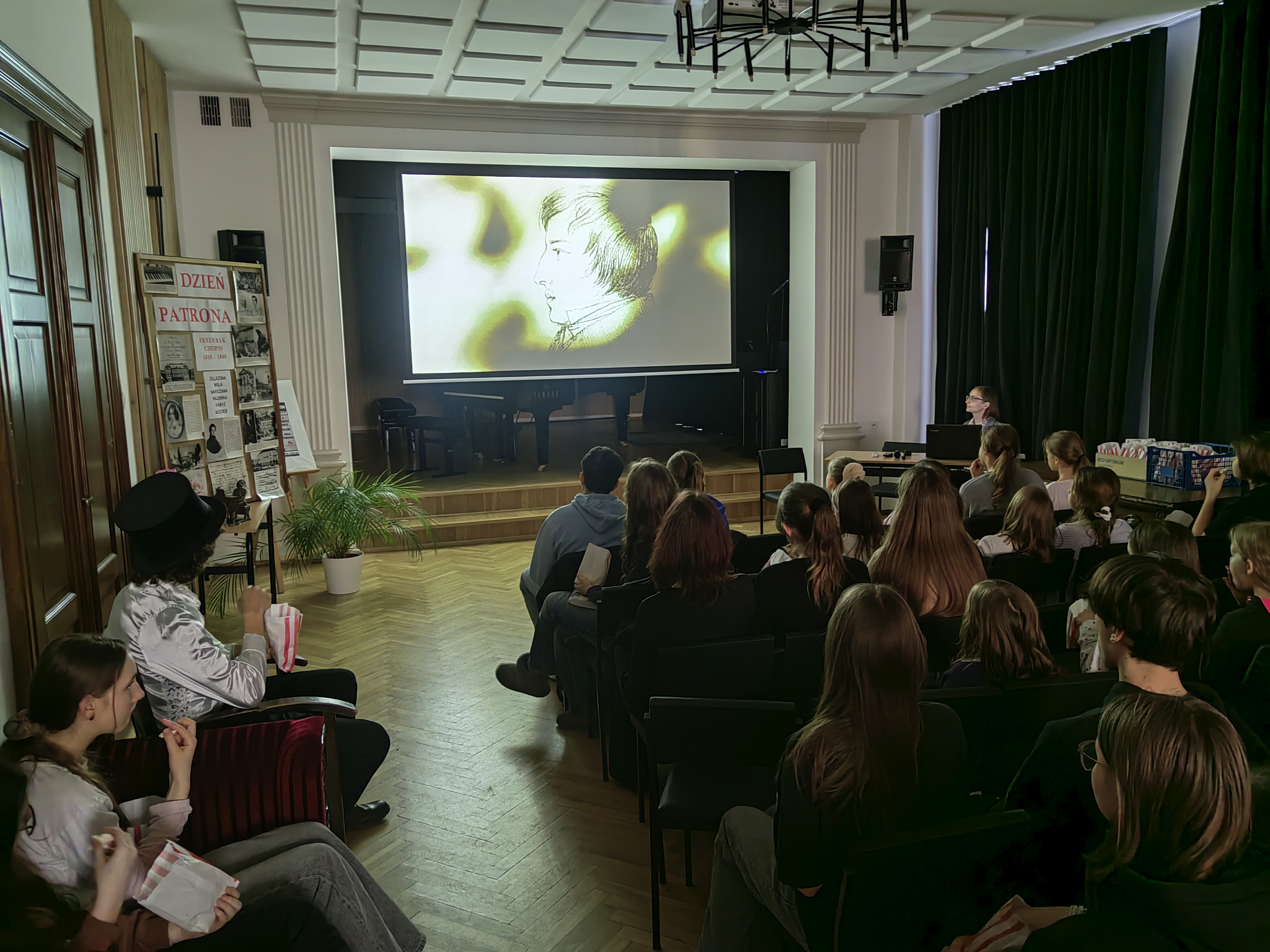 Po uroczystym powitaniu genialnego artysty, odbyła się prezentacja filmowa "Wakacje z Chopinem w Szafarni". P. Angelika Strzygocka przedstawiła sylwetki wybitnych polskich pianistów: Krystiana Zimermana i Rafała Blechacza, laureatów pierwszych nagród w Międzynarodowym Konkursie Pianistycznym im. Fryderyka Chopina w Warszawie w 1975 r. i 2005 r. Usłyszeć można było także fortepian firmy Pleyel pod palcami kanadyjskiego pianisty Erica Guo, zdobywcy 1 miejsca w Międzynarodowym Konkursie Chopinowskim na Instrumentach Historycznych w 2023 r. oraz poznać brzmienie i historię kopii zrekonstruowanego w 2018 r. fortepianu Bucholtza, na którym ćwiczył młody F. Chopin. Podczas seansu filmowego oczywiście obowiązkowo był popcorn. Dziękujemy za organizację spotkania p. Angelice Strzygockiej, p. Dominikowi Jarockiemu, p. Iwonie Sonce, p. Katarzynie Mące-Żelazko, p. Karolinie Lizurej, p. Krystynie Ślęzak oraz p. Marcinowi Górskiemu.