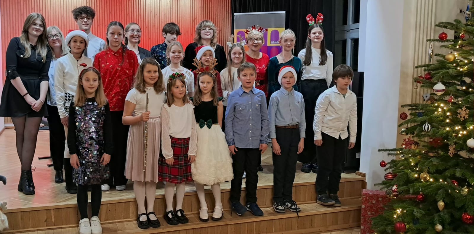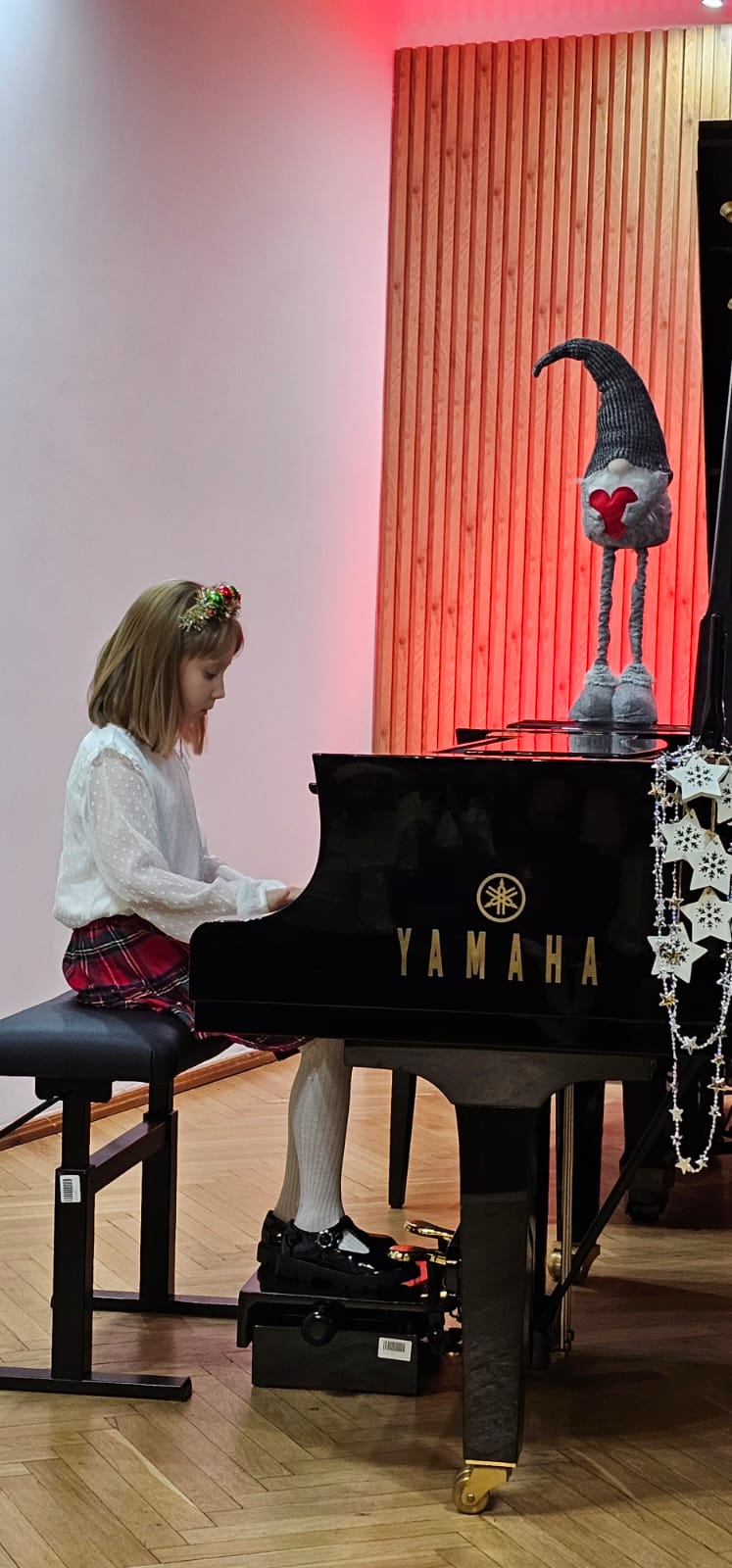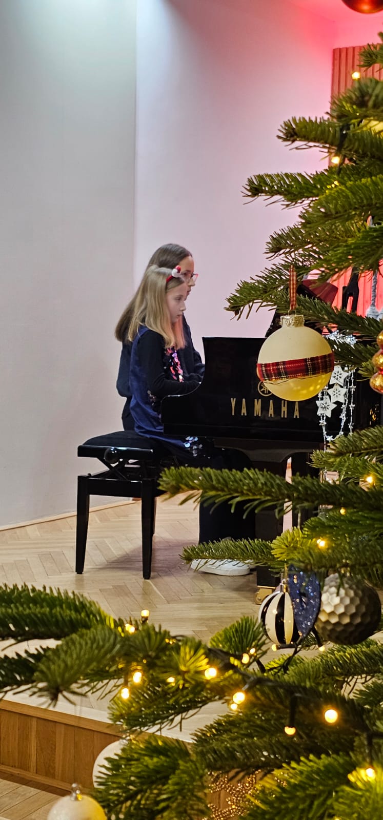Młodzi pianiści przygotowali wspaniałe prezenty muzyczne. Oprócz występów solowych wystąpił fortepianowy duet rodzinny w składzie: Anna Podobińska razem z mamą panią Magdaleną, gościliśmy na scenie również duety fletowo-fortepianowe w składzie Milena Migrała i Kinga Petelska oraz Maja Gałązka i Natalia Bednarska . Gratulujemy wszystkim młodym artystom wspaniałych występów . Dziękujemy za przygotowanie uczniów paniom: Elżbiecie Malinowskiej , Bożenie Adamskiej🪈, Katarzynie Gałczyńskaiej i Angelice Strzygockiej , która również zorganizowała koncert