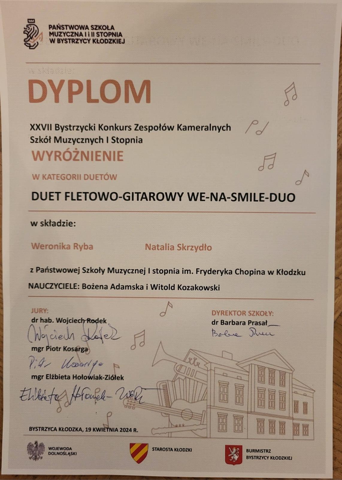 Wyróżnienie zdobył DUET FLETOWO-GITAROWY WE-NA-SMILE-DUO w składzie: Weronika Ryba i Natalia Skrzydło, z klasy pani Bożeny Adamskiej i pana Witolda Kozakowskiego.