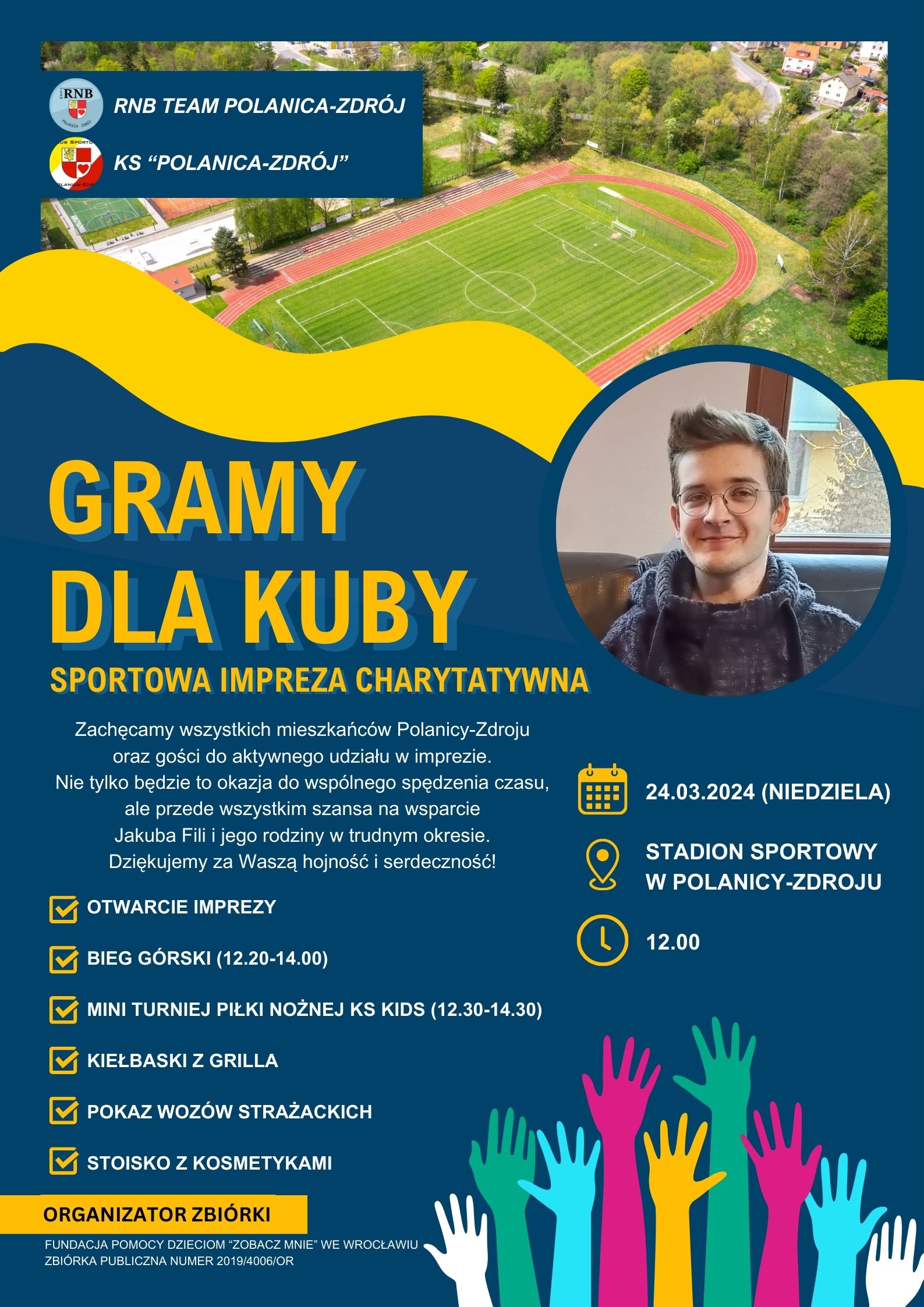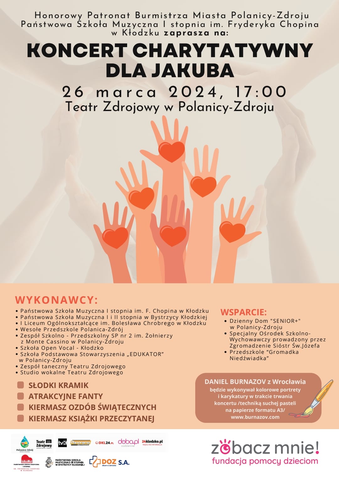 W akcji charytatywnej udział wzięli uczniowie PSM I st.w Kłodzku również dzieci z kłodzkich przedszkoli nr 2 i 4, szkół podstawowych nr 3, 6 i 7, I Liceum Ogólnokształcącego im. B. Chrobrego oraz Studio Tańca Nowoczesnego FIKANDER i szkoła wokalna OPEN VOCAL działające przy KOK. Jesteśmy z Tobą Kubo! Dziękujemy wszystkim darczyńcom, wolontariuszom, wykonawcom, rodzicom uczniów, naszym przyjaciołom za udział w koncercie! Organizator zbiórki publicznej Fundacja "Zobacz mnie" poinformuje o wysokości zebranej kwoty na leczenie Kuby po zakończeniu wszystkich imprez charytatywnych.