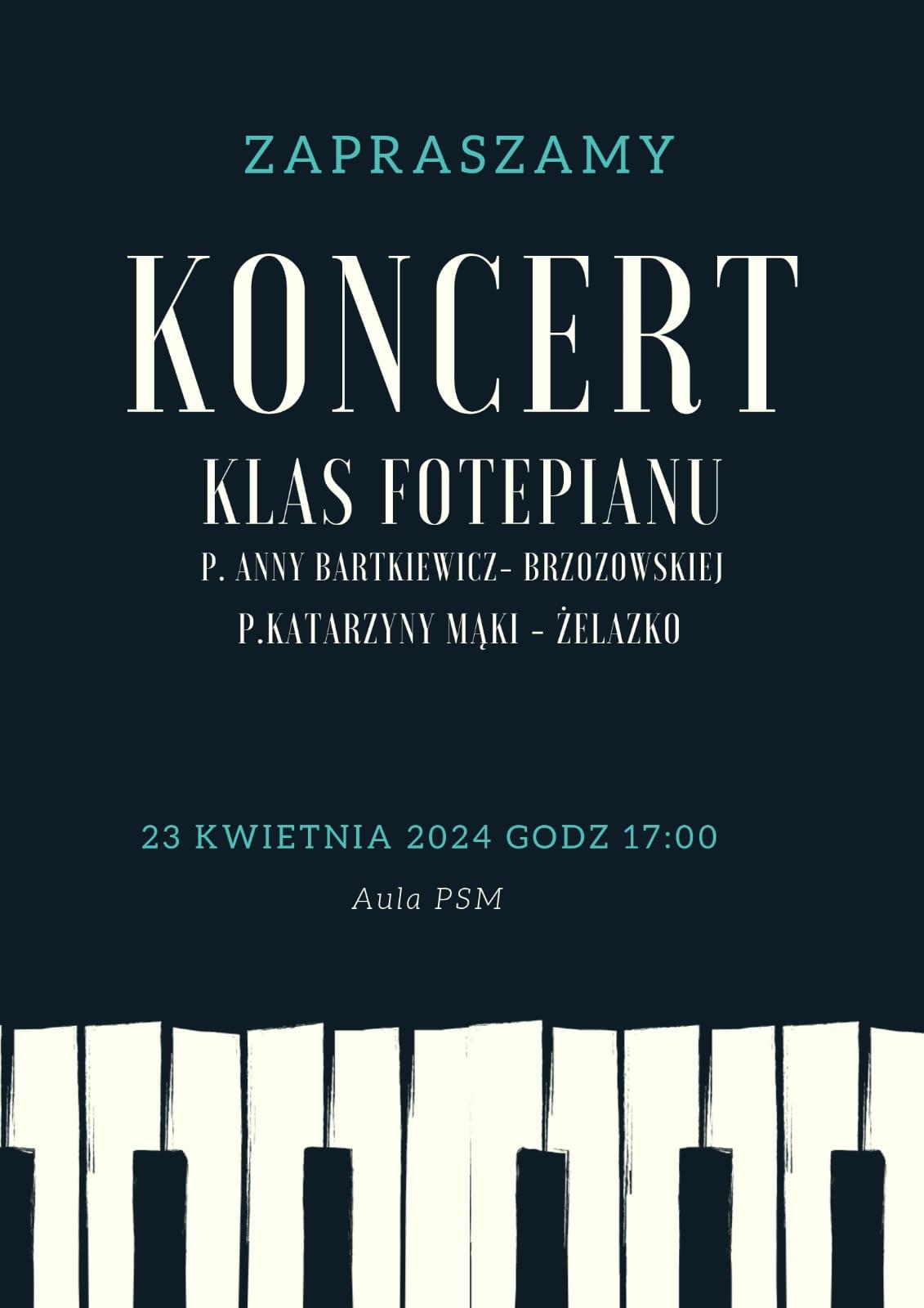 Plakat na czarnym tle z informacją tekstową dotyczącą koncertu klas fortepianu P. A. Bartkiewicz-Brzozowskiej i P. K. Mąki-Żelazko - 23 kwietnia 2024