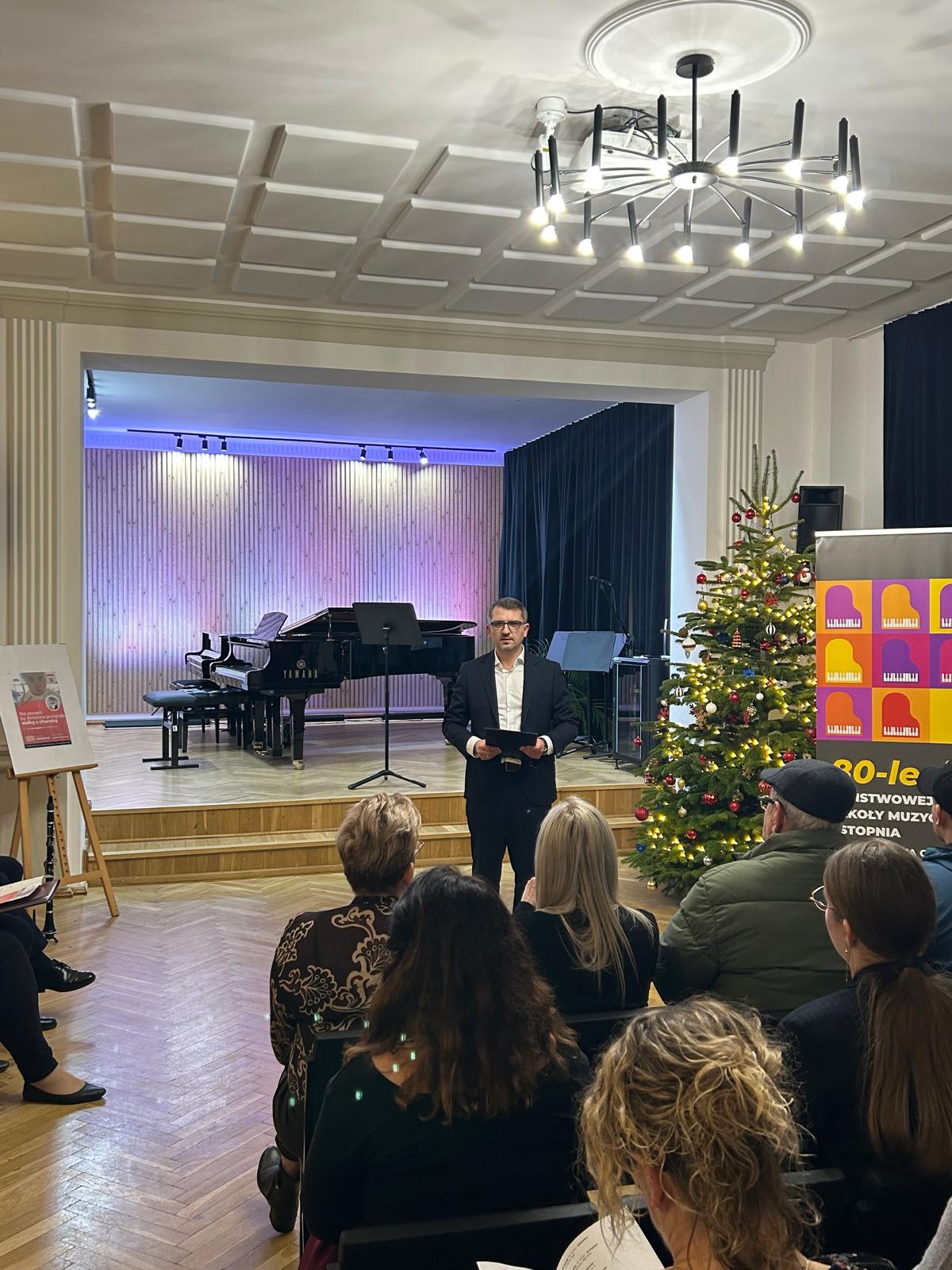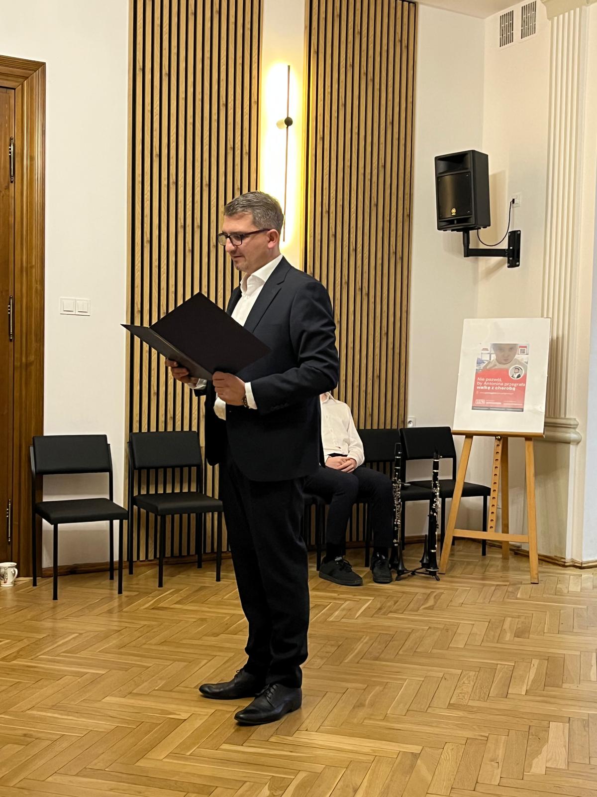 p. Przemysław Polak, nauczyciel klasy klarnetu w Państwowej Szkole Muzycznej I stopnia im. Fryderyka Chopina w Kłodzku.Jest nim chęć niesienia pomocy dla Antoniny Minginowicz uczennicy Szkoły Podstawowej nr 44 we Wrocławiu, która zachorowała na Chłoniaka Hodgkina, co wiąże się z kosztownym leczeniem i dalszą rehabilitacją. Podczas koncertu promowana była zbiórka środków, właśnie dla Tosi🍀Bardzo serdecznie dziękujemy, za liczne przybycie, za wsparcie i pomoc, a naszym wykonawcom gratulujemy udanego koncertu👏👏👏🤗