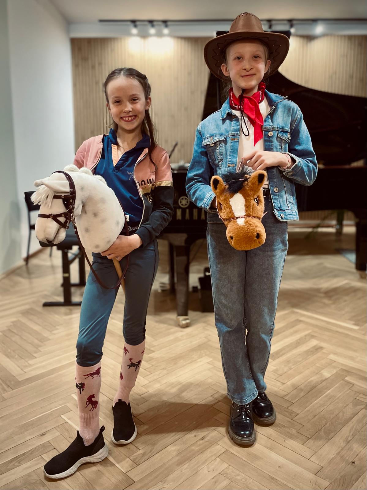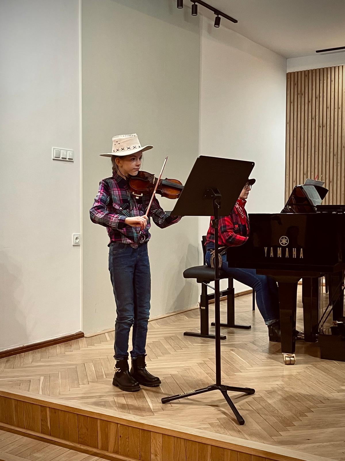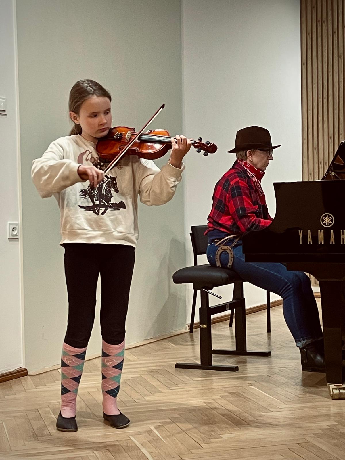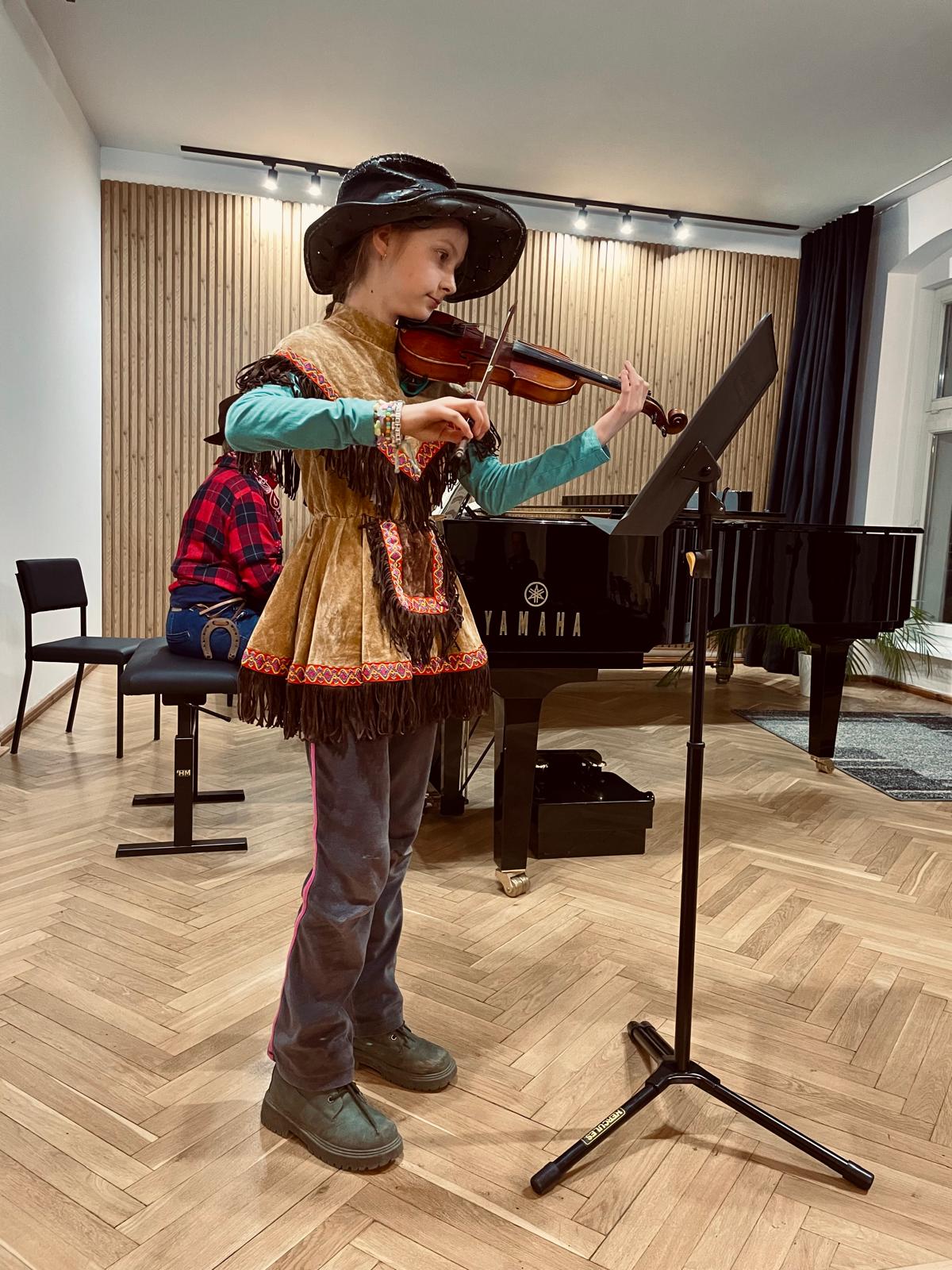 Usłyszeliśmy przepiękne wykonania utworów z katalogu muzyki instrumentalnej o tematyce konnej, kowbojskiej i innych podobnych kopytnych zwierząt. Wystąpili pianiści i skrzypkowie przy akompaniamencie P. Elżbiety Malinowskiej. Po części muzycznej dzieci miały okazję porozmawiać o swoich hobby przy herbatce i pysznych smakołykach, na które niejeden koń by się skusił. Na szczególne uznanie zasługuje uczennica, Maja Tarasiewicz, z klasy skrzypiec P. Karoliny Lizurej, która z ogromnym zaangażowaniem brała udział w organizacji tej imprezy.