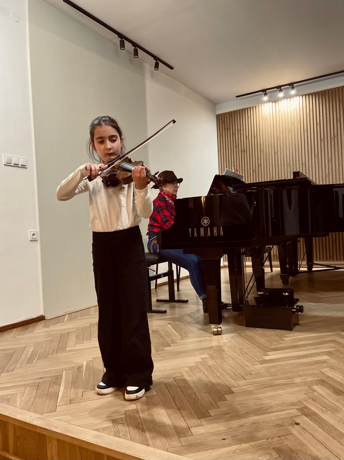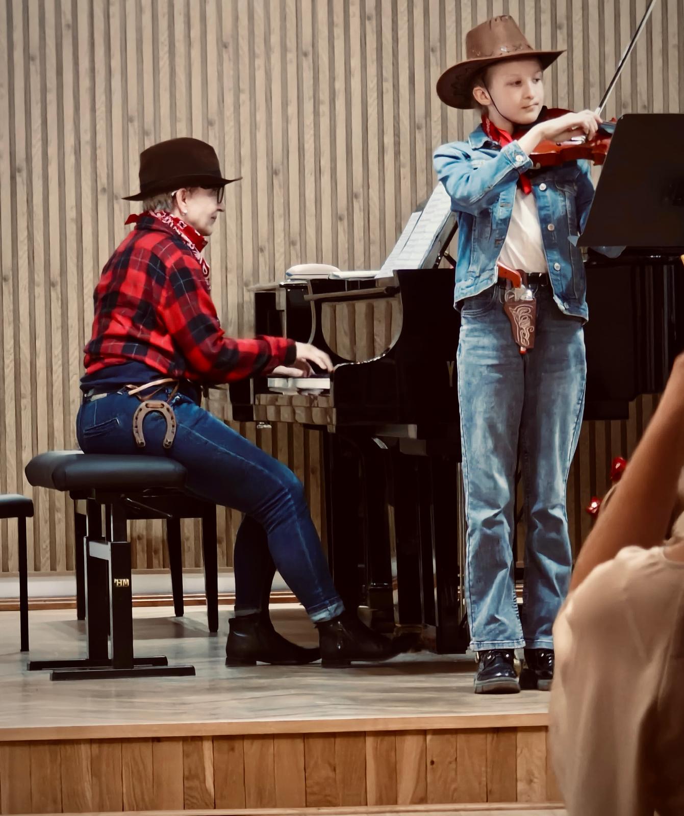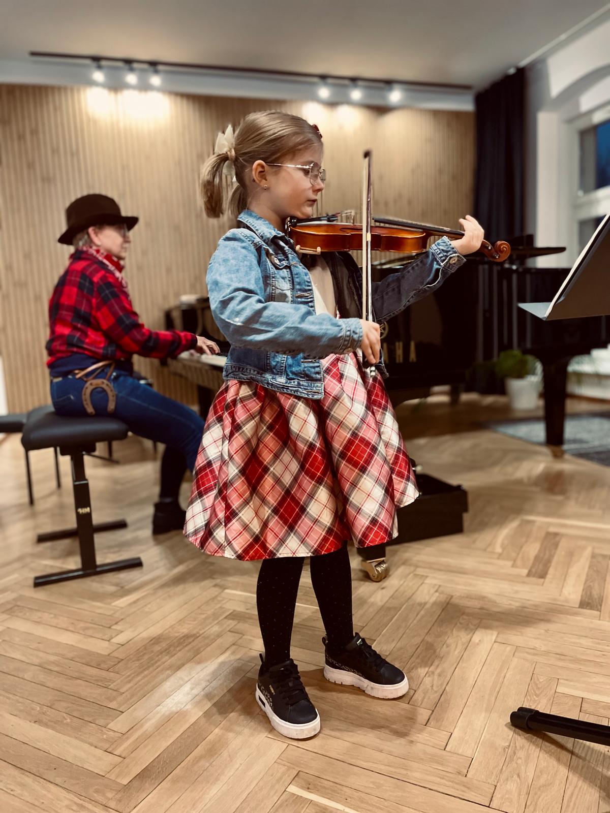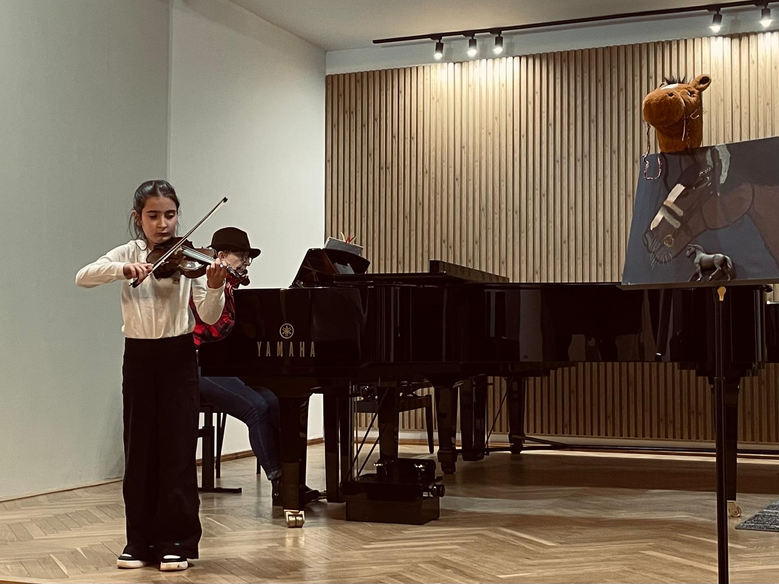 Usłyszeliśmy przepiękne wykonania utworów z katalogu muzyki instrumentalnej o tematyce konnej, kowbojskiej i innych podobnych kopytnych zwierząt. Wystąpili pianiści i skrzypkowie przy akompaniamencie P. Elżbiety Malinowskiej. Po części muzycznej dzieci miały okazję porozmawiać o swoich hobby przy herbatce i pysznych smakołykach, na które niejeden koń by się skusił. Na szczególne uznanie zasługuje uczennica, Maja Tarasiewicz, z klasy skrzypiec P. Karoliny Lizurej, która z ogromnym zaangażowaniem brała udział w organizacji tej imprezy.