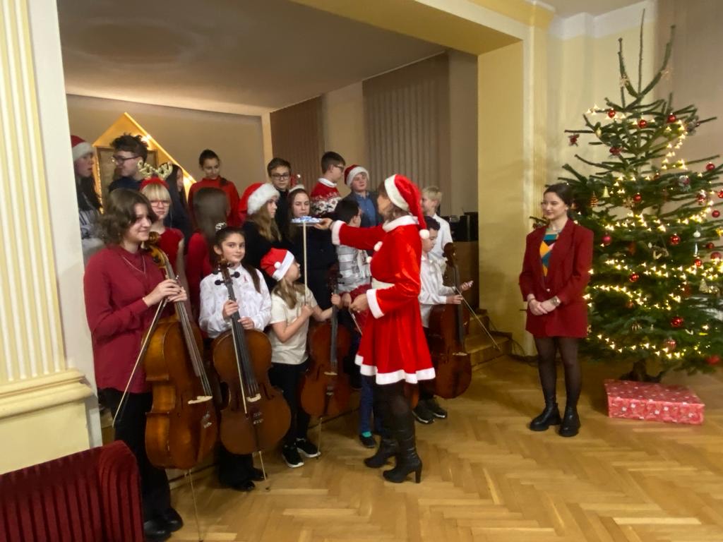 Dnia 7 grudnia 2023 r. w auli naszej szkoły odbył się Mikołajkowy Koncert klasy fortepianu mgr Joanny Kocyan i klasy wiolonczeli mgr Patrycji Machały. Uczniowie zaprezentowali bardzo zróżnicowany repertuar: zaczynając od popularnych piosenek i znanych melodii, poprzez utwory muzyki klasycznej, a kończąc na przepięknych polskich kolędach.