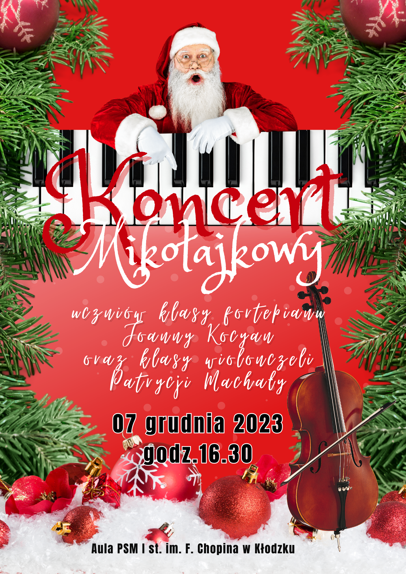 Koncert mikołajkowy uczniów klasy fortepianu P. J.Kocyan oraz klasy wiolonczeli P. P. Machały - 07 grudnia 2023