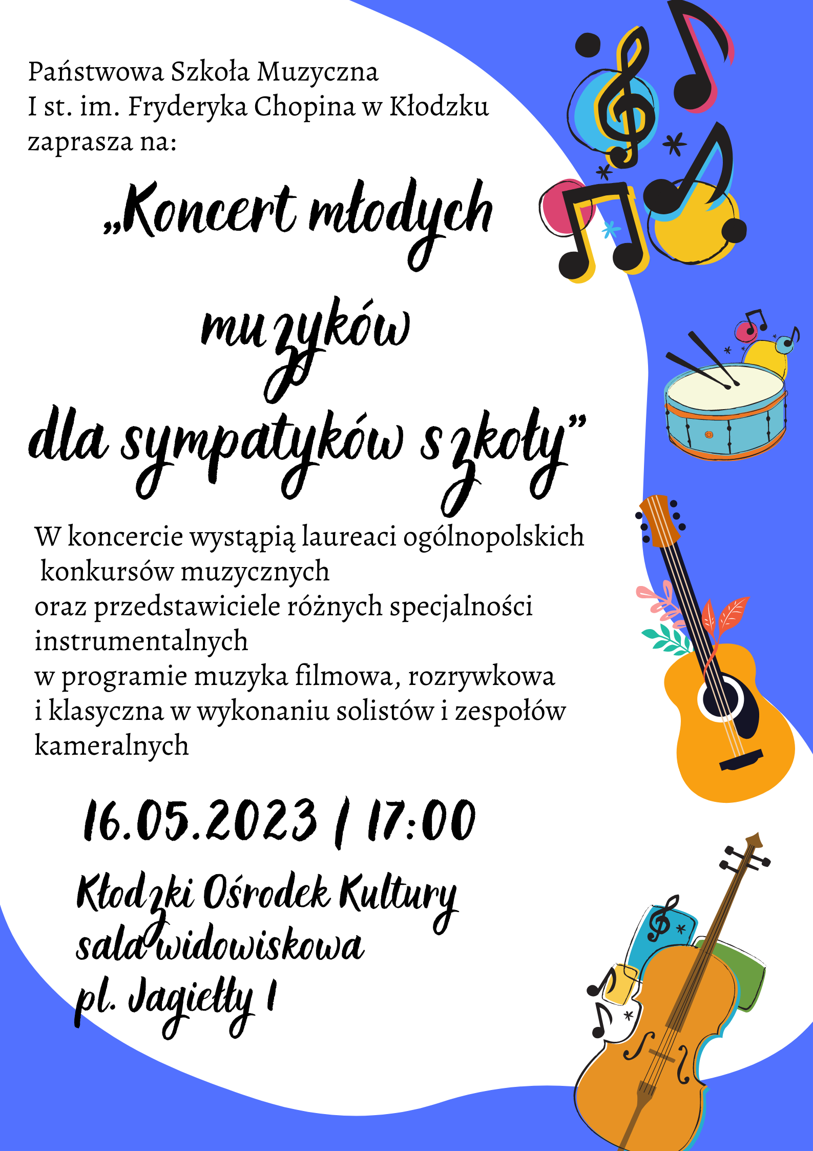 W dniu 16 maja 2023 r. w Kłodzkim Ośrodku Kultury odbył się ,,Koncert młodych muzyków dla sympatyków szkoły”. Jest to połączenie dwóch już kiedyś organizowanych przez szkołę wydarzeń, czyli ,,Promocji młodych muzyków kłodzkich” oraz ,,Koncertu dla sympatyków szkoły muzycznej”.