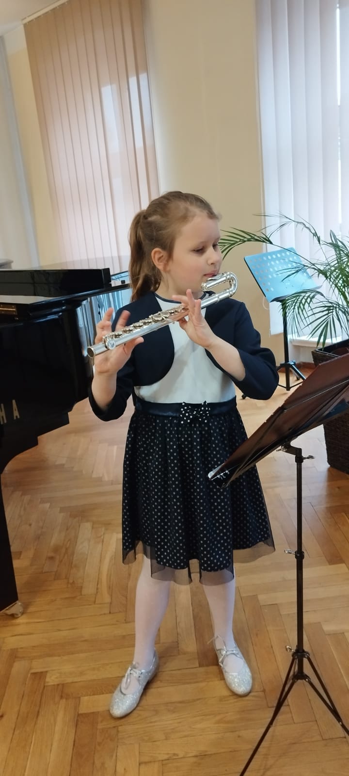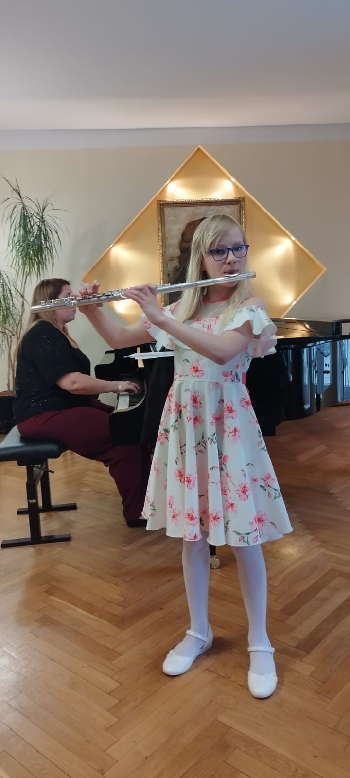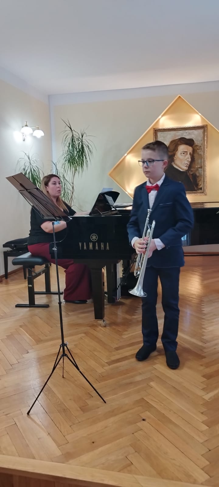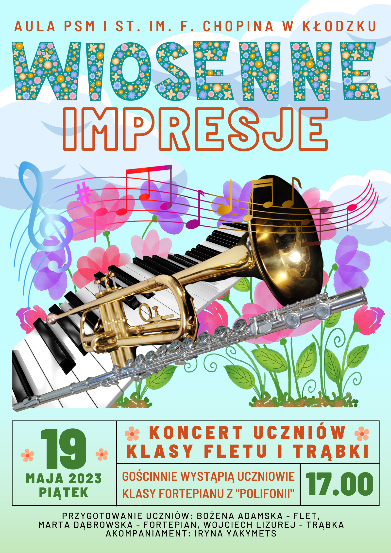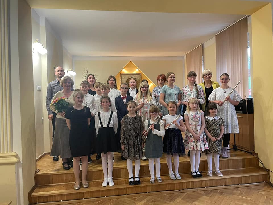 19 maja 2023 r. na koncercie ,,Wiosenne impresje" mogliśmy wysłuchać prezentacji muzycznych uczniów klasy fletu p. Bożeny Adamskiej i klasy trąbki p. Wojciecha Lizureja.