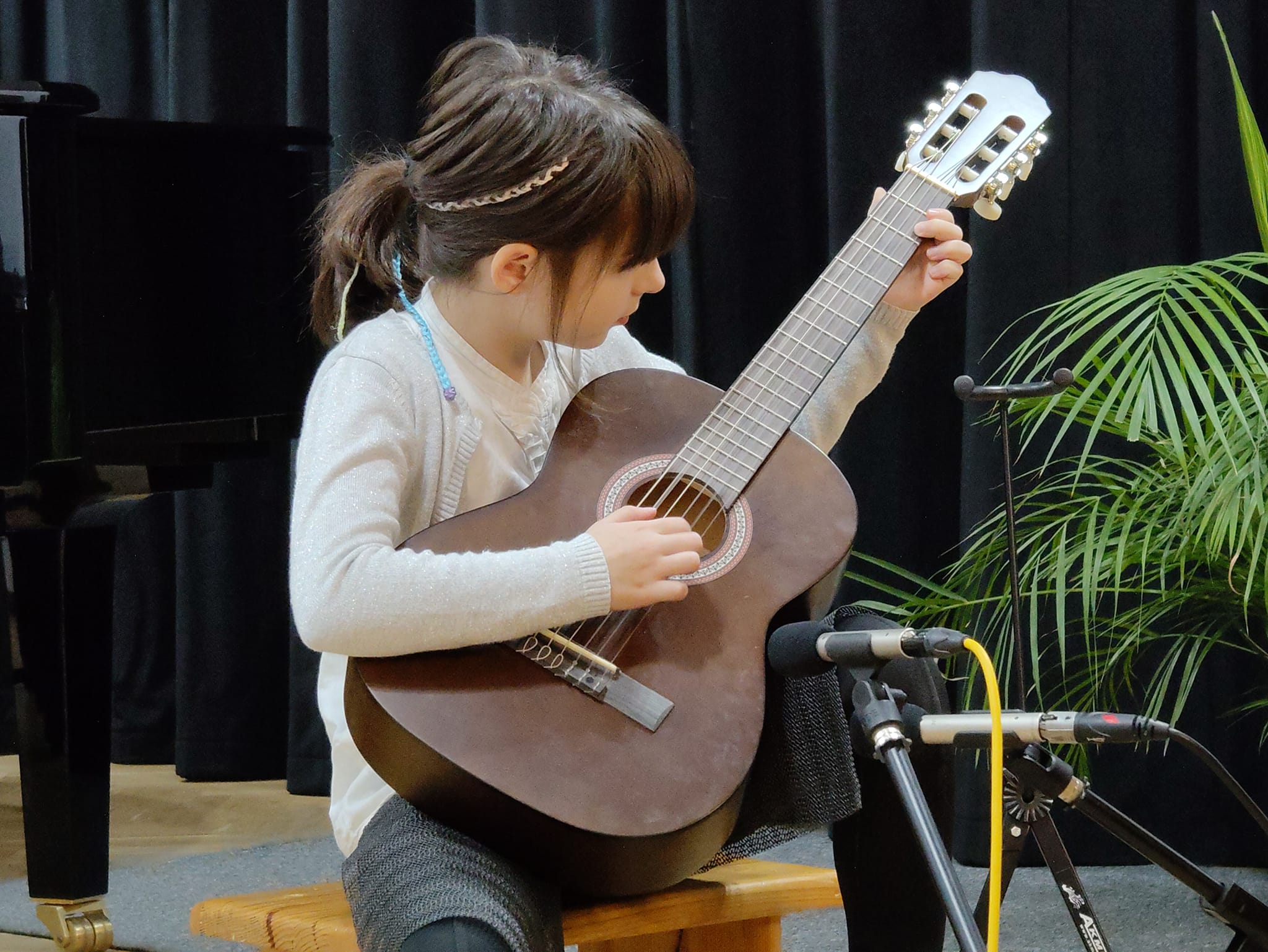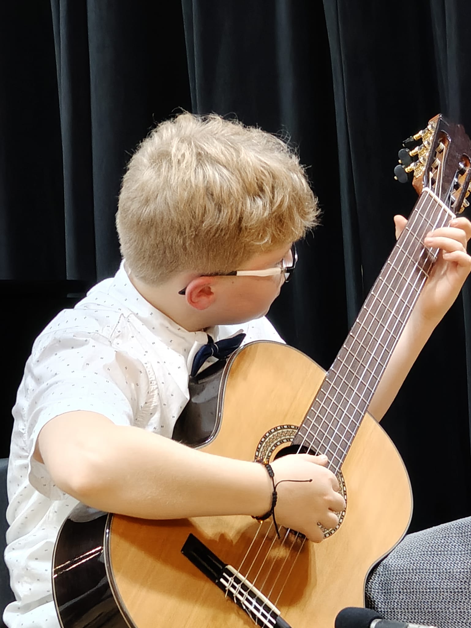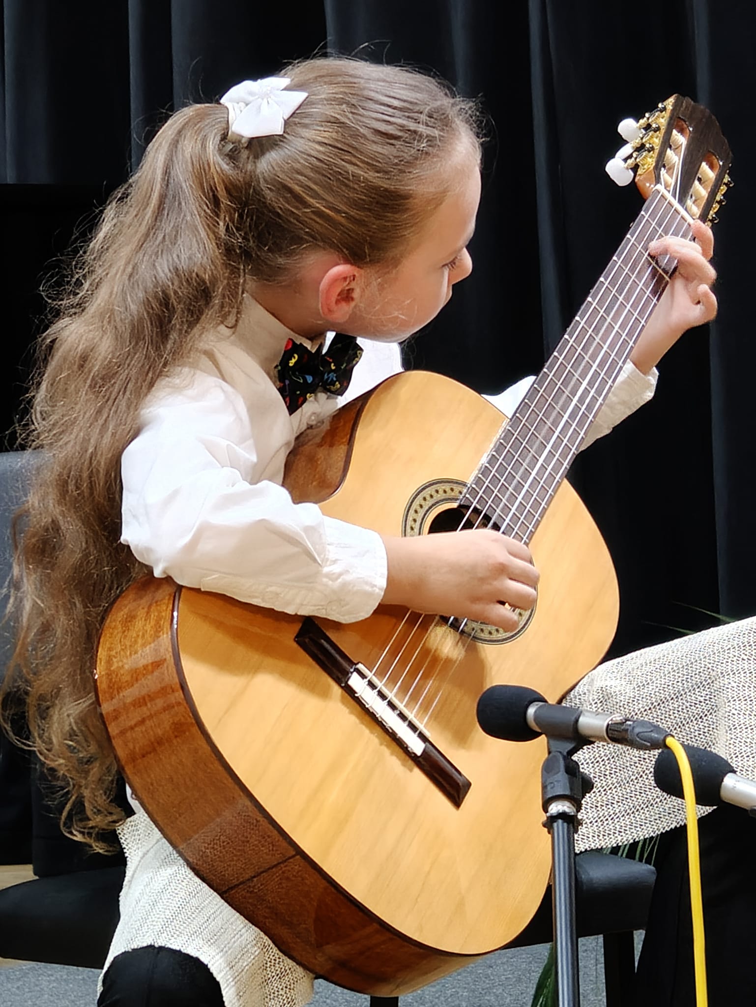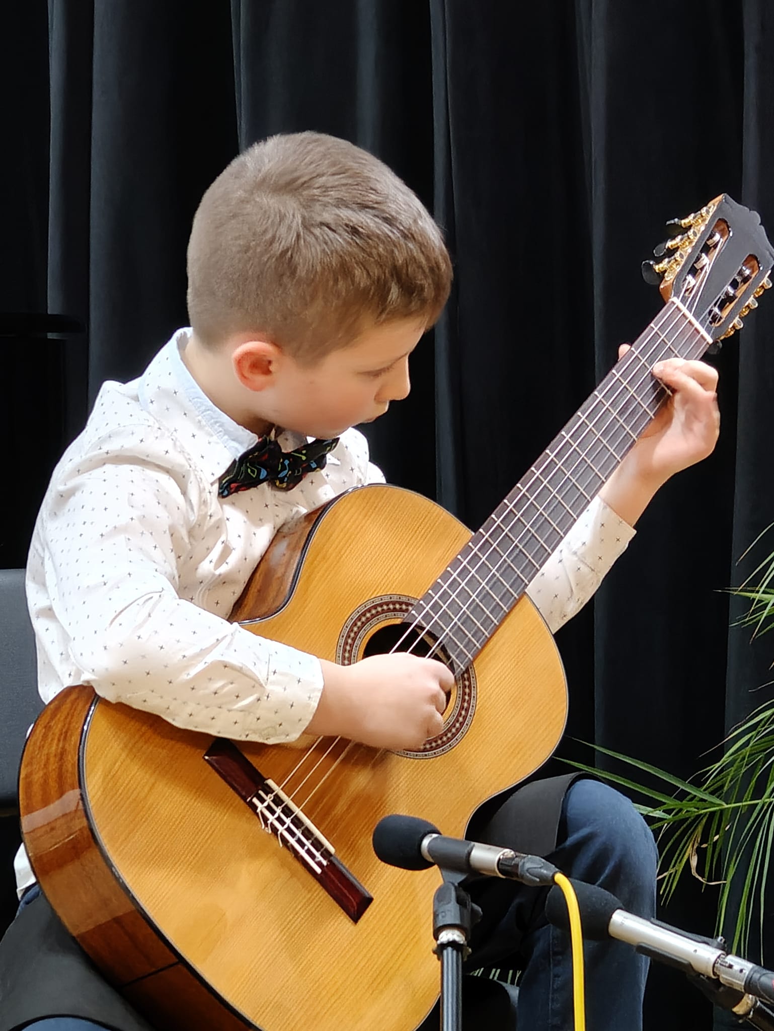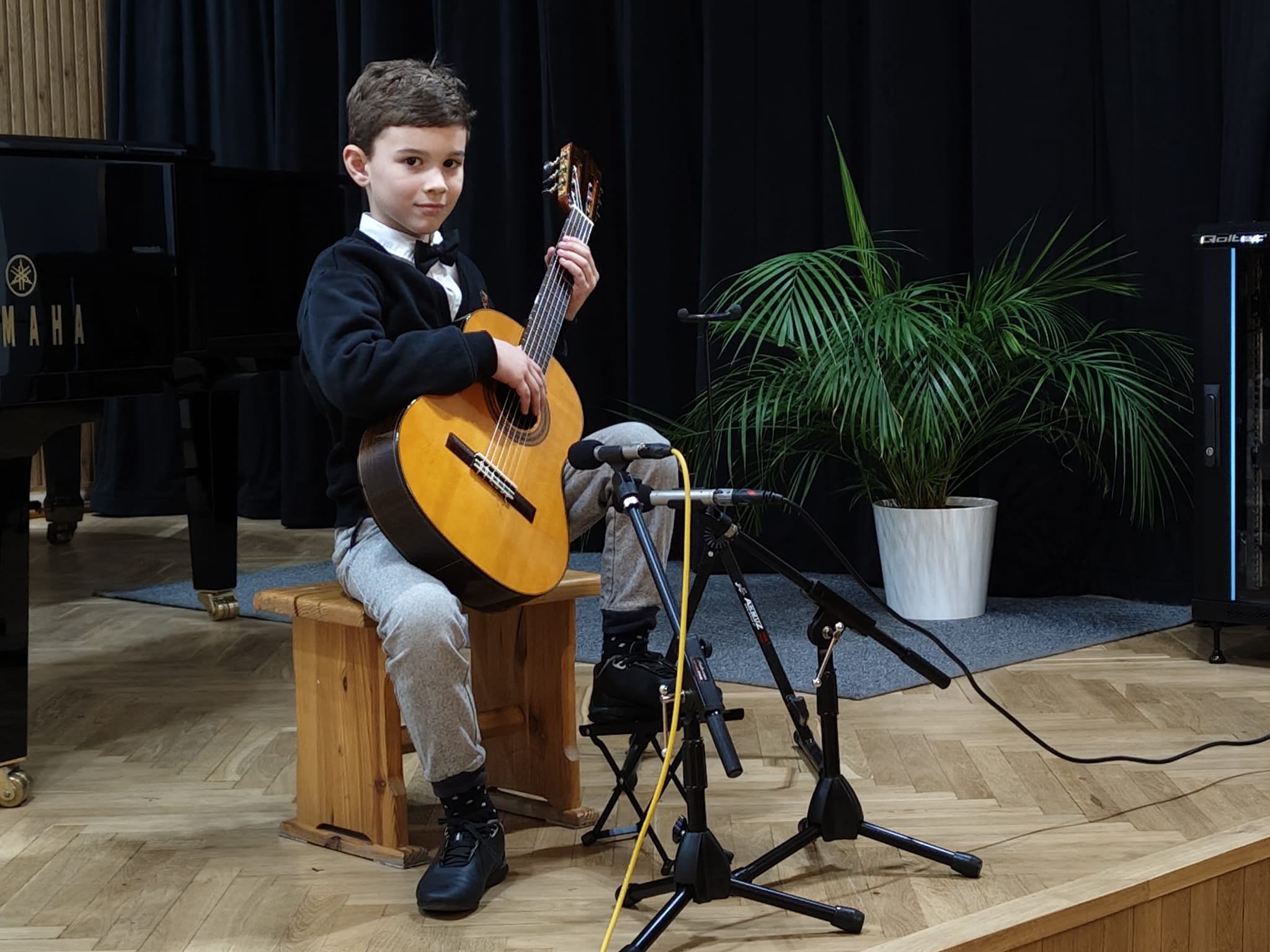 Licznie zgromadzona publiczność gromkimi brawami nagradzała kolejne prezentacje. Koncert był szczególnie ważny dla tegorocznych Pierwszaków, którzy po raz pierwszy - solo lub w duecie z nauczycielem - wystąpili na szkolnej estradzie. Gratulacje dla wszystkich gitarzystów!