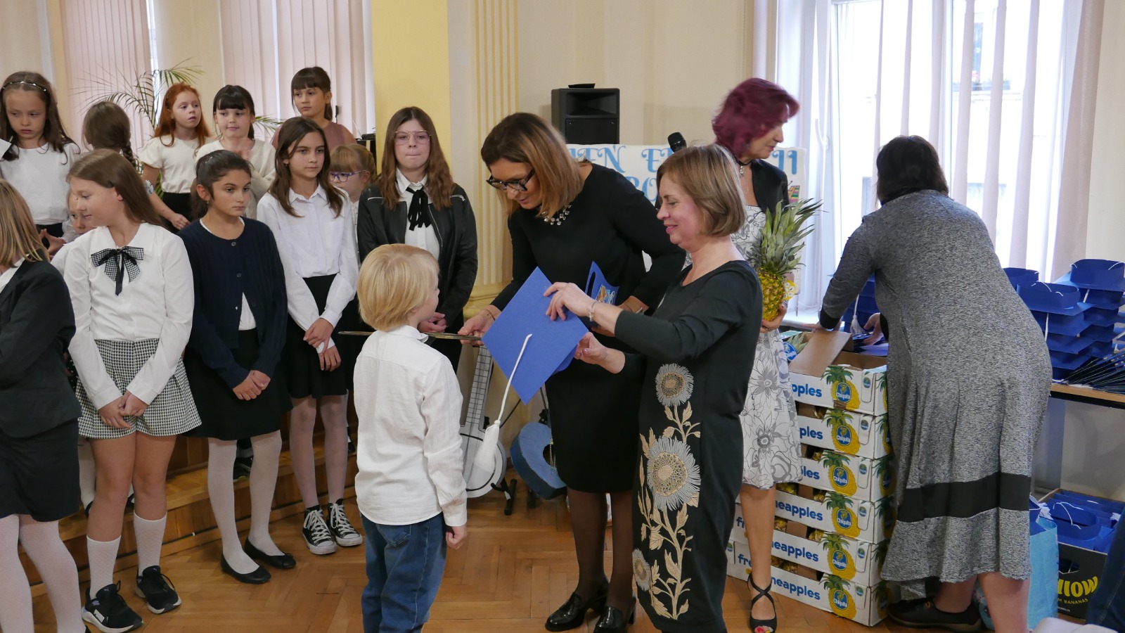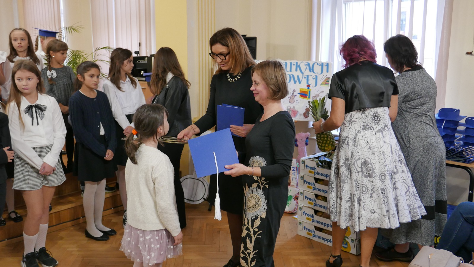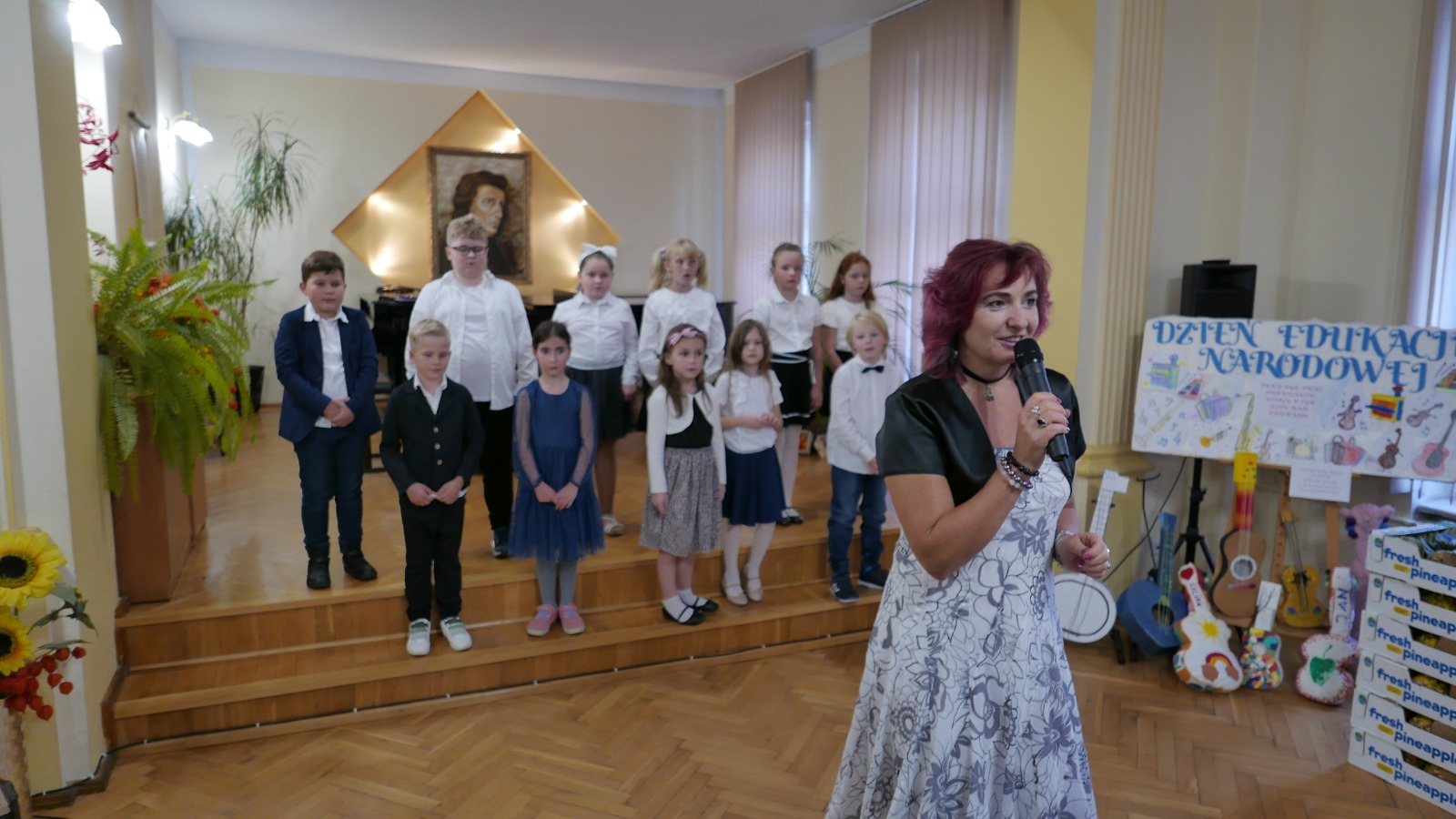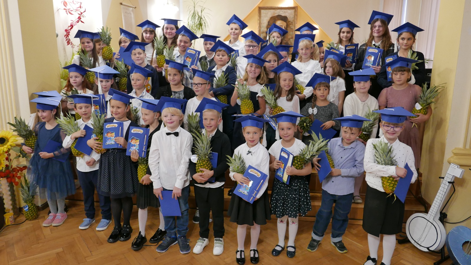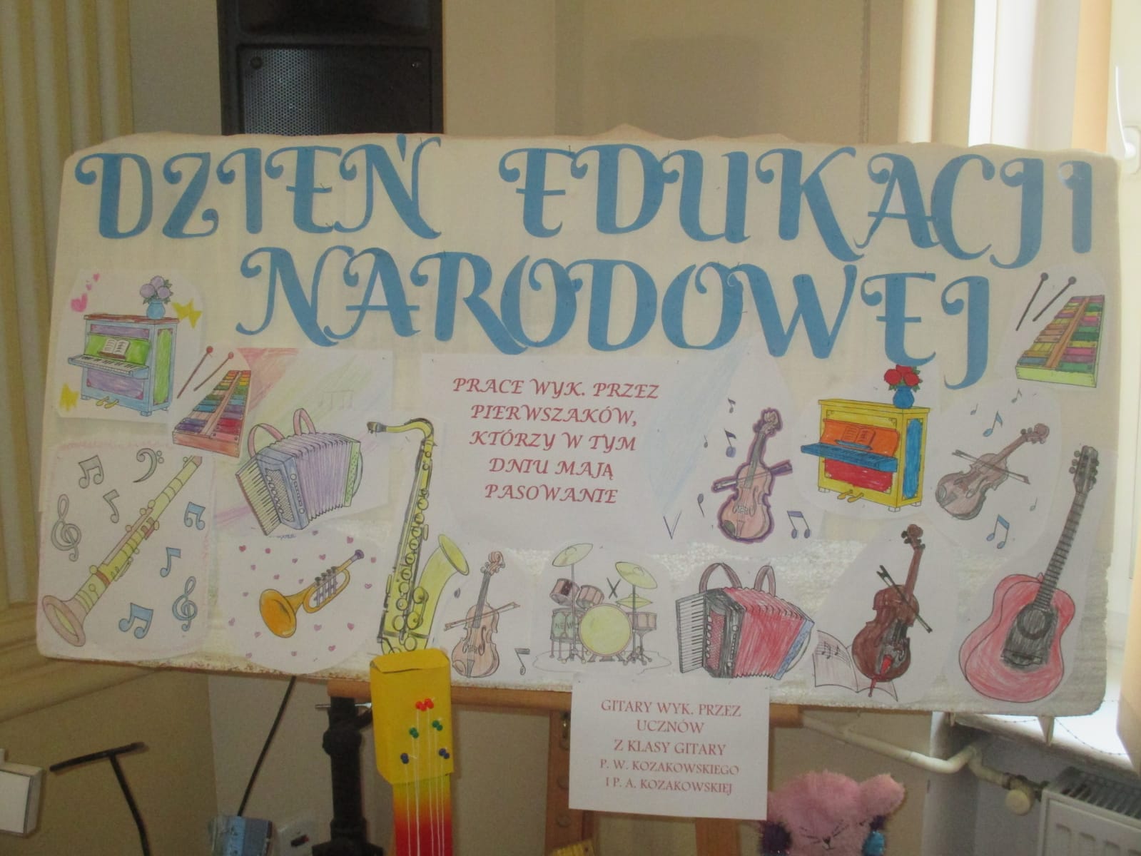 Pierwsza część koncertu należała zdecydowanie do najmłodszych adeptów sztuki muzycznej, którzy bardzo odważnie wykonali dwie piosenki- „My, właśnie my” (klasa I a ) oraz „Pierwszakowy taniec” (klasa I b) by następnie razem z pierwszakową młodzieżą cyklu 4-letniego złożyć uroczystą przysięgę oraz poddać się jakże miłej ceremonii ukoronowaniem której było otrzymanie pamiątkowego dyplomu, czapeczki oraz- jako, że szkoła promuje zdrowy styl życia- ananasa. Było uroczyście ale i bardzo radośnie, czego dowodem jest pamiatkowa fotografia „Ananasów z pierwszej klasy”. Dalsza część koncertu poświęcona była Świętu Edukacji Narodowej. Prowadząca koncert – p. Joanna Kocyan- bardzo interesująco opowiedziała o nieznanych ciekawostkach dotyczących tego dnia i włączyła licznie zgromadzoną publiczność do wspólnego quizu. W części artystycznej zaprezentowali się uczniowie różnych specjalności- gitary, akordeonu fortepianu, klarnetu, fletu oraz skrzypiec w bardzo ciekawym, żywiołowym repertuarze korespondującym z radosnym nastrojem tego wieczoru. Wystąpiło również dwie pierwszoklasistki Laura Wołoch oraz Aleksandra Trójniak, które swoimi bardzo udanymi pierwszymi scenicznymi udanymi występami zebrały ogromne brawa. Jako, że Święto Edukacji jest okazją do honorowania osiągnięć pedagogów dyr Anna Bartkiewicz- Brzozowska wręczyła Nagrody Centrum Edukacji Artystycznej za wybitne osiągnięcia w pracy pedagogicznej oraz i za pracę innowacyjną w zakresie działań dydaktyczno-wychowawczych. Otrzymali je p. Katarzyna Mąka oraz p. Witold Kozakowski. Nagrody Dyrektora szkoły wręczone zostały wszystkim nauczycielom i pracownikom szkoły zaś dodatkowym prezentem były przygotowane przez Samorząd Szkolny własnoręcznie wykonane zakładki. Salę na koncert udekorowały dzieci z klasy pierwszej tworząc przepiękne prace plastyczne zaś klasa p. Witolda Kozakowskiego udostępniła ...gitary swoich marzeń! Było pluszowo i kolorowo. Życzymy wszystkim Pierwszakom abyście mierzyli wysoko i podążali własną drogą a wszystkim Pedagogom satysfakcji zawodowej i wielu, wielu sukcesów i radości.