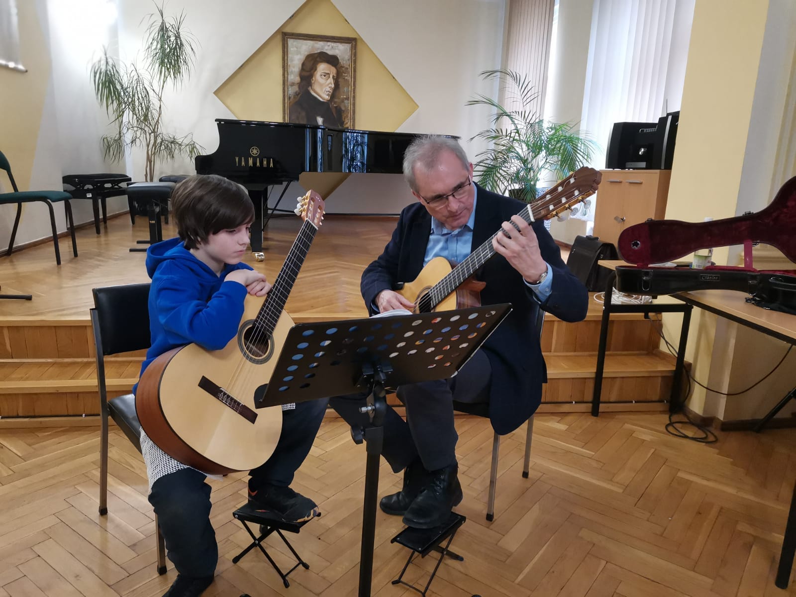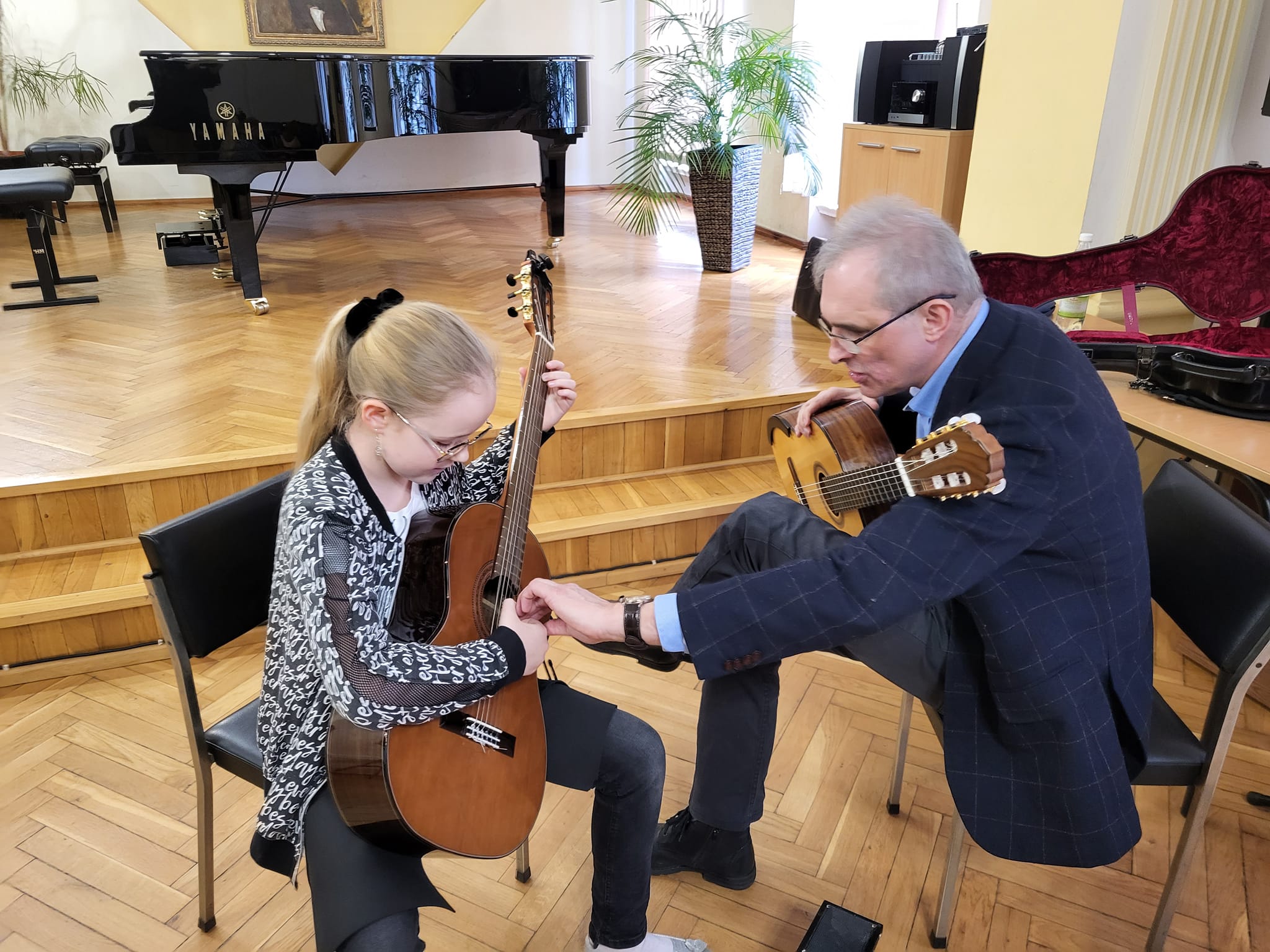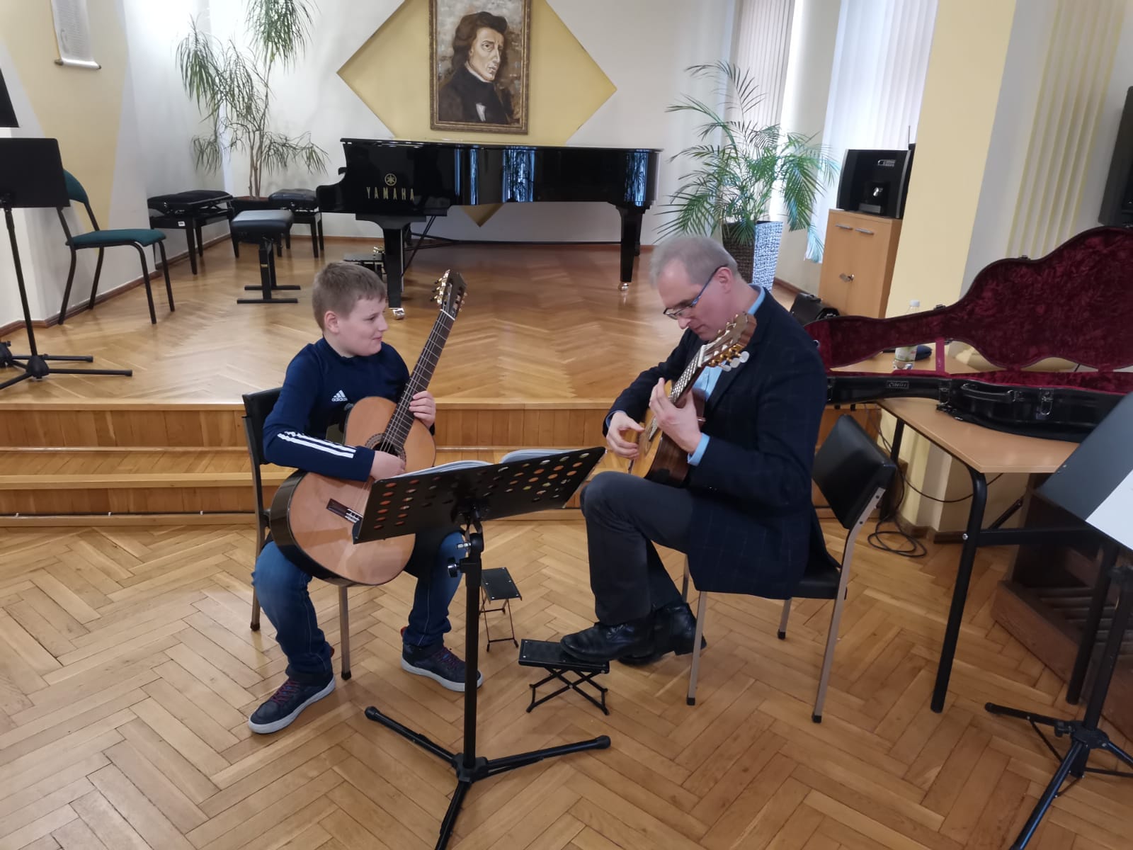 Najpierw wszyscy uczniowie klasy gitary wraz z rodzicami i nauczycielami gry na gitarze, wysłuchali ciekawej prelekcji o zasadach prawidłowego ćwiczenia na instrumencie w domu. Następnie wybrani soliści oraz zespół kameralny, pracowali pod okiem p. Wieczorka w ramach otwartych lekcji (pozostali uczniowie mogli obserwować zajęcia jako uczestnicy bierni). To był bardzo inspirujący gitarowy dzień w naszej szkole!