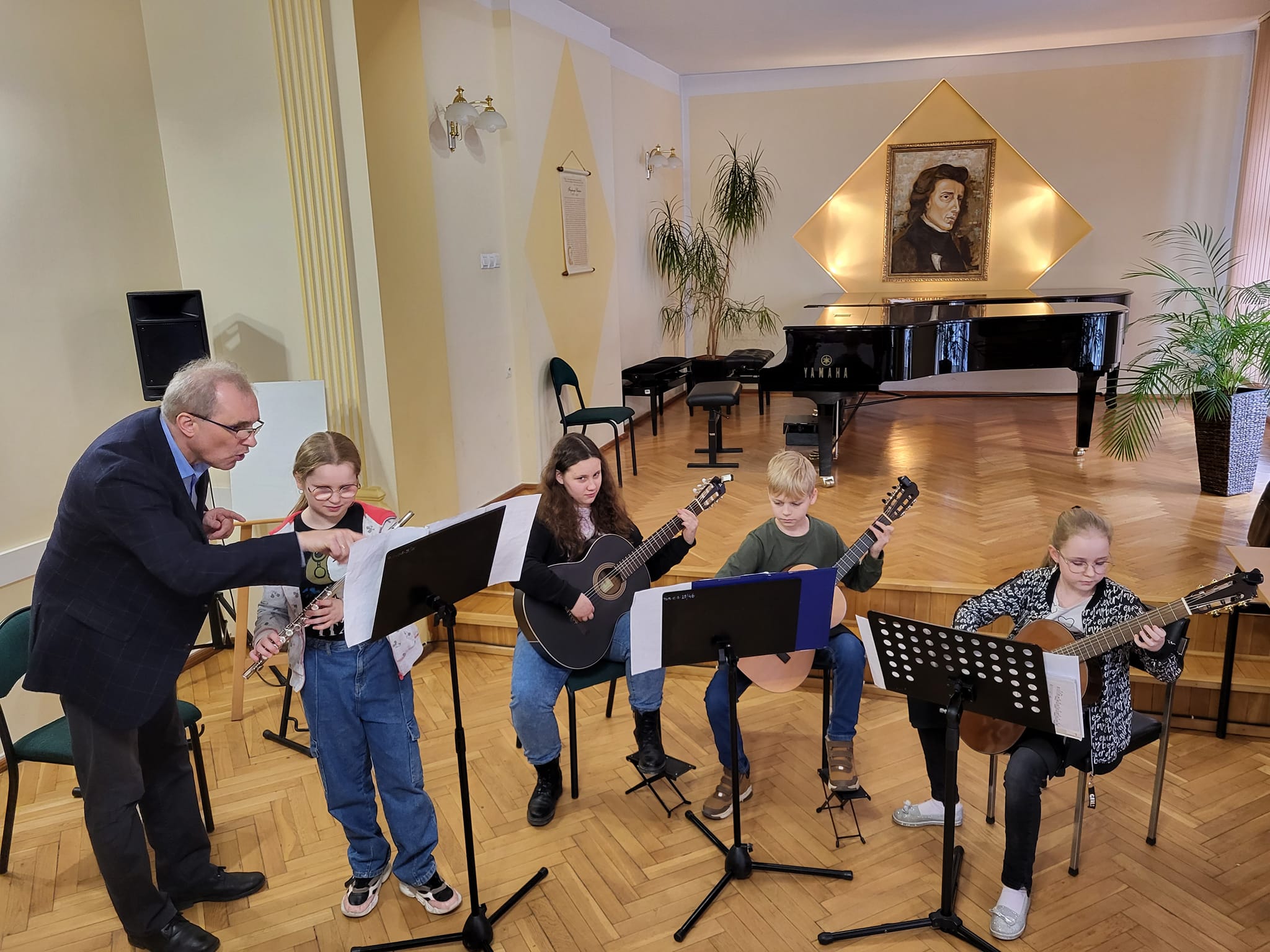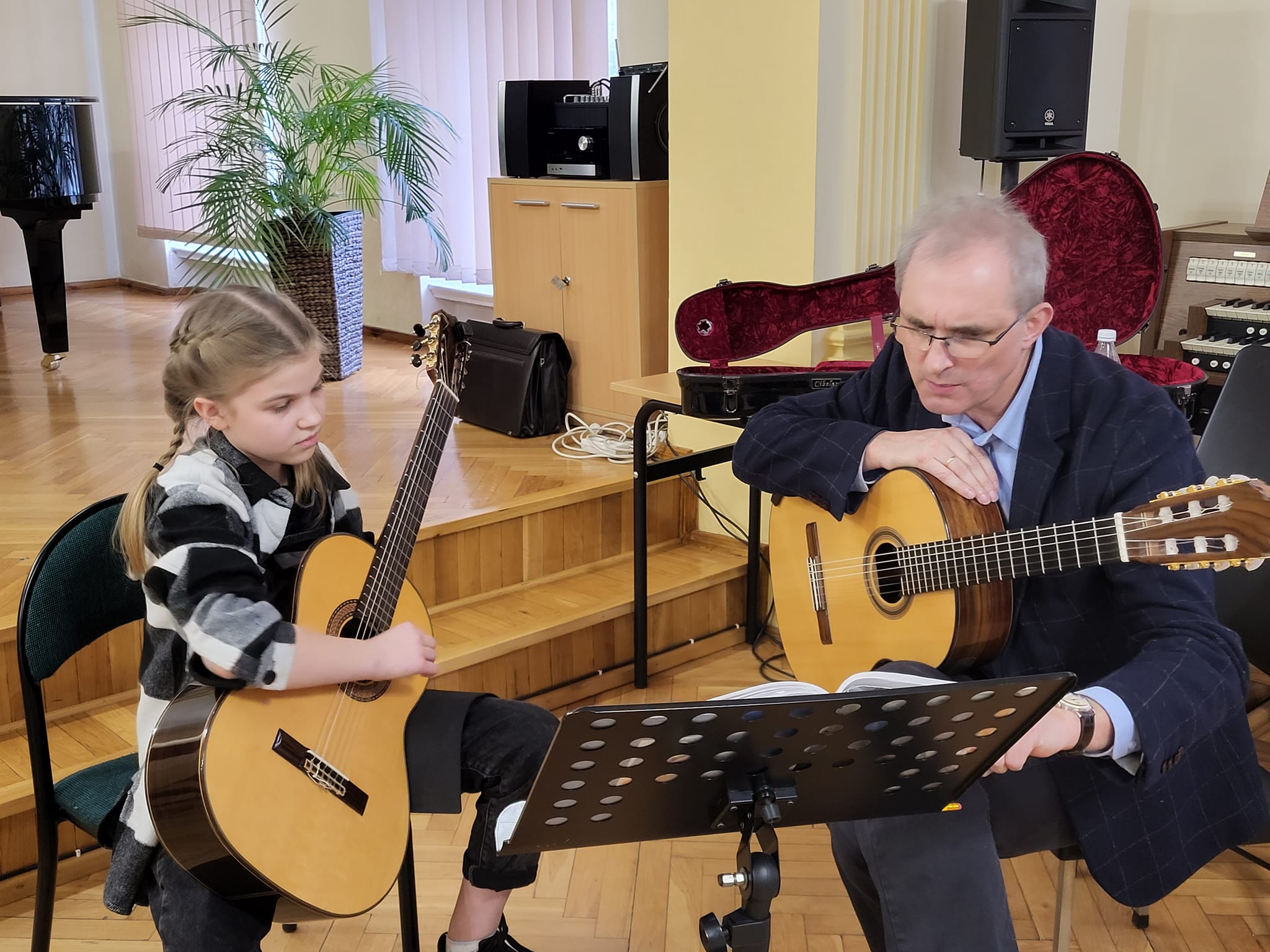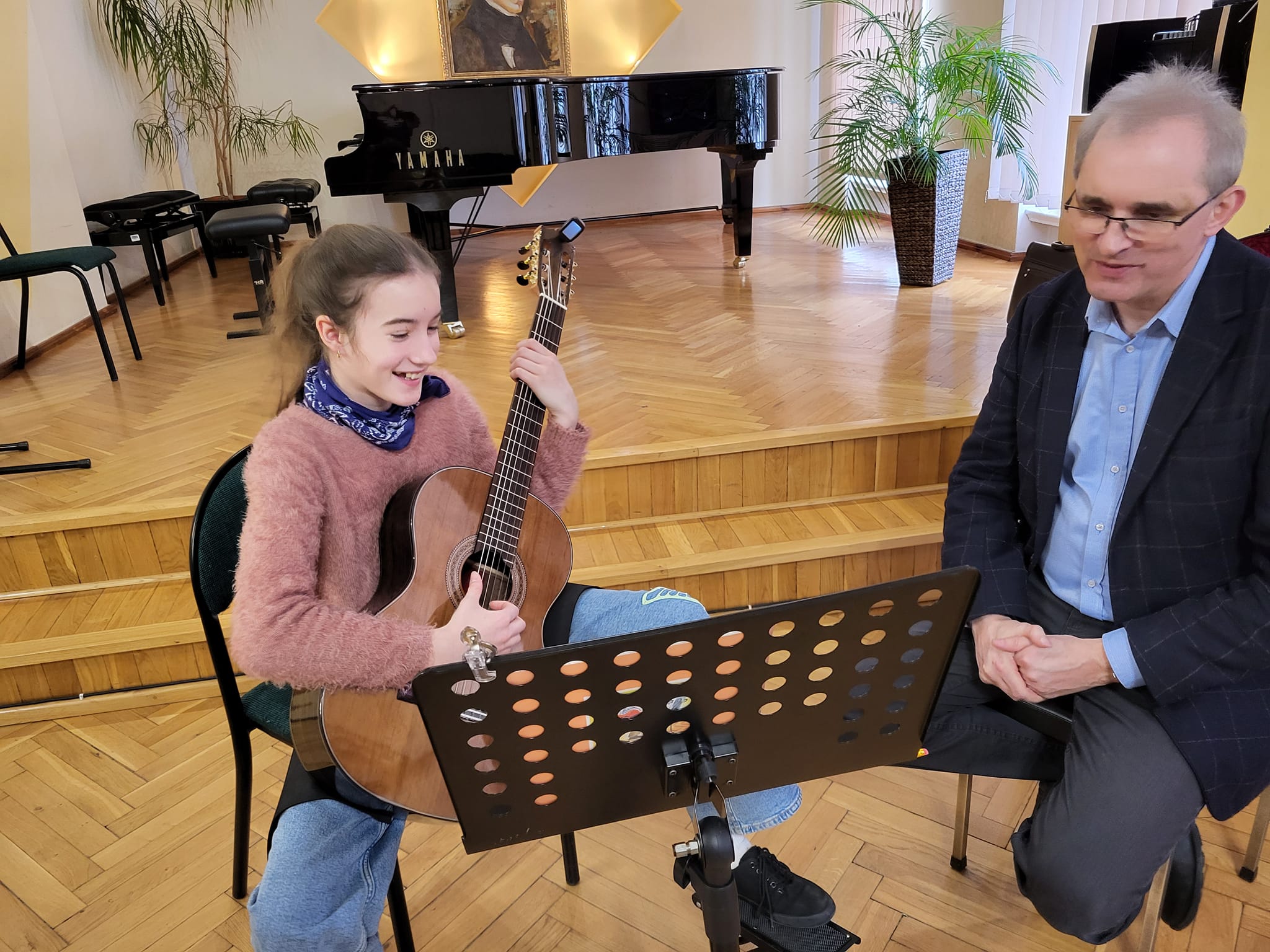 Najpierw wszyscy uczniowie klasy gitary wraz z rodzicami i nauczycielami gry na gitarze, wysłuchali ciekawej prelekcji o zasadach prawidłowego ćwiczenia na instrumencie w domu. Następnie wybrani soliści oraz zespół kameralny, pracowali pod okiem p. Wieczorka w ramach otwartych lekcji (pozostali uczniowie mogli obserwować zajęcia jako uczestnicy bierni). To był bardzo inspirujący gitarowy dzień w naszej szkole!