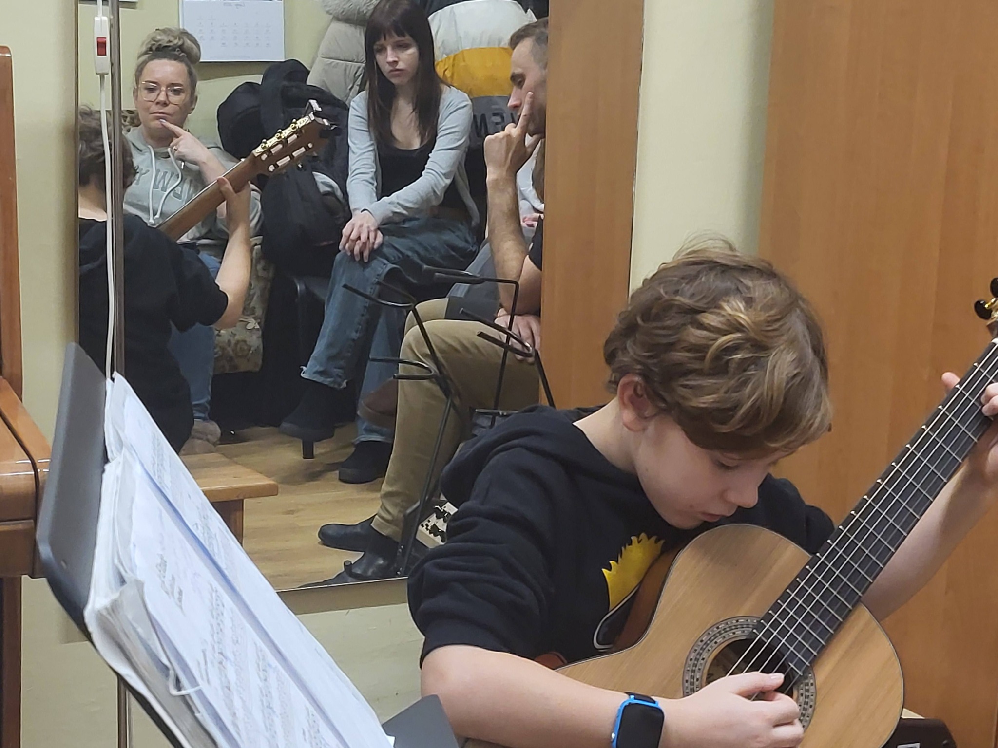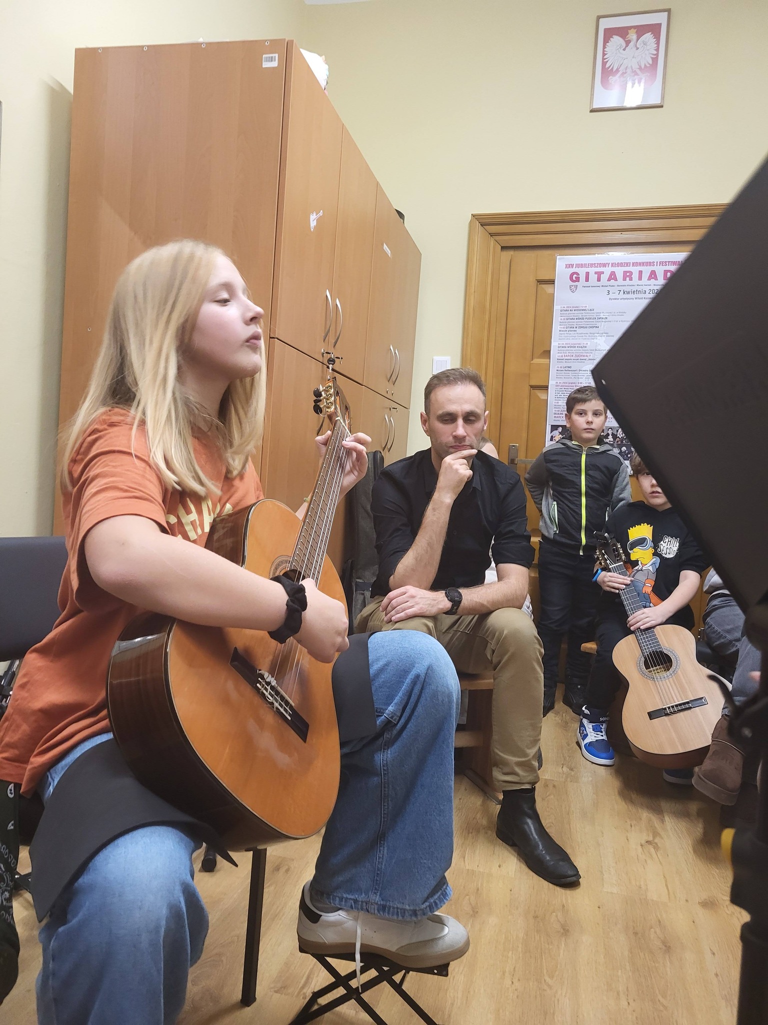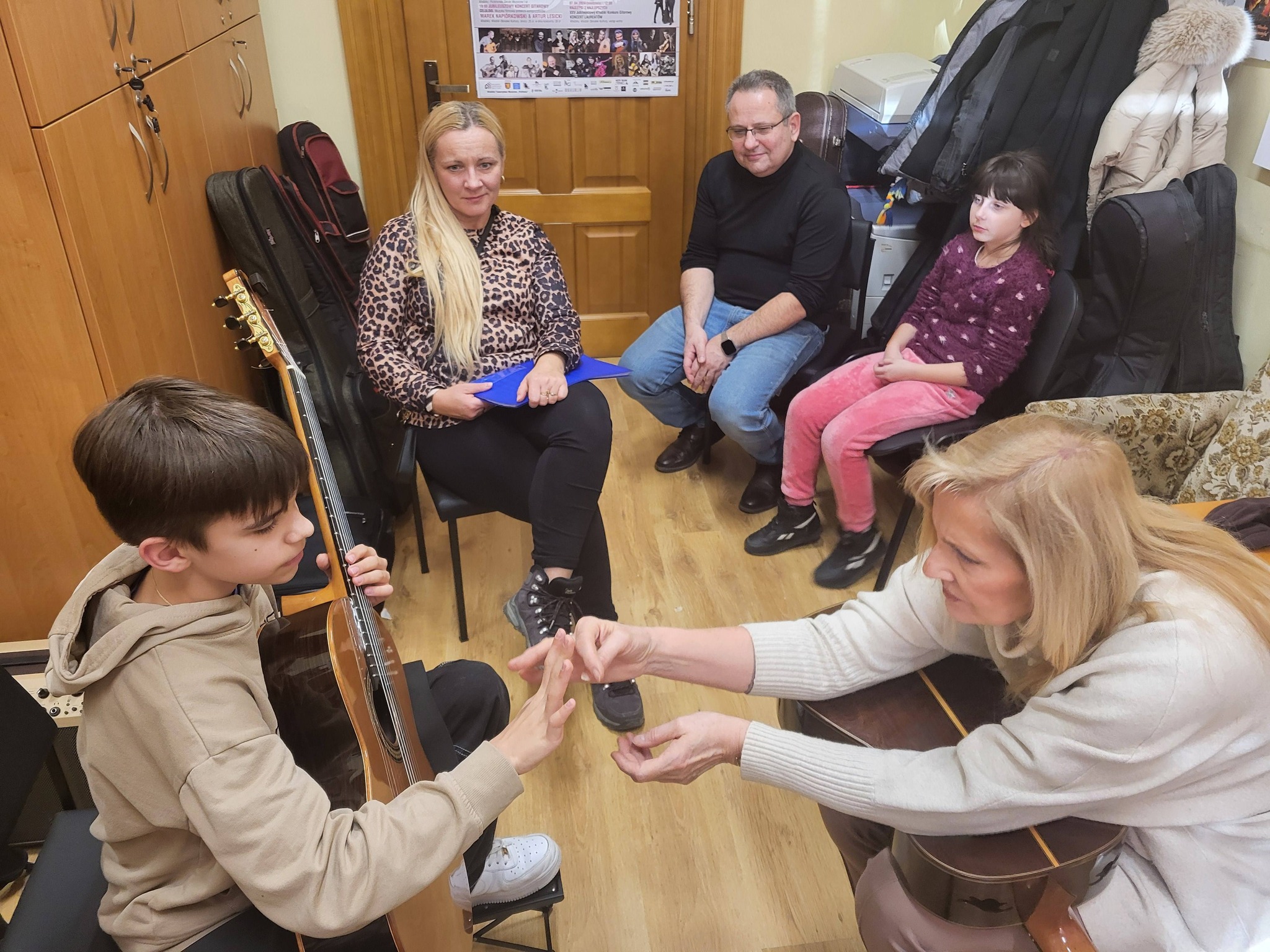 Jako czynni uczestnicy wzięli w nich udział uczniowie z klasy Agnieszki Kozakowskiej (Wiktoria i Emilian) oraz z klasy Dominik Mas (Zofia i Wiktor). Pozostali uczniowie-gitarzyści uczestniczyli jako obserwatorzy. Pani Palacz szczególną uwagę zwróciła na ułożenie rąk czyli tzw. "aparat gry" oraz udzieliła wiele cennych uwag jak należy ćwiczyć w domu. Pomogła też w realizacji interpretacji utworów. Dziękujemy Pani Profesor za bardzo interesujące, sympatyczne i empatyczne zajęcia, oraz gratulujemy wszystkim uczniom zaangażowania i pracowitości!