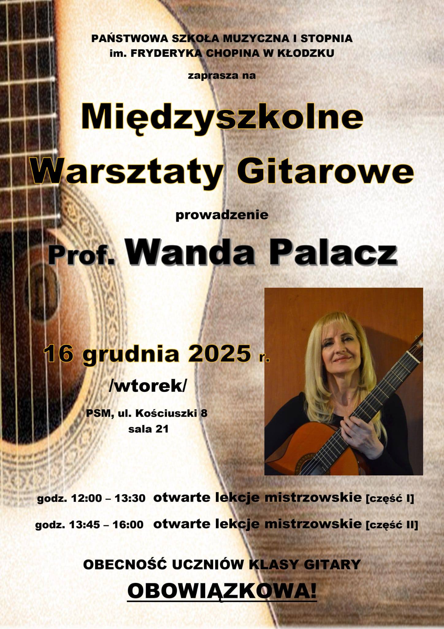 16.12.2025 r. w naszej szkole odbyły się Międzyszkolne Warsztaty Gitarowe, które poprowadziła p. prof. Wanda Palacz z Akademii Muzycznej w Katowicach.
