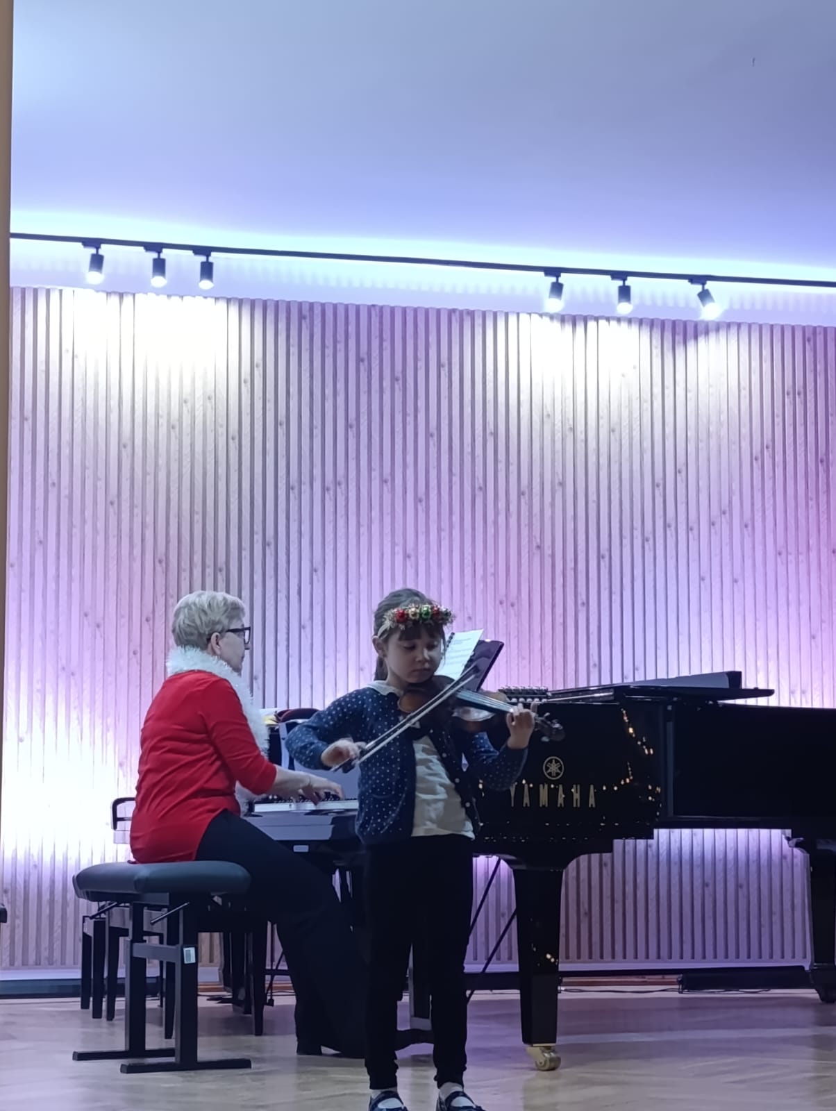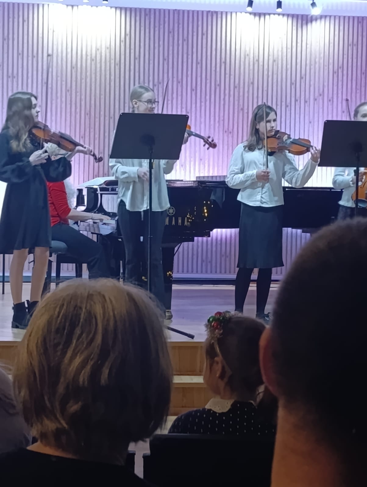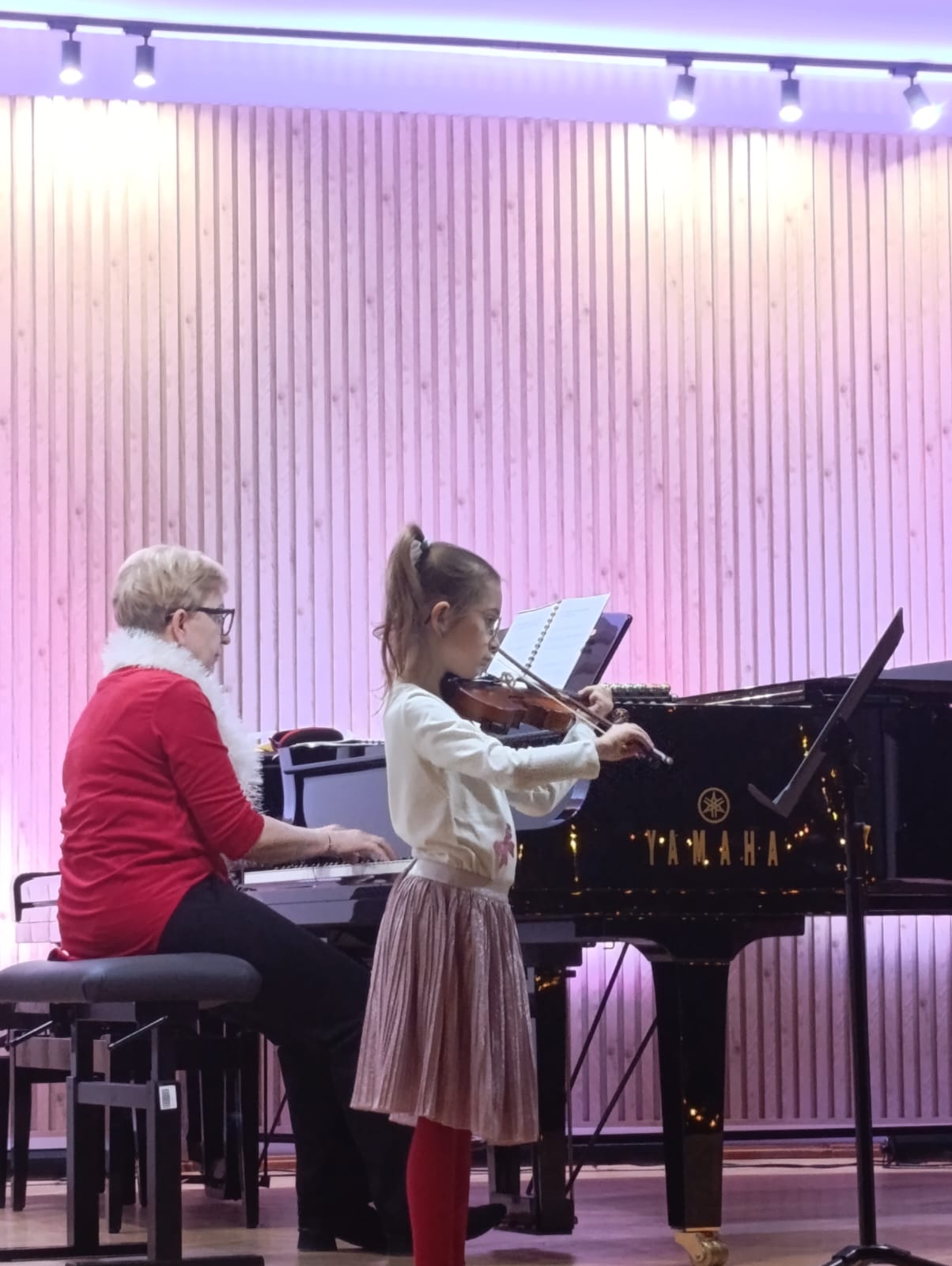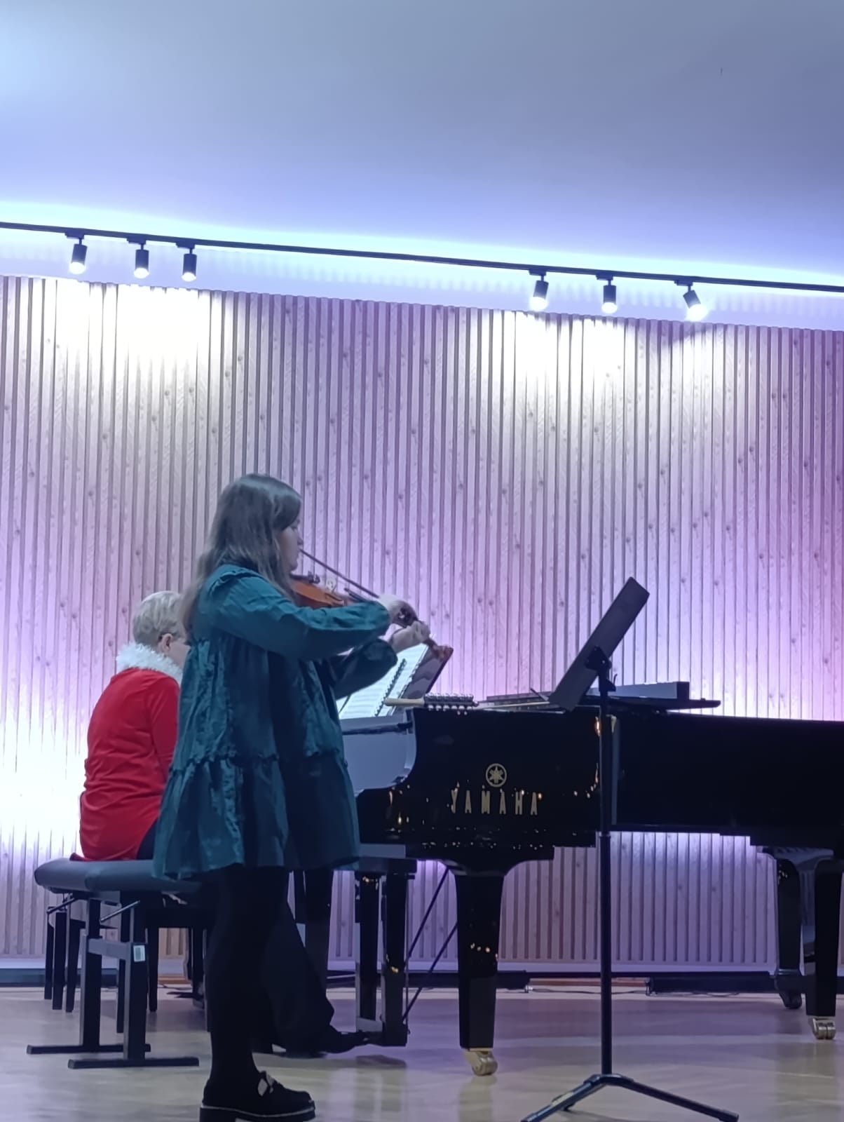 Wystąpili pięknie wszyscy uczniowie klasy skrzypiec Krystyny Ślęzak, solo i w zespołach z kolędowym repertuarem, a przy fortepianie towarzyszyła im pani Elżbieta Malinowska.