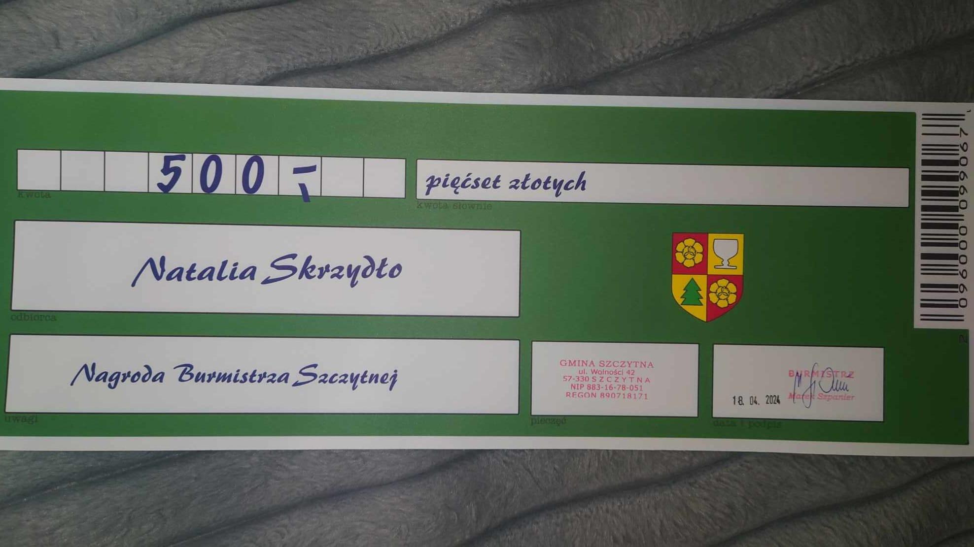 18 kwietnia br. nasza uczennica Natalia SKRZYDŁO, z klasy gitary Witolda Kozakowskiego, otrzymała od Marka Szpaniera, Burmistrza Miasta Szczytna, nagrodę za osiągnięcia artystyczne w roku szkolnym 2022/2023.