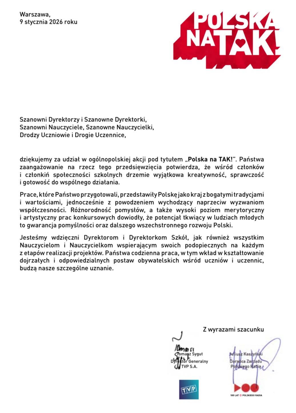 Jest nam niezmiernie miło poinformować, że Samorząd Uczniowski z naszej szkoły wziął udział w ogólnopolskiej akcji pt. "Polska na Tak". Poniżej treść listu z podziękowaniem za udział w tym ważnym wydarzeniu.