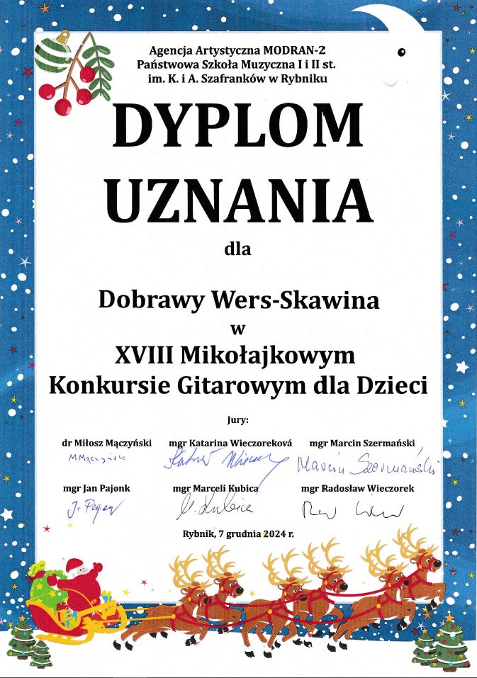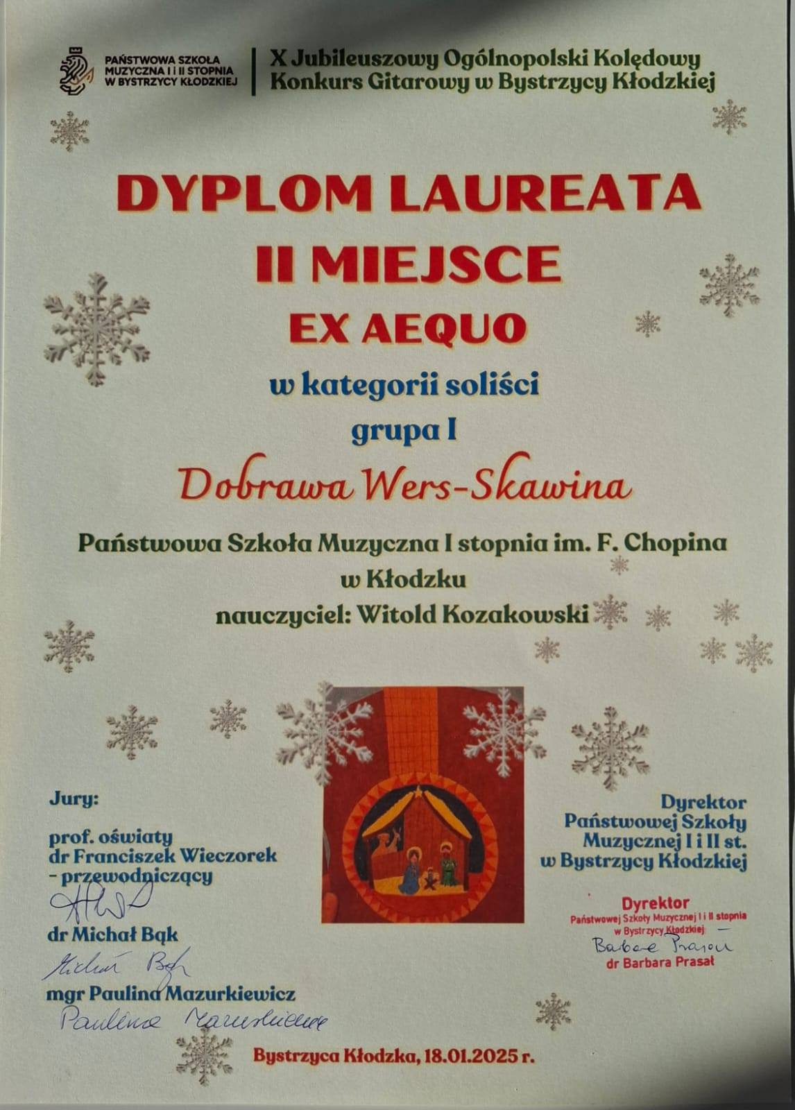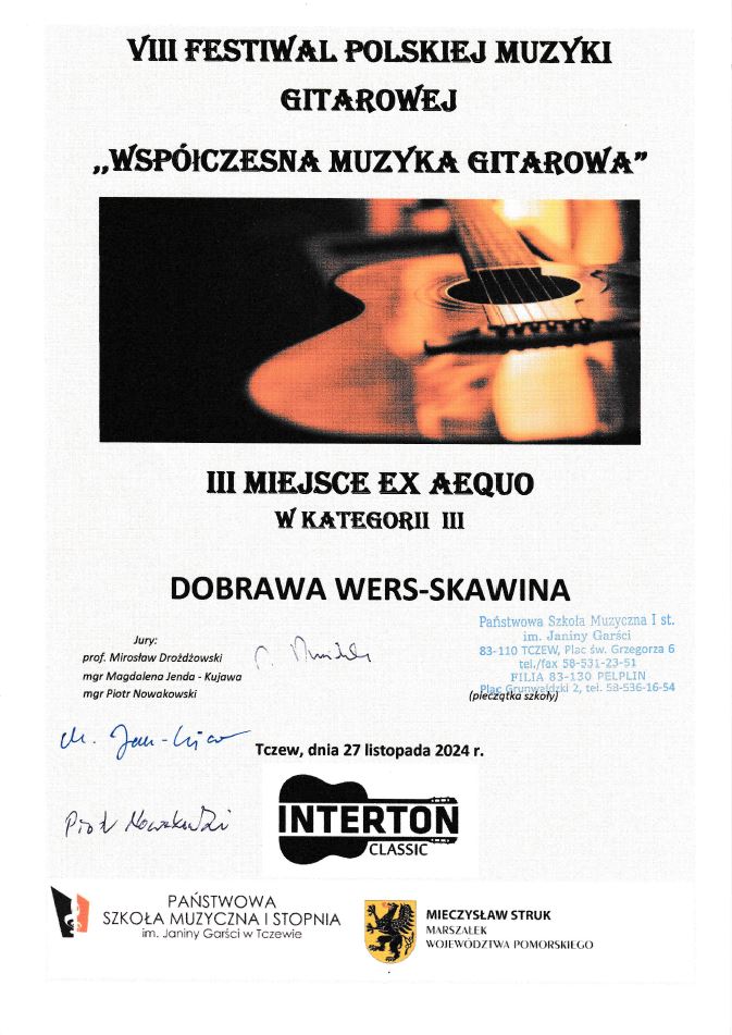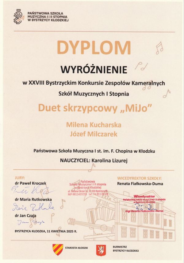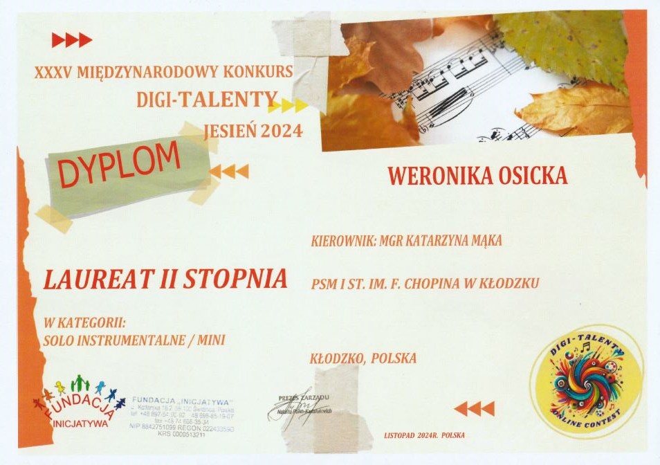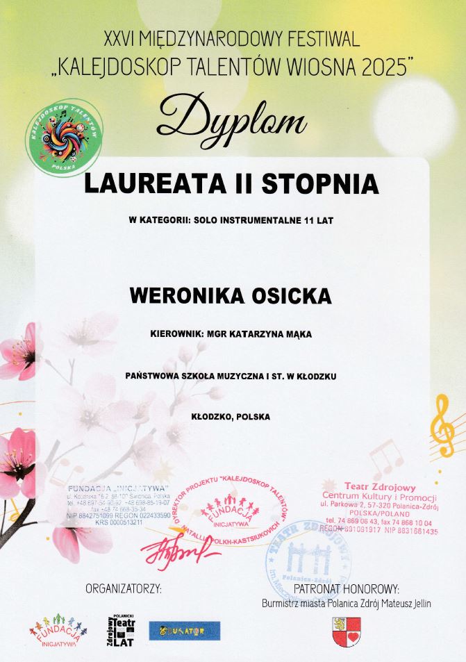 - Weronika Osicka - dyplom laureata II stopnia w kat. solo instrumentalne/mini - naucz. Katarzyna Mąka-Żelazko