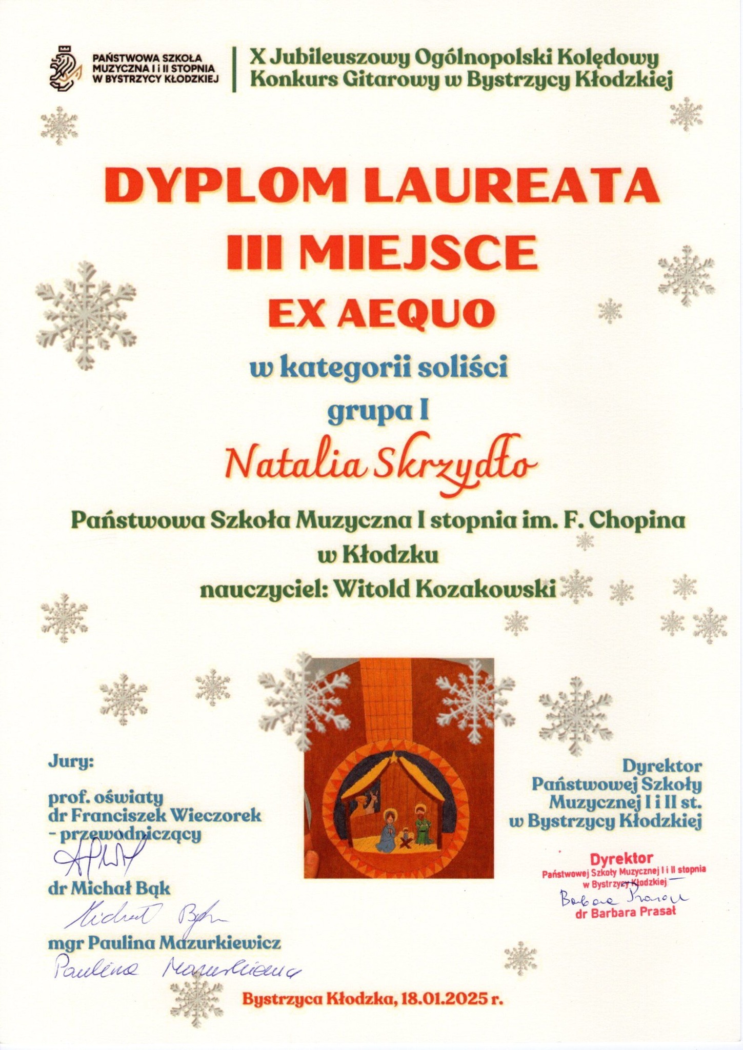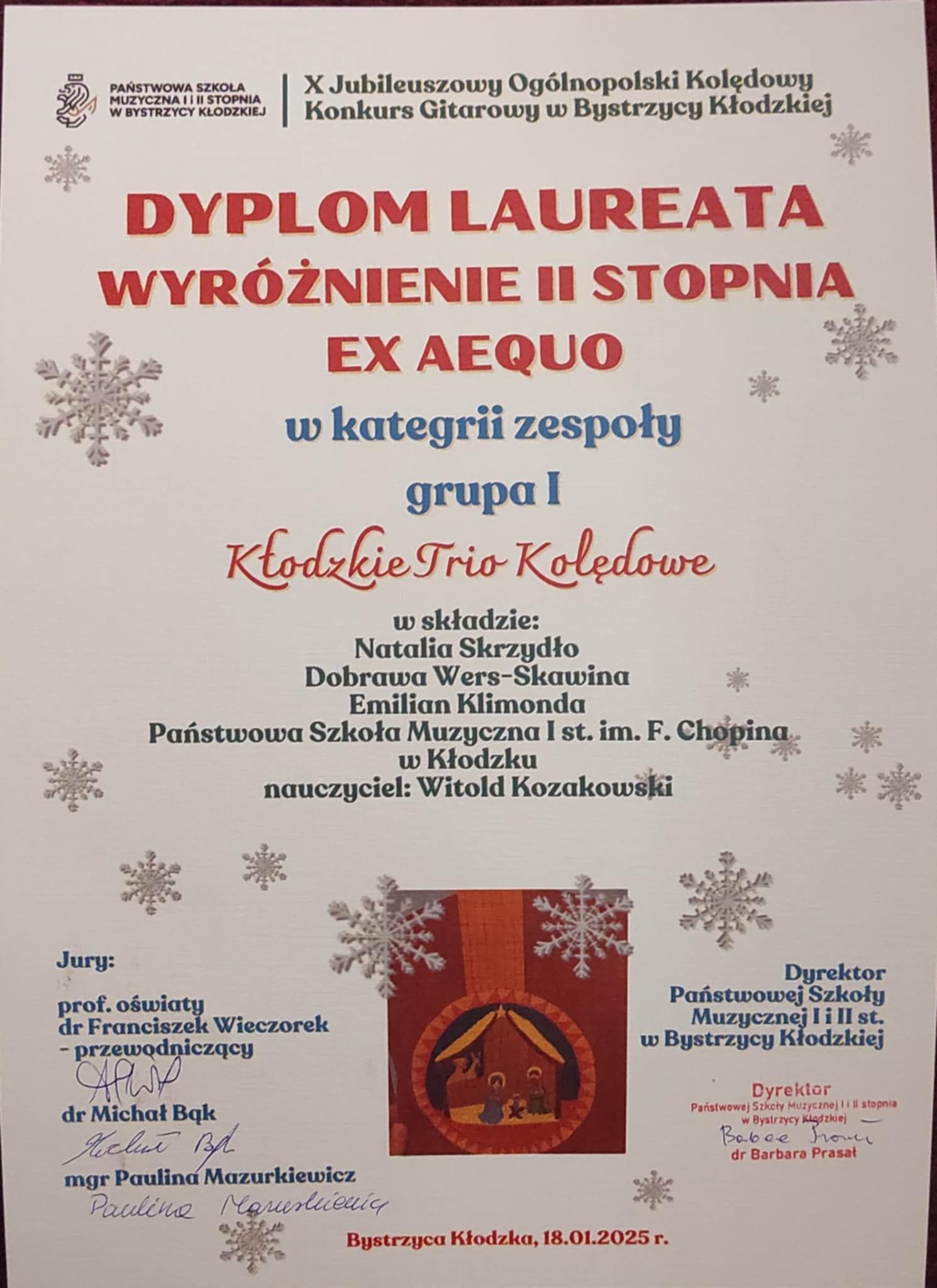 - Kłodzkie Trio Kolędowe (Natalia Skrzydło, Dobrawa Wers-Skawina, Emilian Klimonda) - wyróżnienie II stopnia ex aequo, kat. zespoły grupa I - naucz. Witold Kozakowski