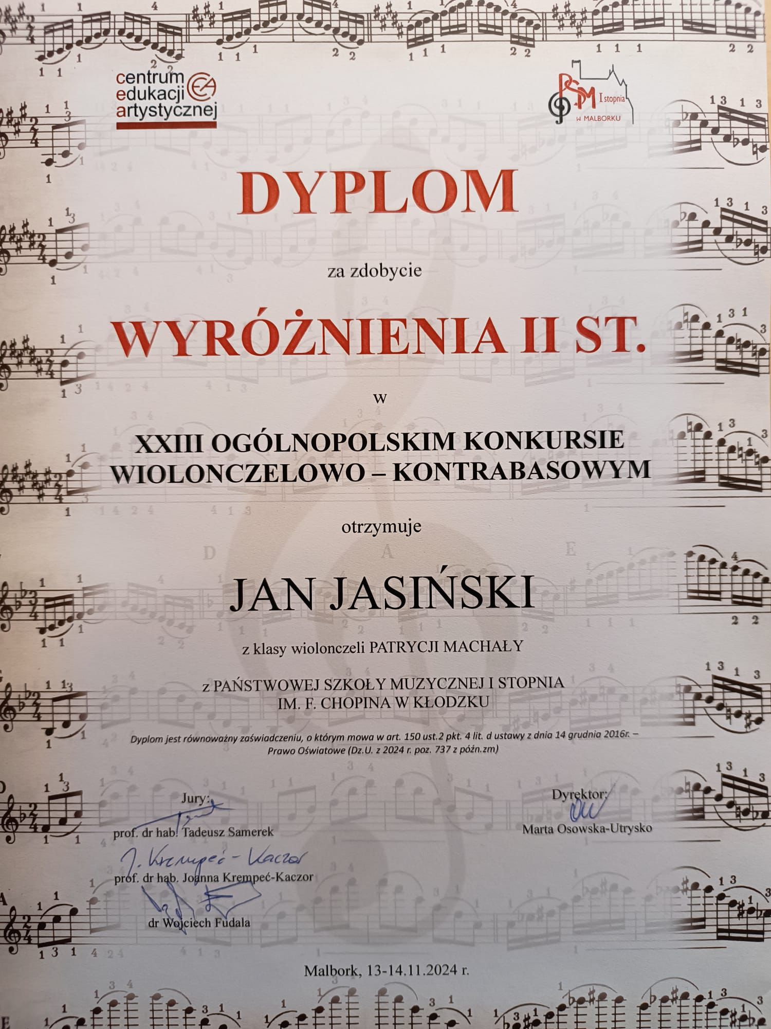 XXIII Ogólnopolski Konkurs Wiolonczelowo - Kontrabasowy w Malborku 13-14.11.2024 r.