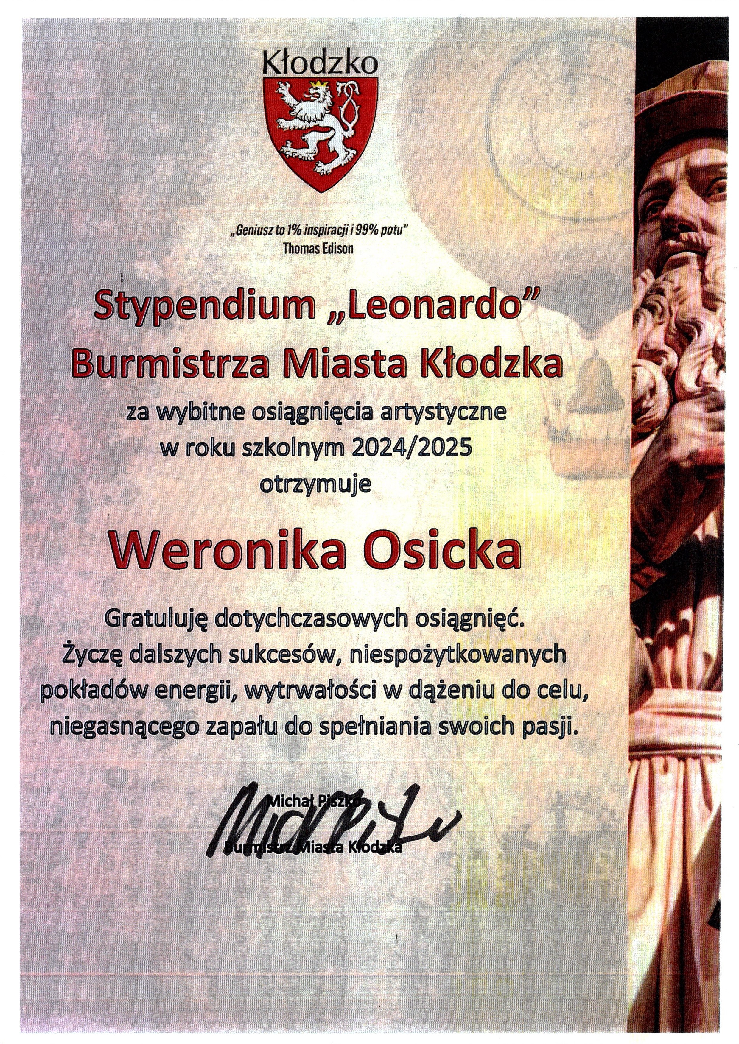Stypendium "Leonardo" Burmistrza Miasta Kłodzka za wybitne osiągnięcia artystyczne w roku szkolnym 2024-2025