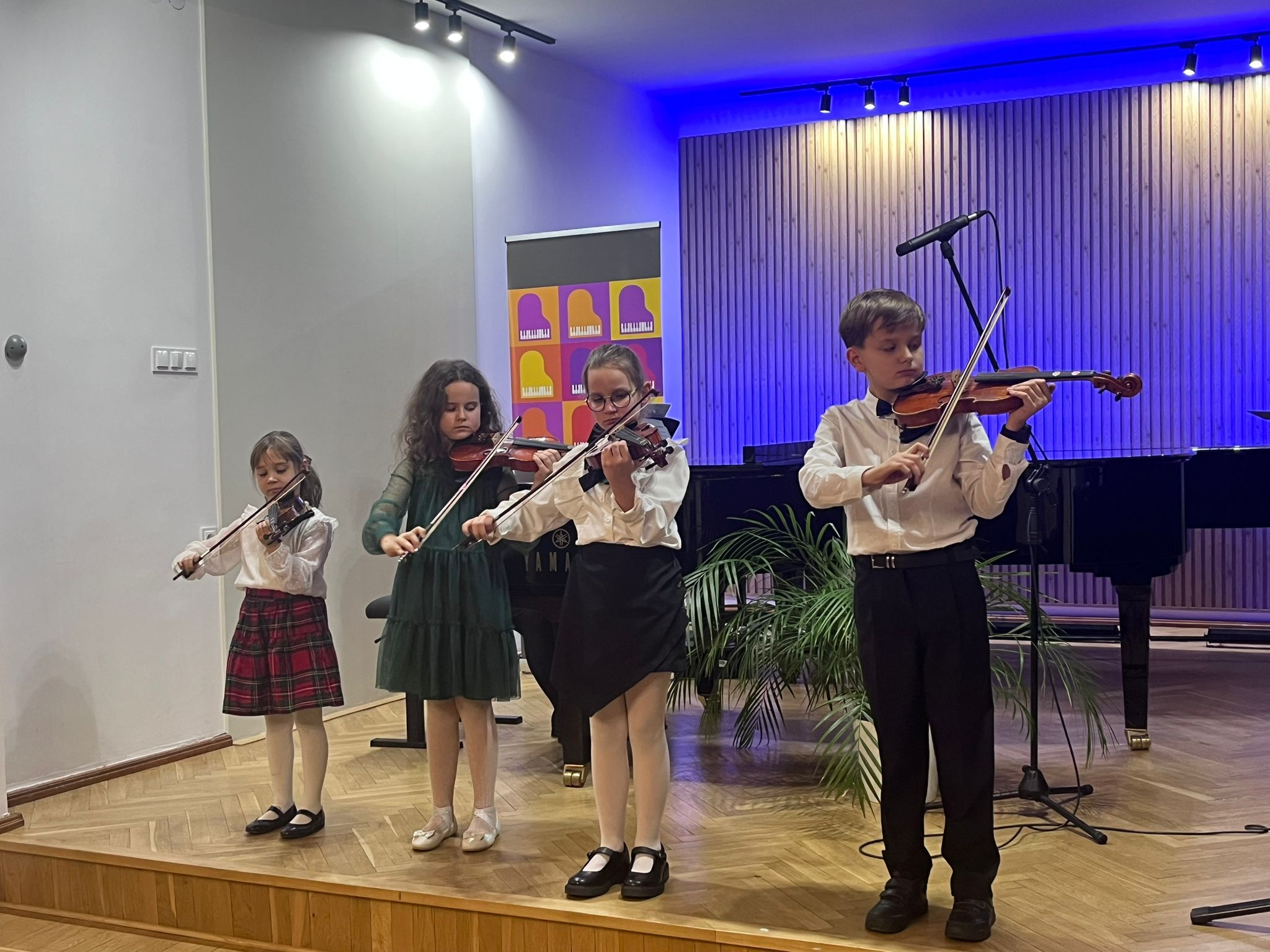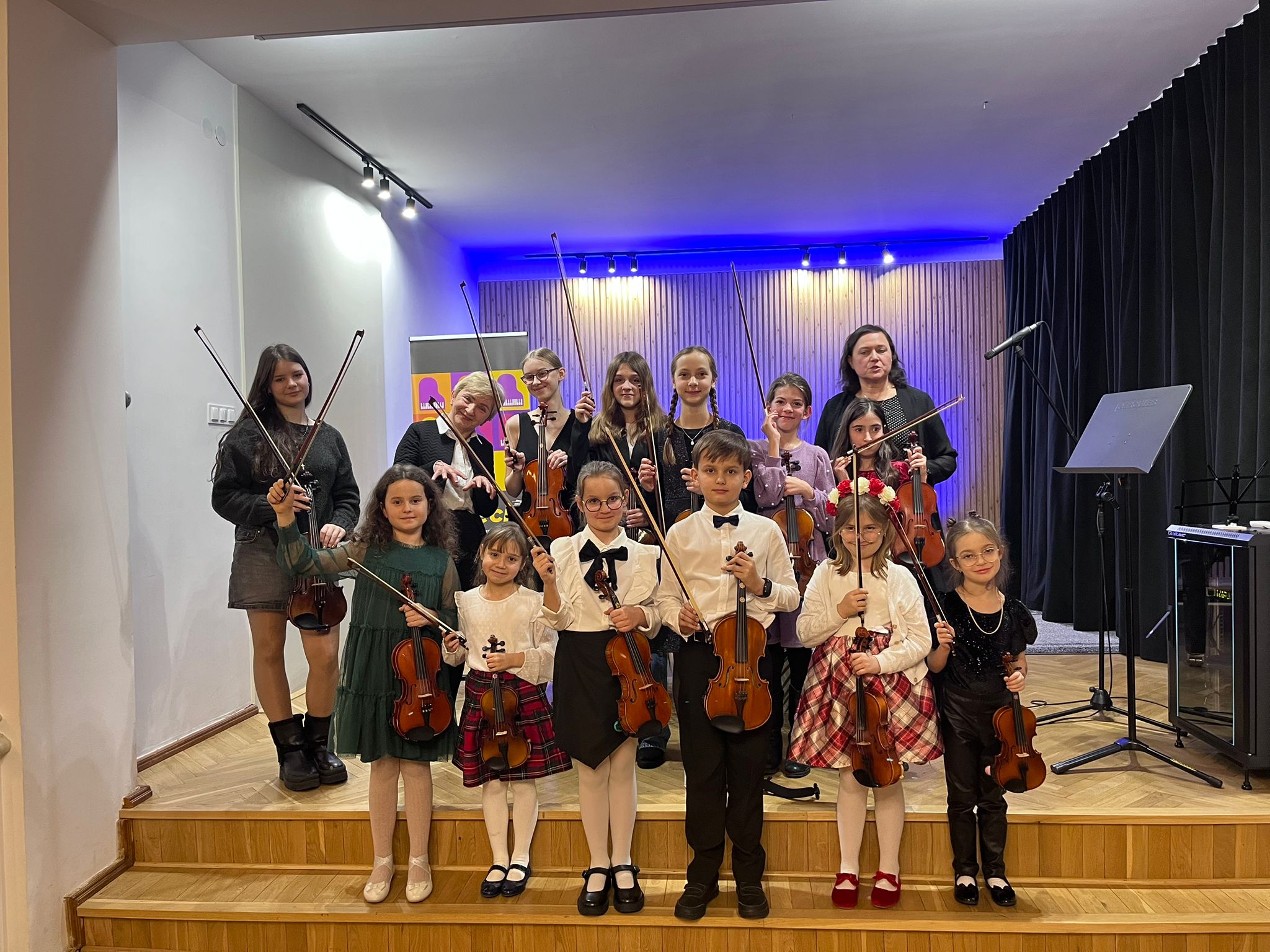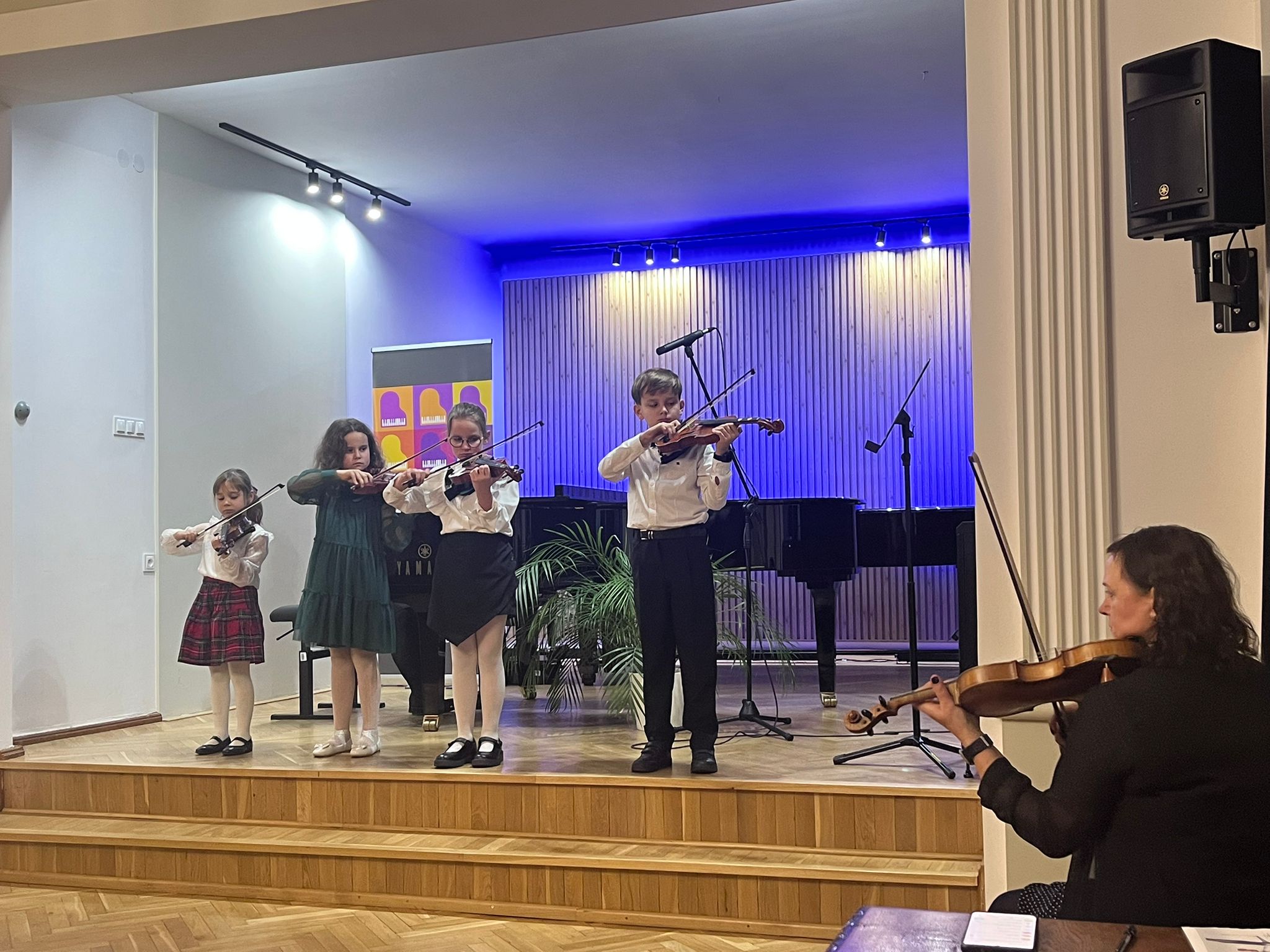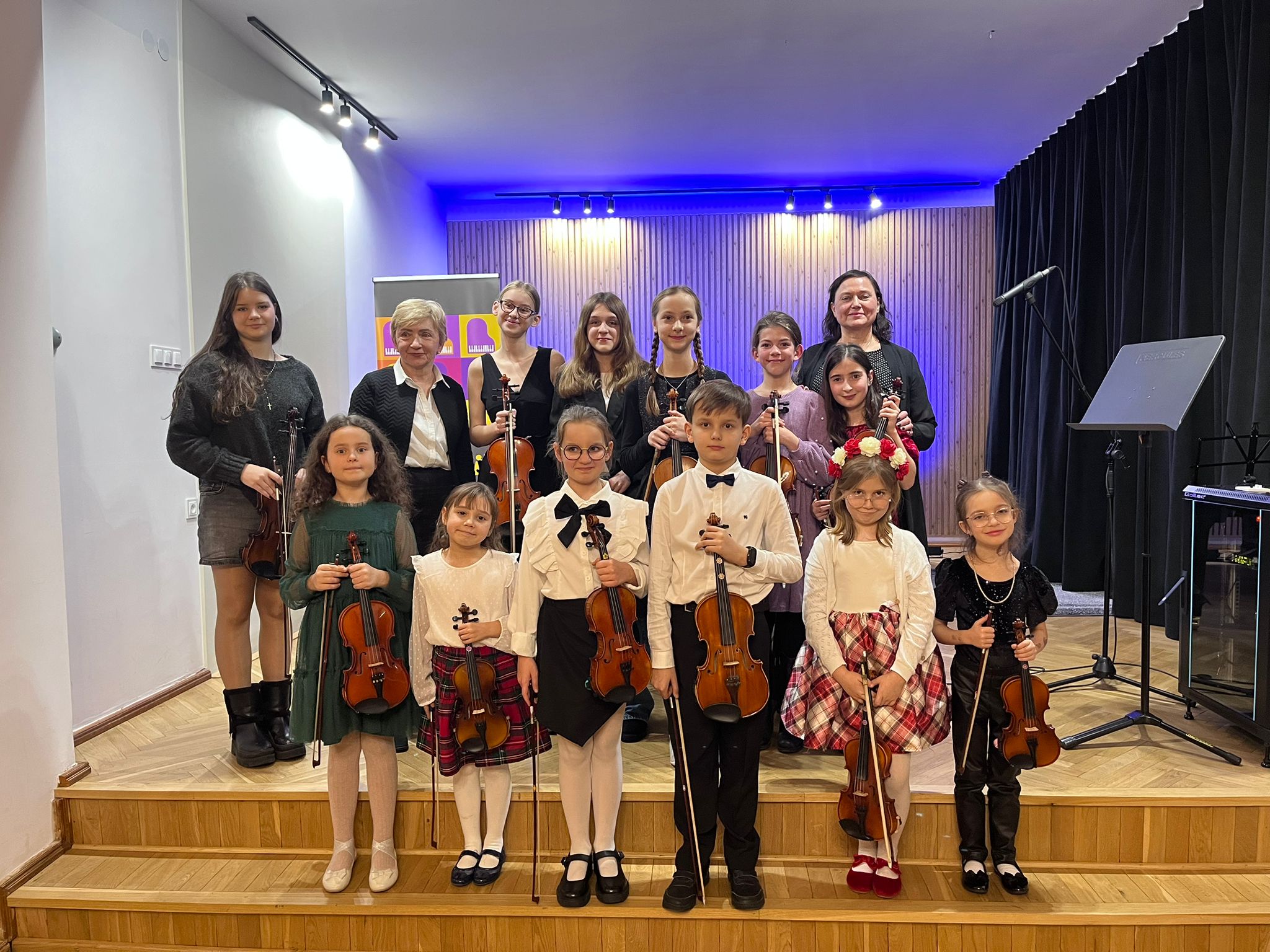 W poniedziałek 1 grudnia 2025 r. podczas koncertu swoje umiejętności prezentowali uczniowie z klasy skrzypiec pani Krystyny Ślęzak.